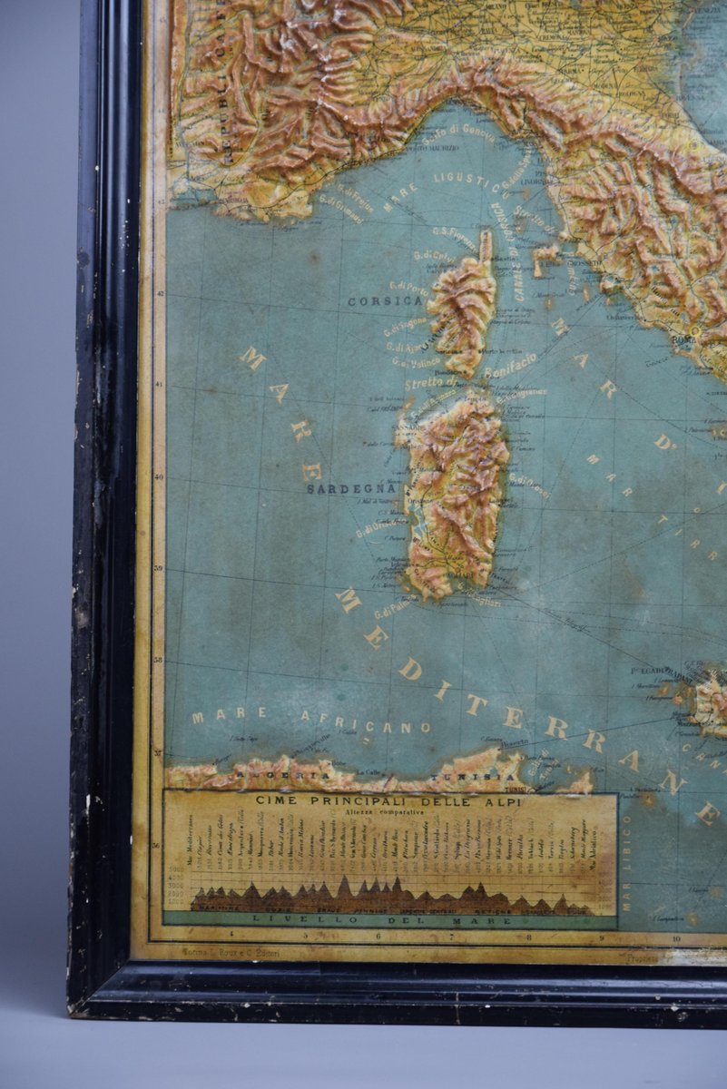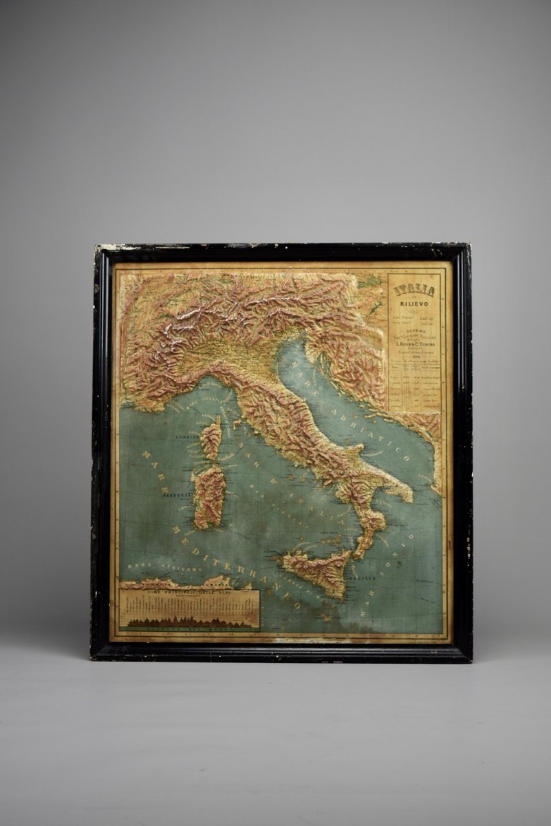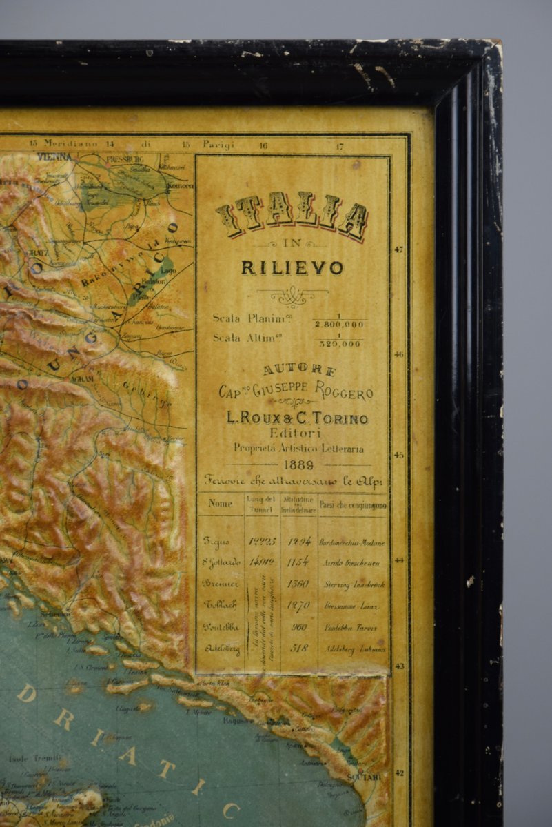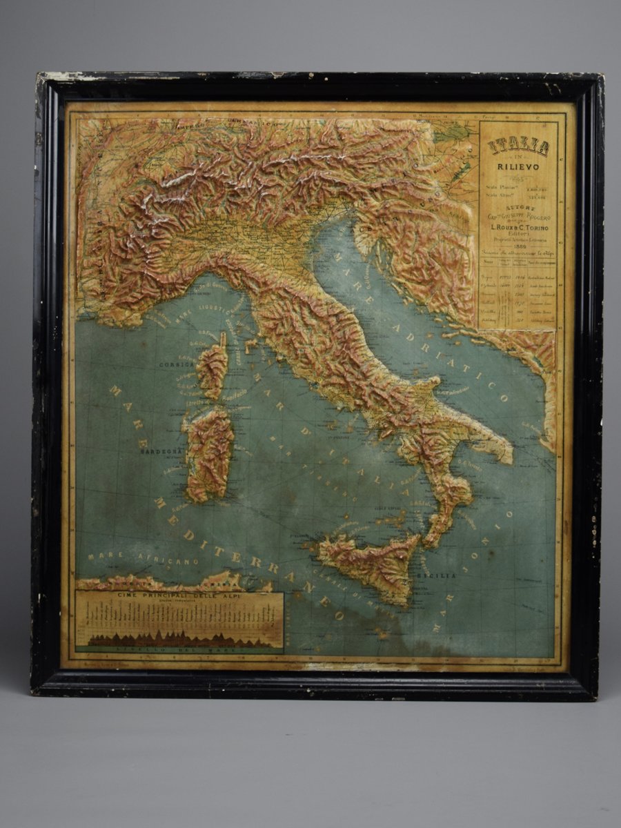 Introducing a true gem for collectors and history enthusiasts alike: this rare 1889 *"Italia in Rilievo"* map by L. Roux & Co. from Torino, a masterpiece of craftsmanship and cartography. Measuring 54 x 59 cm / 21.259 x 23.228 inches, this embossed map showcases Italy’s topography in stunning 3D relief, allowing you to feel the mountainous terrain of the Alps and the rolling hills of the peninsula.