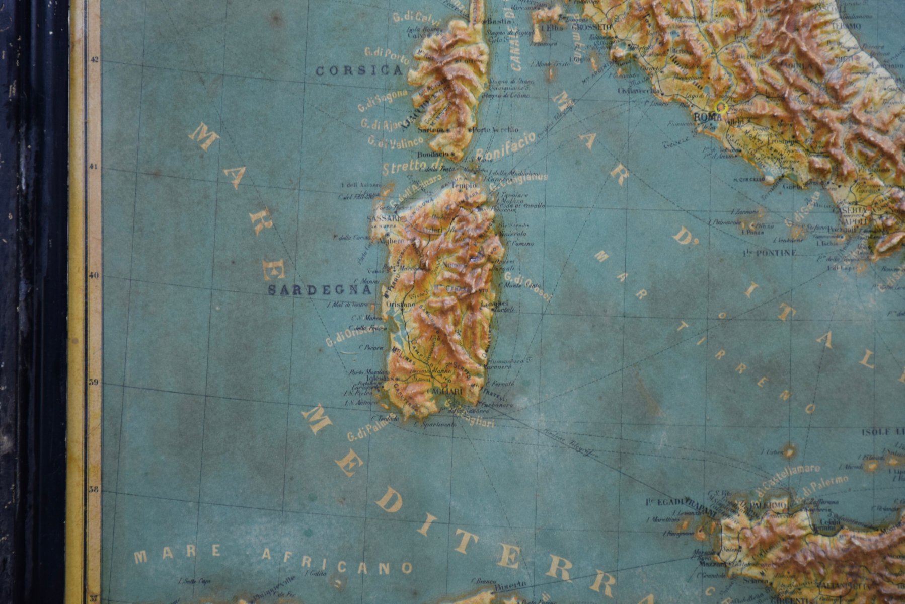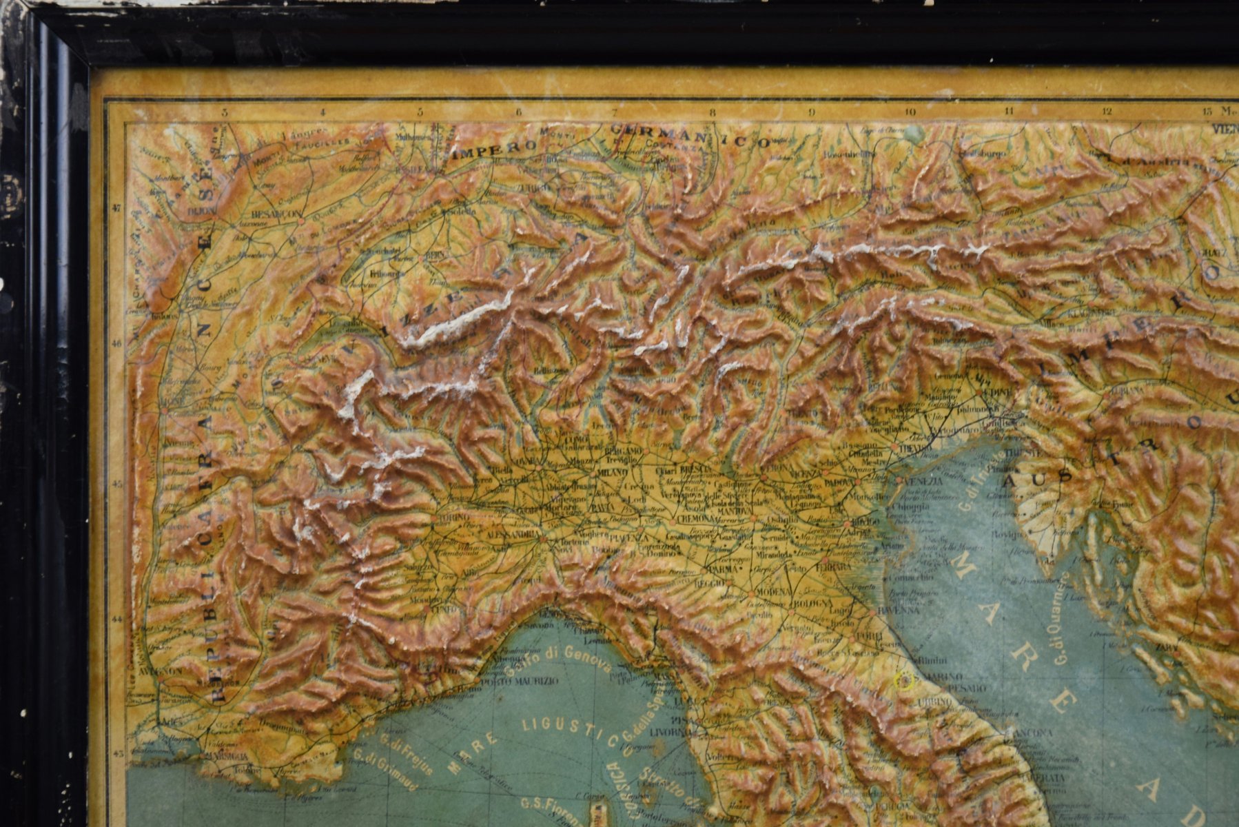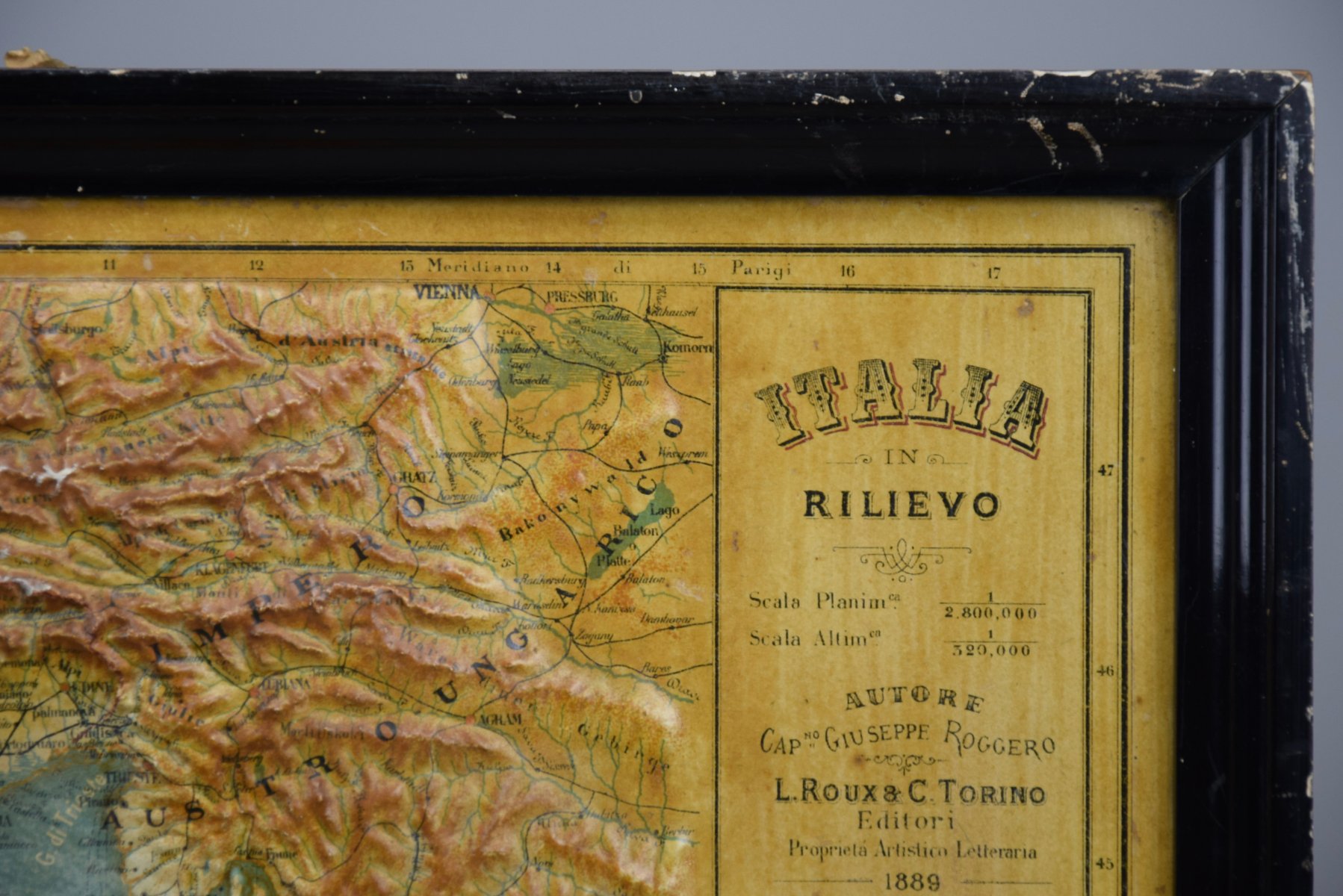 Introducing a true gem for collectors and history enthusiasts alike: this rare 1889 *"Italia in Rilievo"* map by L. Roux & Co. from Torino, a masterpiece of craftsmanship and cartography. Measuring 54 x 59 cm / 21.259 x 23.228 inches, this embossed map showcases Italy’s topography in stunning 3D relief, allowing you to feel the mountainous terrain of the Alps and the rolling hills of the peninsula.