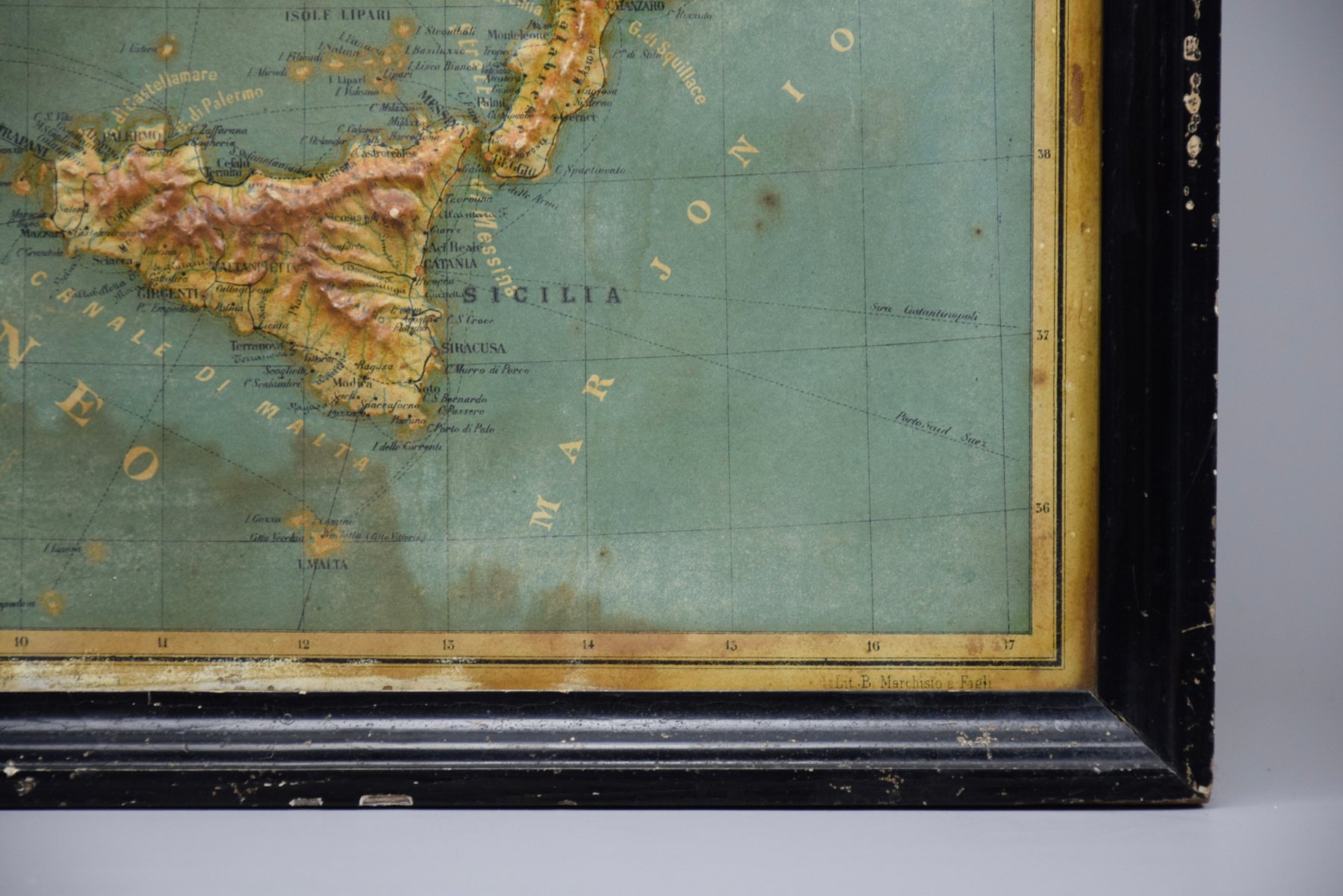 What sets this map apart is its meticulous detailing, from the intricately embossed geographical features to the highlighted railways that crossed the Alps—a symbol of Italy’s industrial and cultural expansion during the late 19th century. Created by the renowned lithographers *Lit. B. Marchisio e Figli*, the map is not just an educational piece but also an artistic triumph.