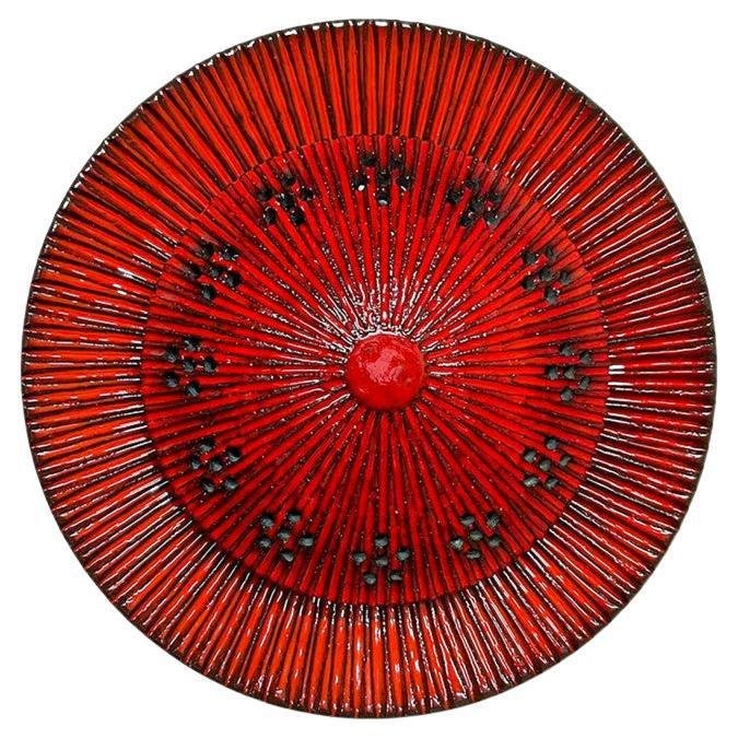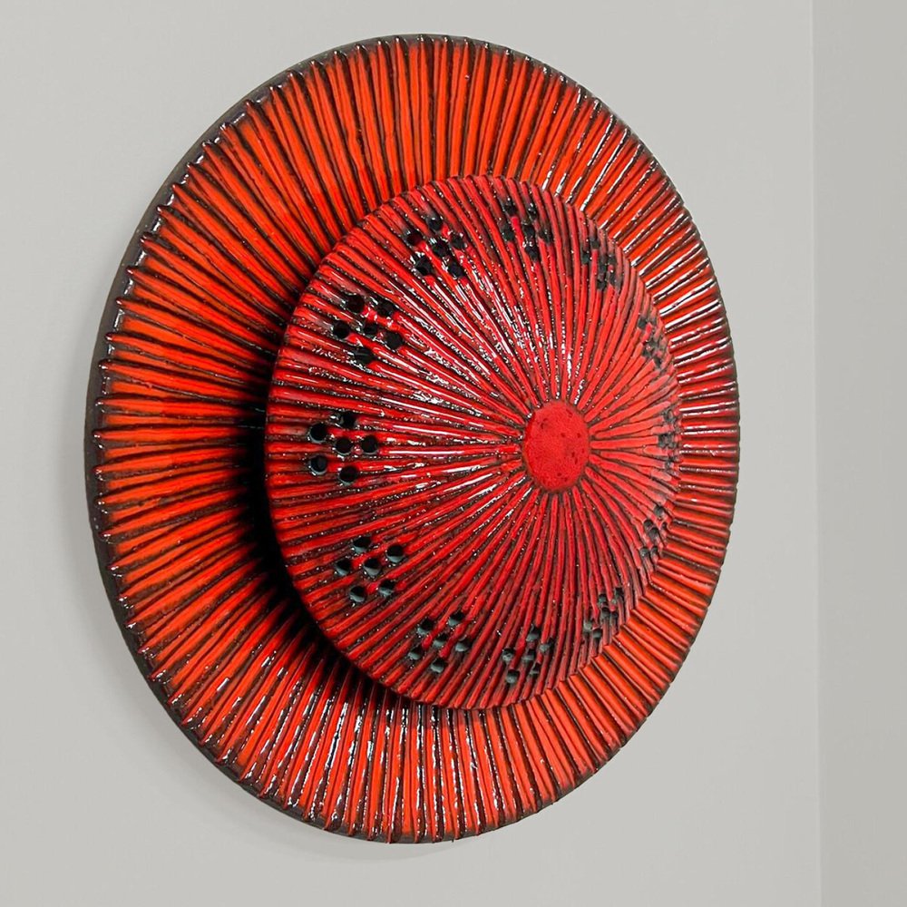 Spectacular red circular ceramic wall lights , with beautiful black accents. Manufactured in Denmark in the 1970s. A unique statement piece. Labelled and signed by Axella, in excellent condition. Axella was found in the 70s in Denmark by Aksel Larsen, who later changed his name to Axella Keramik. The company, which produced impeccable, classic 1970's style lamps, closed in 1987. The designer Jette Hellerøe worked for a short period in collaboration with Axella. Dimensions: Height: 3.54" (9 cm) Diameter: 15.75" (40 cm) This light requires one E27 light bulb.
