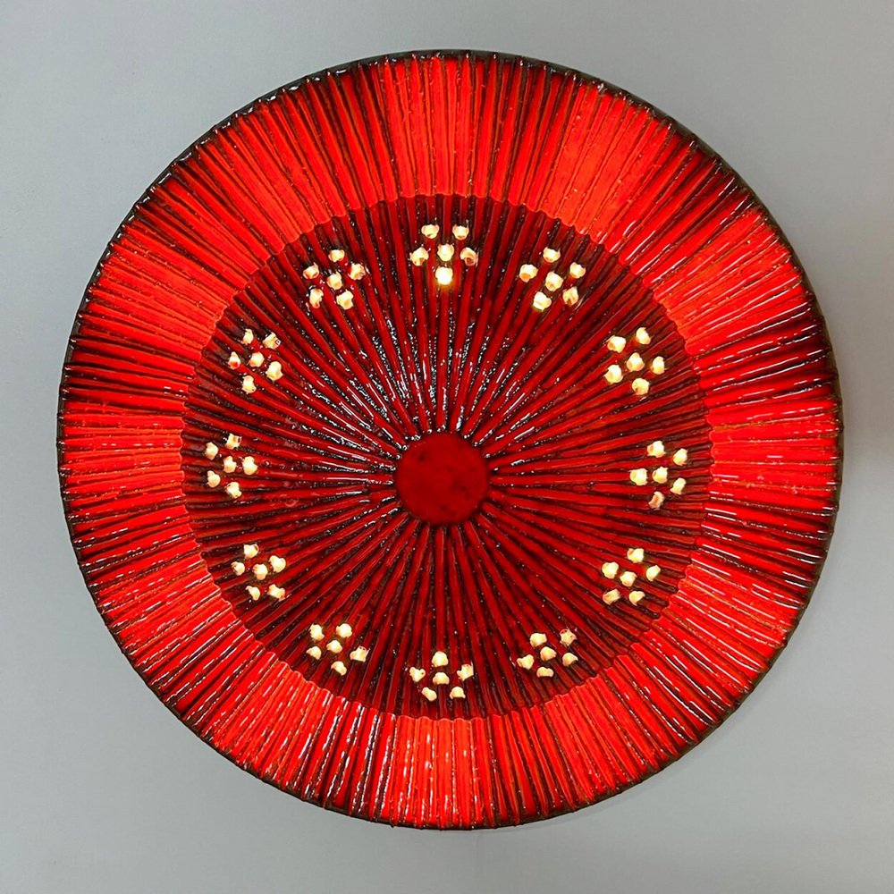 Spectaculaires appliques circulaires en céramique rouge, avec de magnifiques accents noirs. Fabriquées au Danemark dans les années 1970. Une pièce unique. Étiquetée et signée par Axella, en excellent état. Axella a été fondée dans les années 70 au Danemark par Aksel Larsen, qui a ensuite changé son nom en Axella Keramik. L'entreprise, qui produisait d'impeccables lampes de style classique des années 1970, a fermé ses portes en 1987. La designer Jette Hellerøe a travaillé pendant une courte période en collaboration avec Axella. Dimensions de la lampe : Hauteur : 9 cm Diamètre : 40 cm Cette lampe nécessite une ampoule E27.