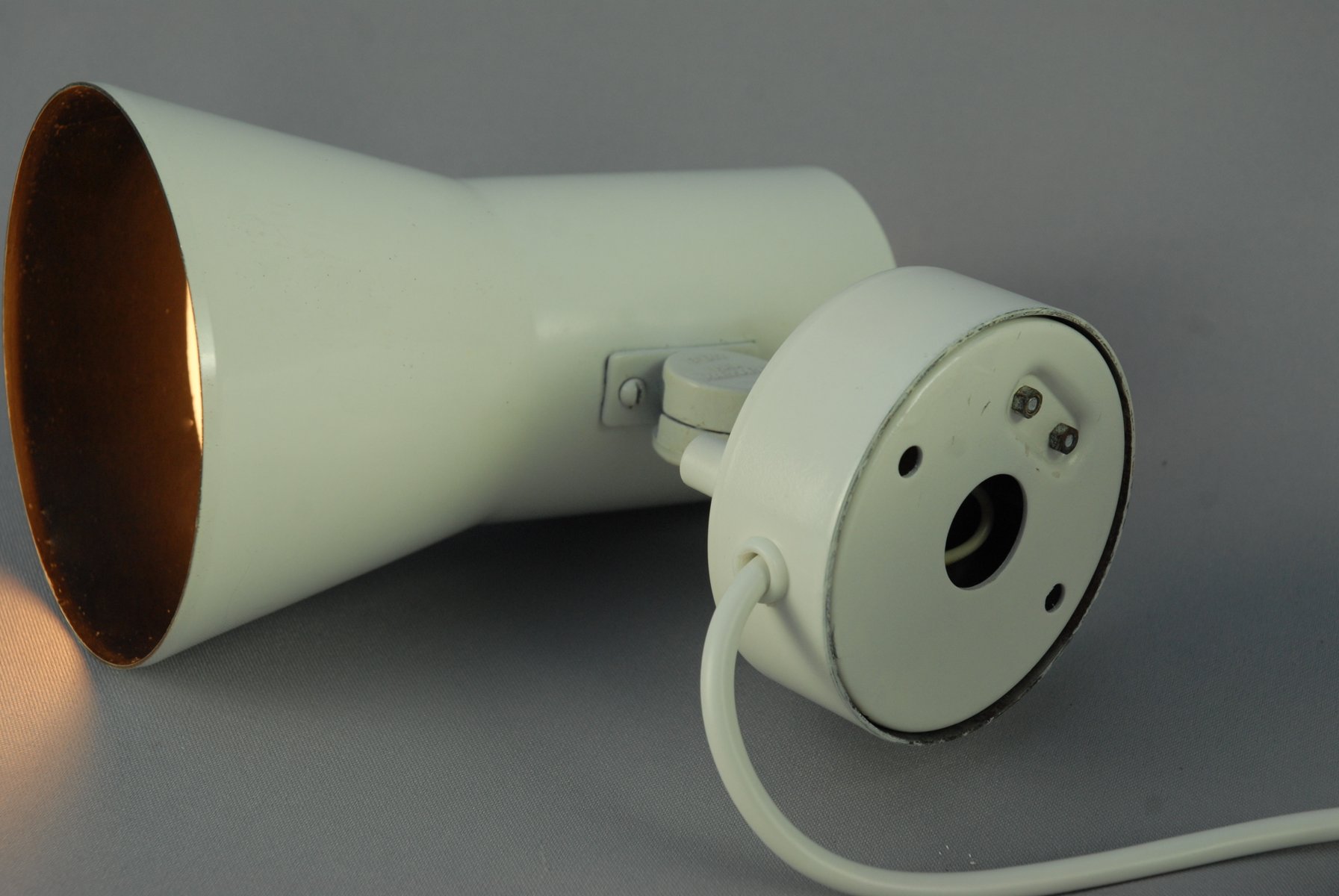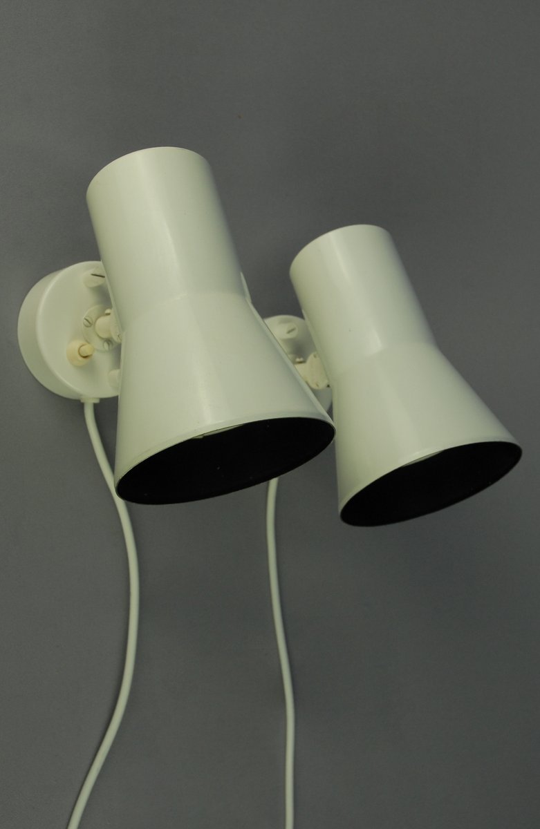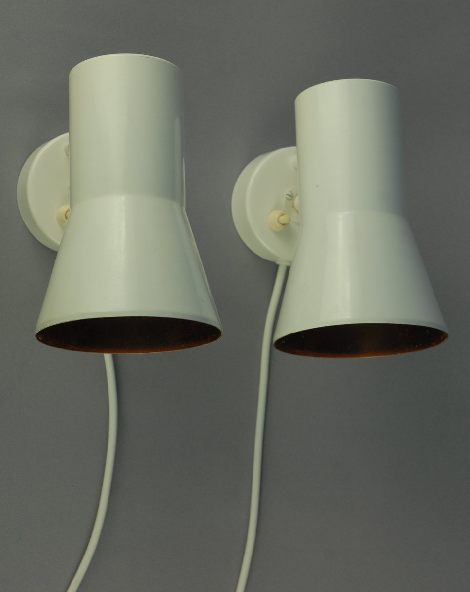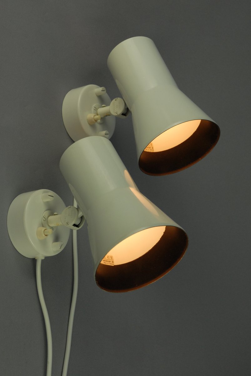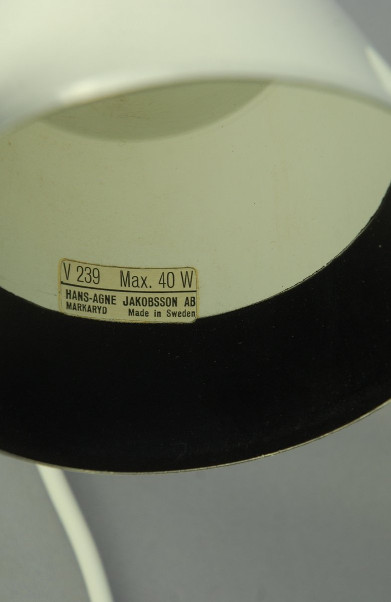 These Model V-239 lamps exemplify Jakobsson’s mastery of creating warm, diffused light through simple, sculptural forms. The white lacquered metal shades emit a soft and atmospheric glow, typical of his refined Scandinavian modern aesthetic.