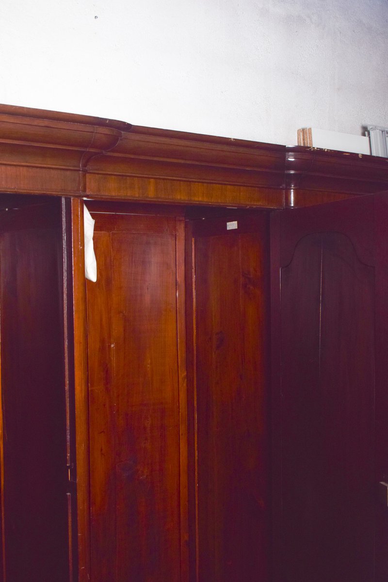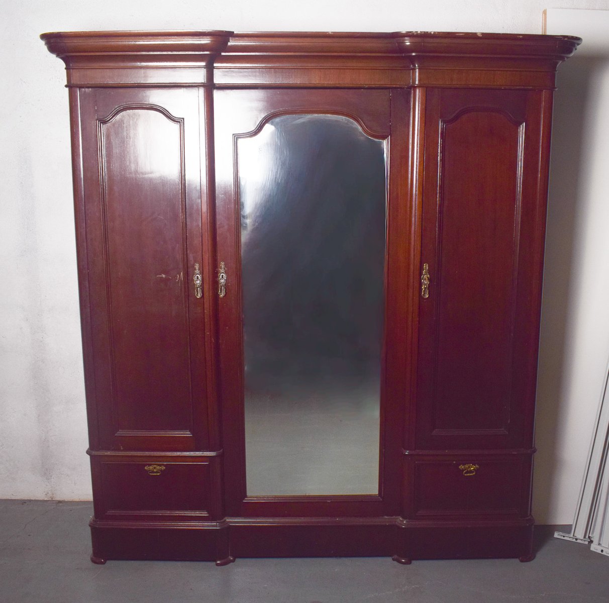 This English Romantic wardrobe, crafted in rich mahogany, is a fine example of elegance and practicality combined. Its design features a large central door fitted with a tall mirror, flanked by two smaller side doors, each complemented by a square drawer at the bottom. The discreet metal handles maintain a refined and understated look, allowing the natural beauty of the mahogany grain to stand out. Inside, the wardrobe is divided into three independent compartments, one behind each door, offering well-organized storage tailored to different needs.