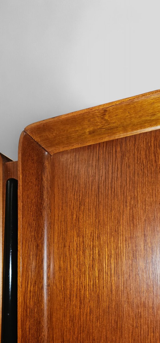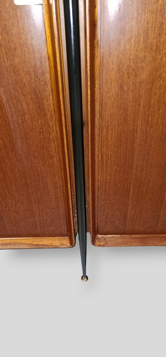 Wardrobe attributed to Silvio Cavatorta, this piece of furniture consists of interconnected vertical sections resting on slender black metal legs with brass tips. Made of teak, it features light brown grain and smooth surfaces. The clean, essential lines combined with rounded forms perfectly reflect the modernist movement of the mid-20th century.