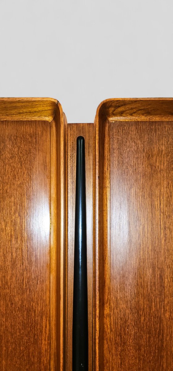 Armoire attribuée à Silvio Cavatorta, ce meuble se compose de sections verticales interconnectées reposant sur de minces pieds en métal noir avec des pointes en laiton. Réalisé en teck, il présente un grain brun clair et des surfaces lisses. Les lignes épurées et essentielles combinées à des formes arrondies reflètent parfaitement le mouvement moderniste du milieu du XXe siècle.