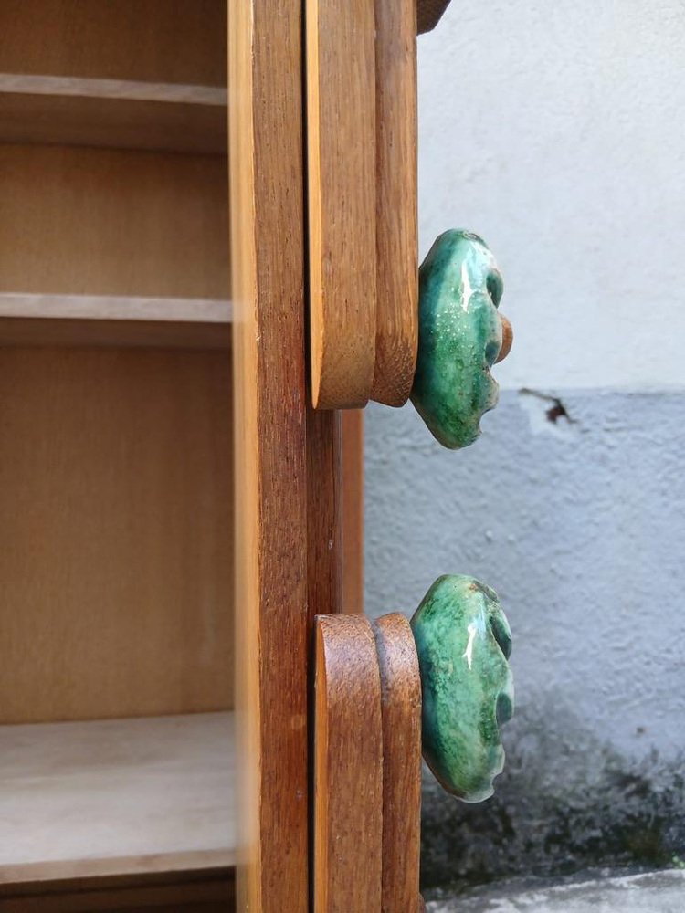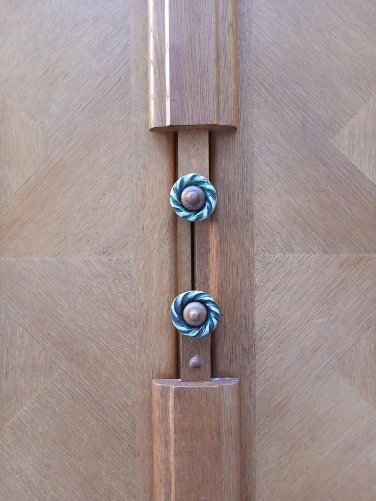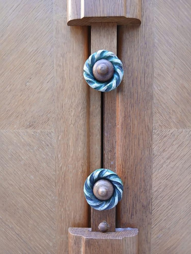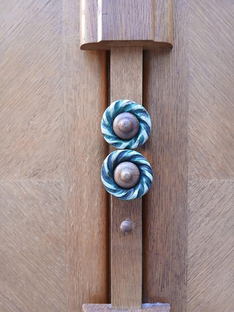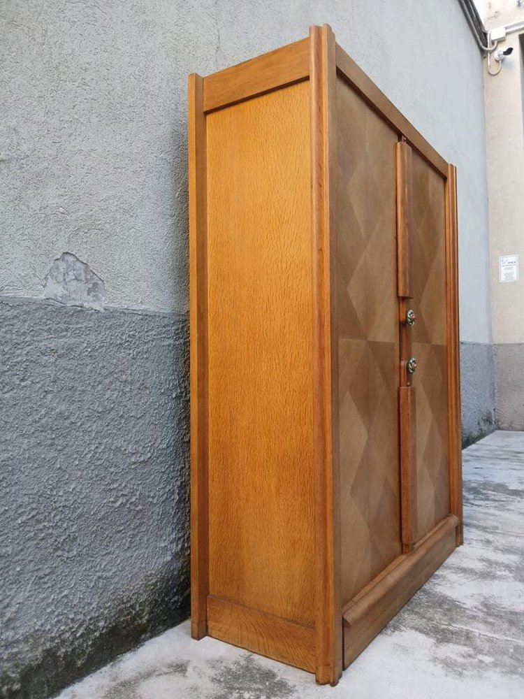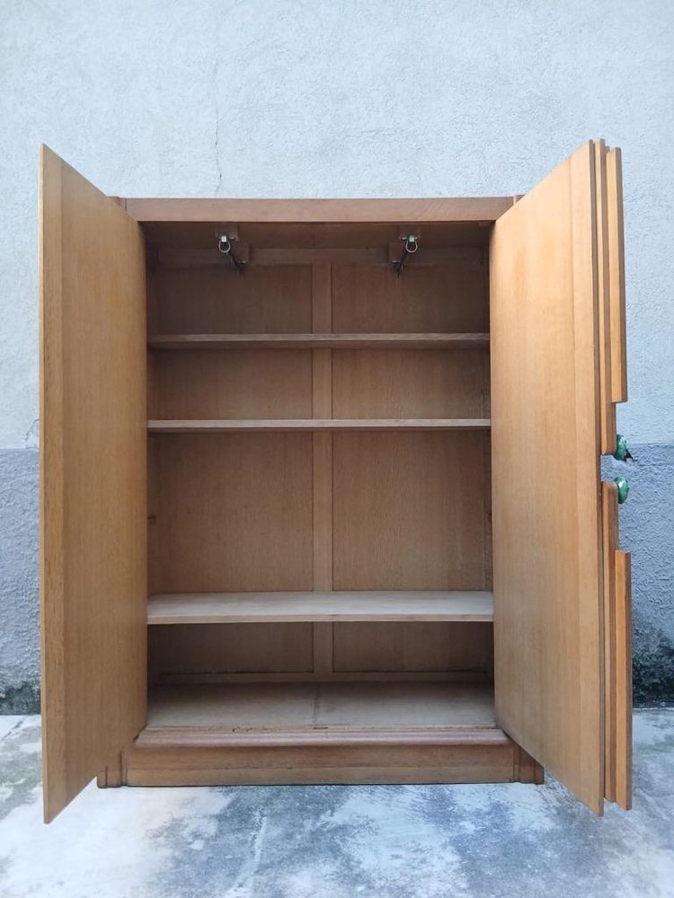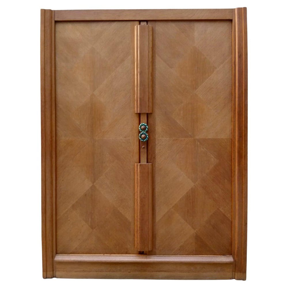 Elegant closet designed and made by Guillerme et Chambron, France, 1950s, produced by their atelier Votre Maison (Lille). Made of solid light oak, it features doors with geometric diamond-pattern inlays and two original green glazed ceramic handles, which control a special central locking system. The piece of furniture, with great constructive rigor and formal refinement, fully reflects the aesthetics of the two French designers, characterized by sober lines, natural materials and sculptural details. The ceramic handles are attributable to artist Boleslaw Danikowski, a collaborator of Guillerme et Chambron, and lend uniqueness and value to the piece. Internally, the closet is organized with shelves and a hanging bar, proving to be as functional as it is decorative. The duo Guillerme et Chambron (Robert Guillerme, 1913-1990 and Jacques Chambron, 1914-2001) founded the famous company Votre Maison in Lille in 1949 in collaboration with cabinetmaker Émile Dariosecq. The two designers had met during World War II, under dramatic circumstances, forging a friendship that was destined to turn into a creative partnership. In the postwar period, their production, developed mostly in waxed oak, interpreted the new trends of mid-century European modernism in a French way, favoring functionality, sturdiness, and sculptural details. Peculiarities of their furnishings were ceramic handles (often made by Boleslaw Danikowski), ingenious locking systems, and a language that was restrained but always rich in personality. The philosophy of Votre Maison-"your home"-was to design furniture truly intended for everyday use, but with the expressive force of true works of design.