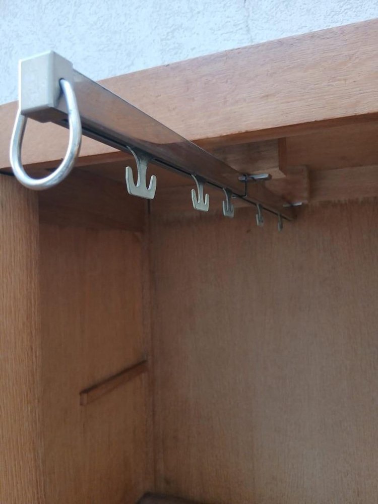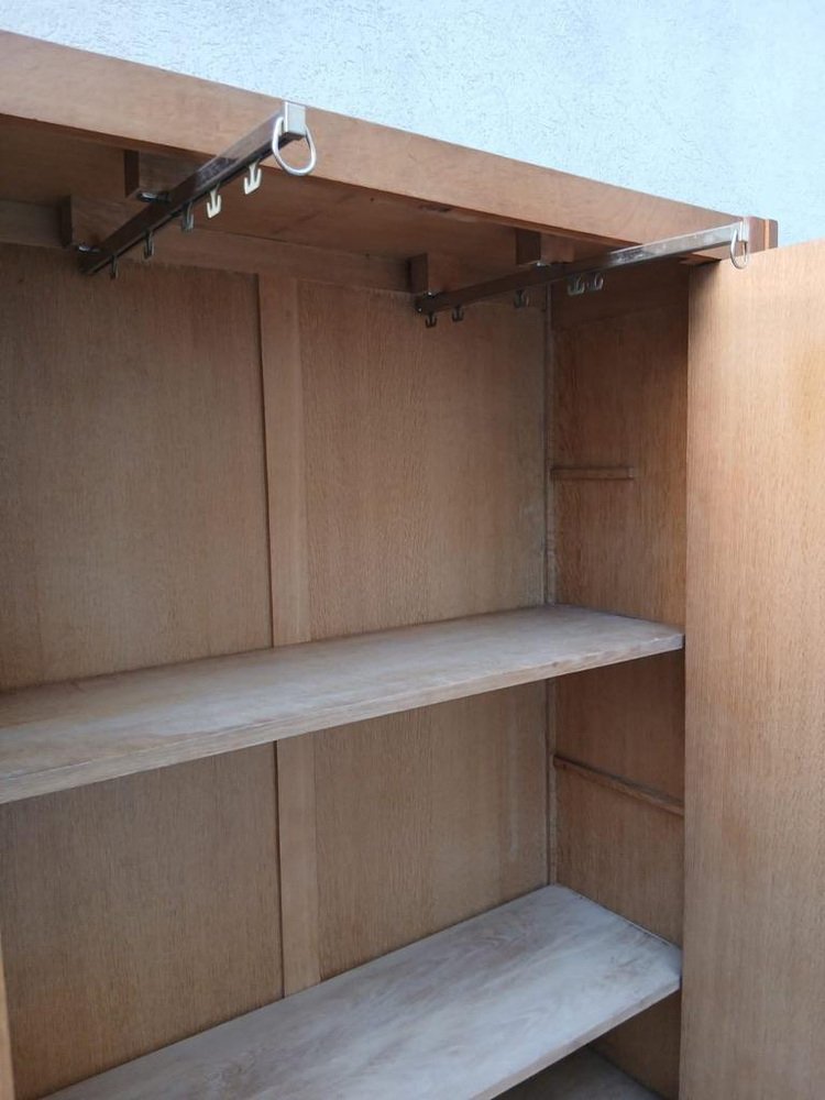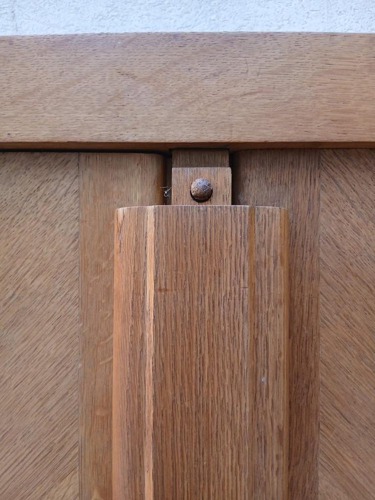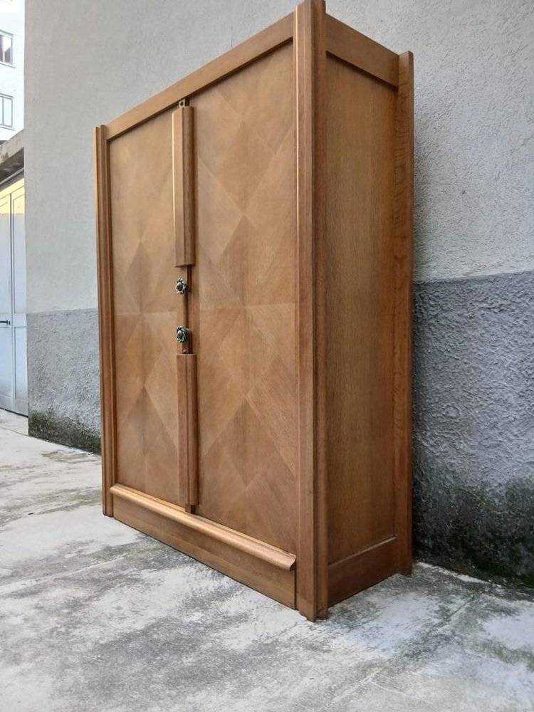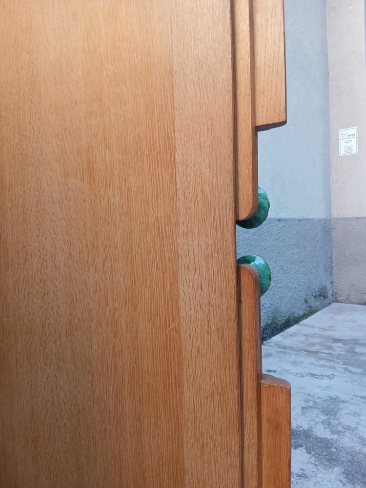 Elégante armoire conçue et réalisée par Guillerme et Chambron, France, années 1950, produite par leur atelier Votre Maison (Lille). Réalisée en chêne clair massif, elle présente des portes avec des incrustations géométriques en losange et deux poignées originales en céramique émaillée verte, qui commandent un système spécial de fermeture centralisée. Ce meuble, d'une grande rigueur constructive et d'un grand raffinement formel, reflète parfaitement l'esthétique des deux designers français, caractérisée par des lignes sobres, des matériaux naturels et des détails sculpturaux. Les poignées en céramique sont attribuées à l'artiste Boleslaw Danikowski, collaborateur de Guillerme et Chambron, et confèrent à la pièce un caractère unique et une grande valeur. A l'intérieur, l'armoire est organisée avec des étagères et une barre de suspension, ce qui la rend aussi fonctionnelle que décorative. Le duo Guillerme et Chambron (Robert Guillerme, 1913-1990 et Jacques Chambron, 1914-2001) a fondé la célèbre société Votre Maison à Lille en 1949 en collaboration avec l'ébéniste Émile Dariosecq. Les deux créateurs s'étaient rencontrés pendant la Seconde Guerre mondiale, dans des circonstances dramatiques, et avaient noué une amitié qui devait se transformer en partenariat créatif. Dans la période d'après-guerre, leur production, développée principalement en chêne ciré, interprète les nouvelles tendances du modernisme européen du milieu du siècle à la française, en privilégiant la fonctionnalité, la robustesse et les détails sculpturaux. Leurs meubles se distinguent par des poignées en céramique (souvent réalisées par Boleslaw Danikowski), des systèmes de fermeture ingénieux et un langage sobre mais toujours riche en personnalité. La philosophie de Votre Maison - "your home" - était de concevoir des meubles réellement destinés à un usage quotidien, mais avec la force expressive de véritables œuvres de design.