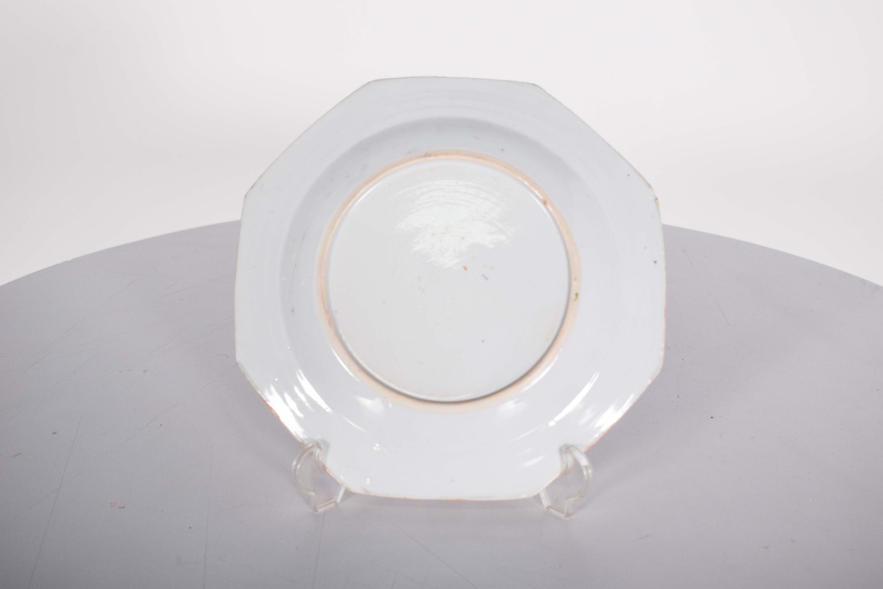 Assiette octogonale en porcelaine de Chine destinée à l'exportation. Décoration polychrome avec des fleurs et des paons, dynastie Qing, période Qianlong (1736-1795).