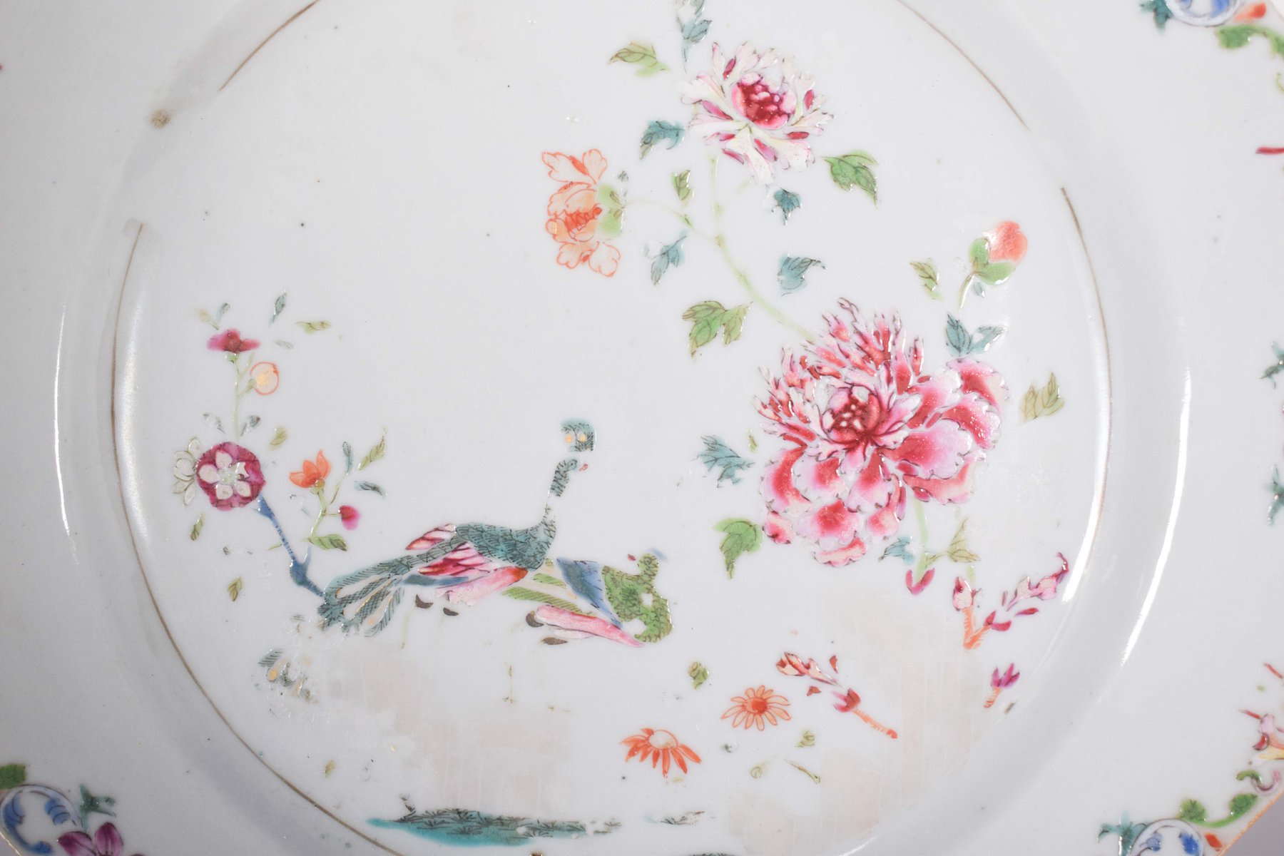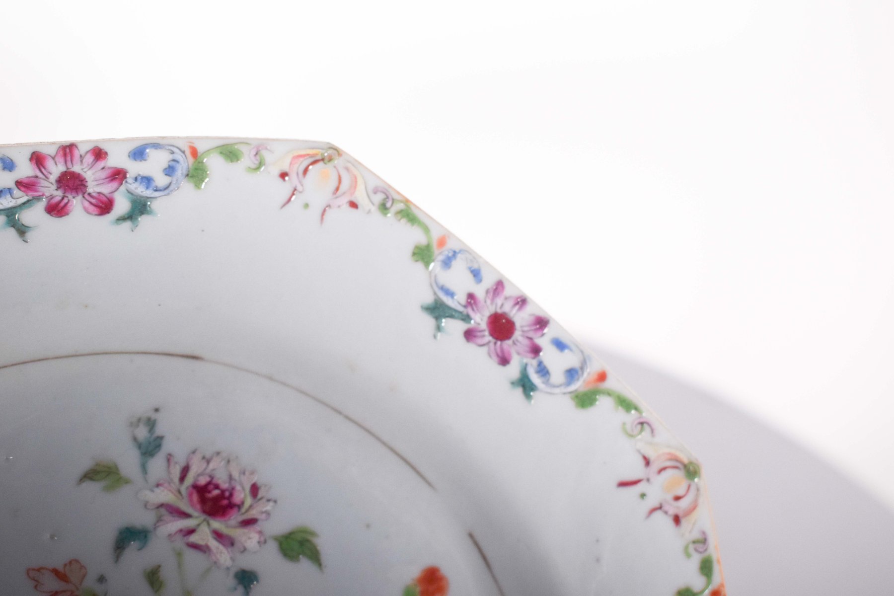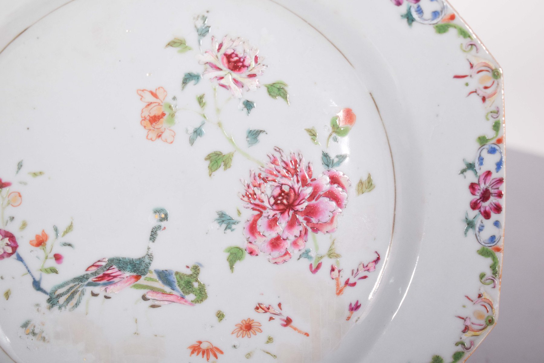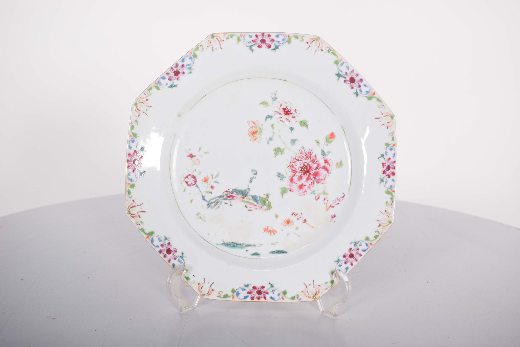 Chinese porcelain octagonal plate for export. Polychrome decoration with flowers and peacocks, Qing Dynasty, Qianlong period (1736-1795).