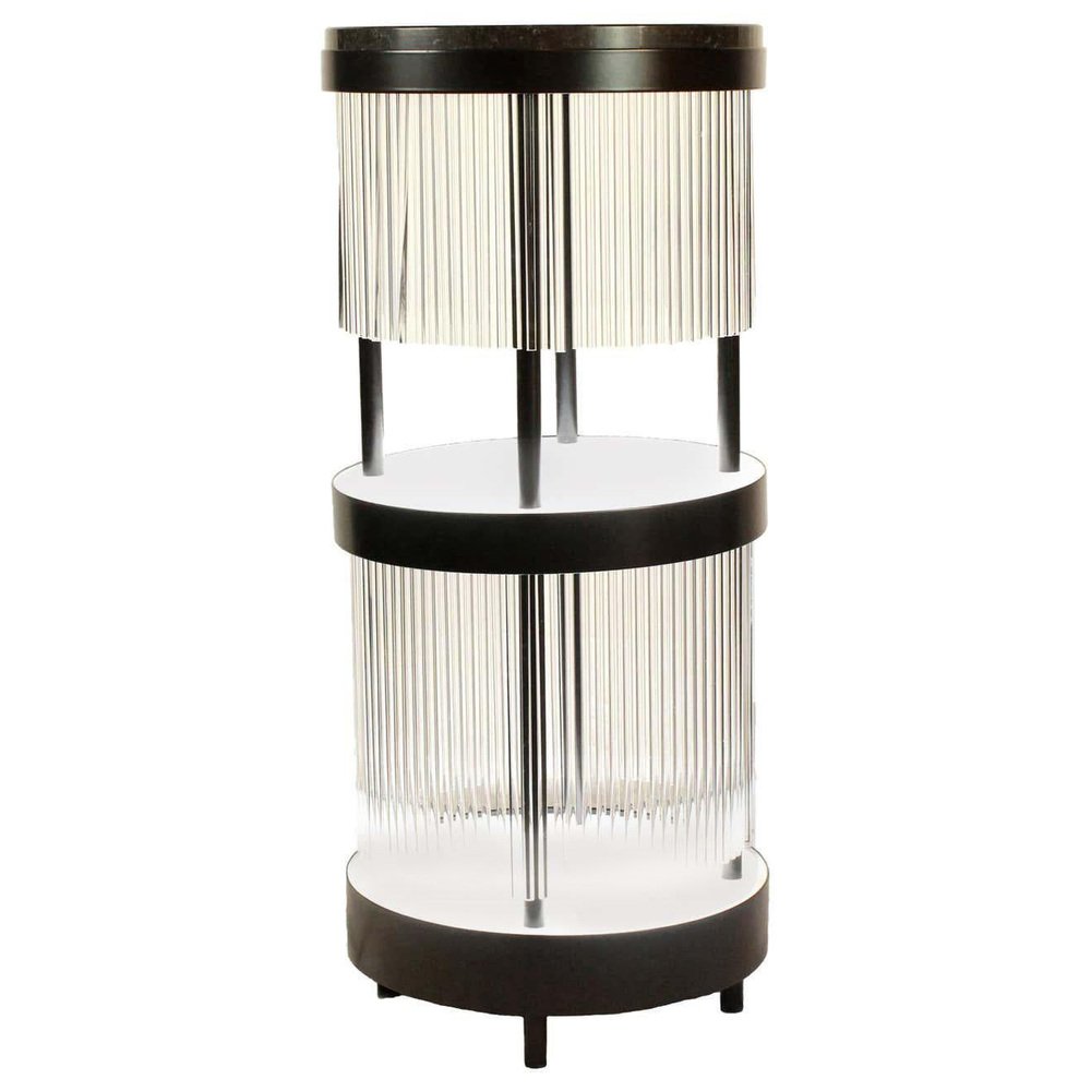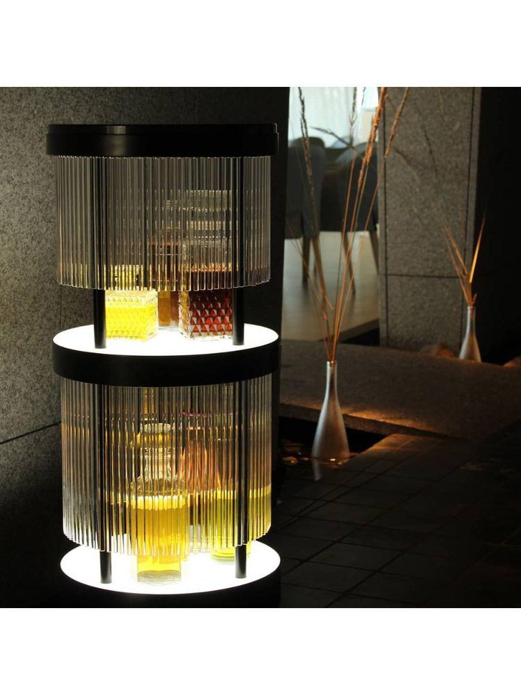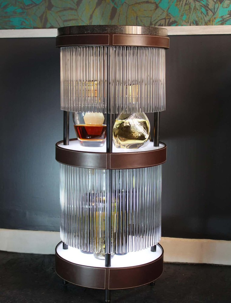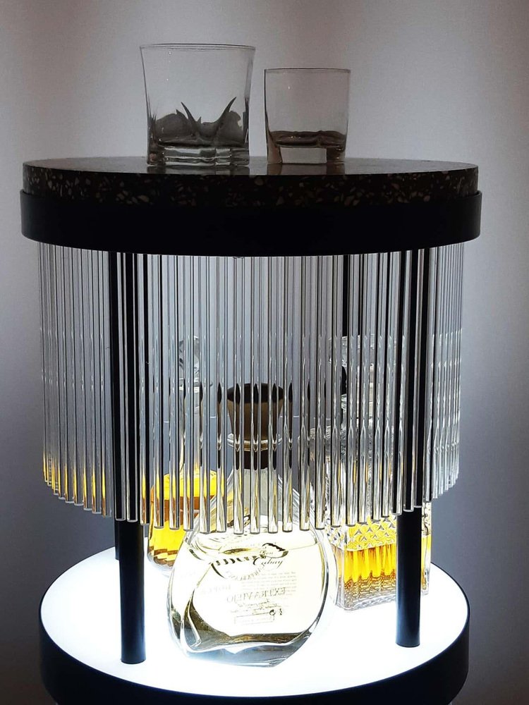 Tchin sidebar by Plumbum Dimensions: Diameter 14.97" x height 35.44" Materials: Powder-coated steel, quartz. Plastic, stone, terrazzo. Includes a light controller. May be available separately in other finishes and with leather. This burlesque and contemporary style dry bar is multipurpose: the display, consumption, and hiding of jugs of liquors. Two backlit trays are layered to shape the piece of furniture and highlight the liquors with a led dimmer (57W, white color 7000°K). Tchin conceals them behind a curtain of translucent tubes, creating transparencies and colors games. During a tasting, choosing a bottle sets the tubular curtain in motion, creating a light chime ambiance. Inside a hotel room or next to a fringed tub chair, Tchin brings to life a singular moment of taste, visual, and sound.