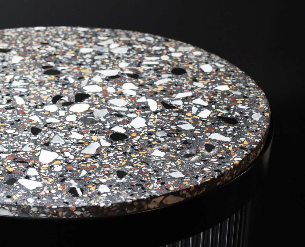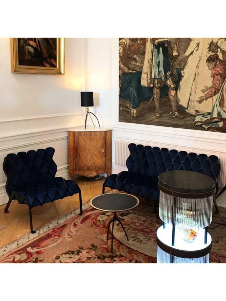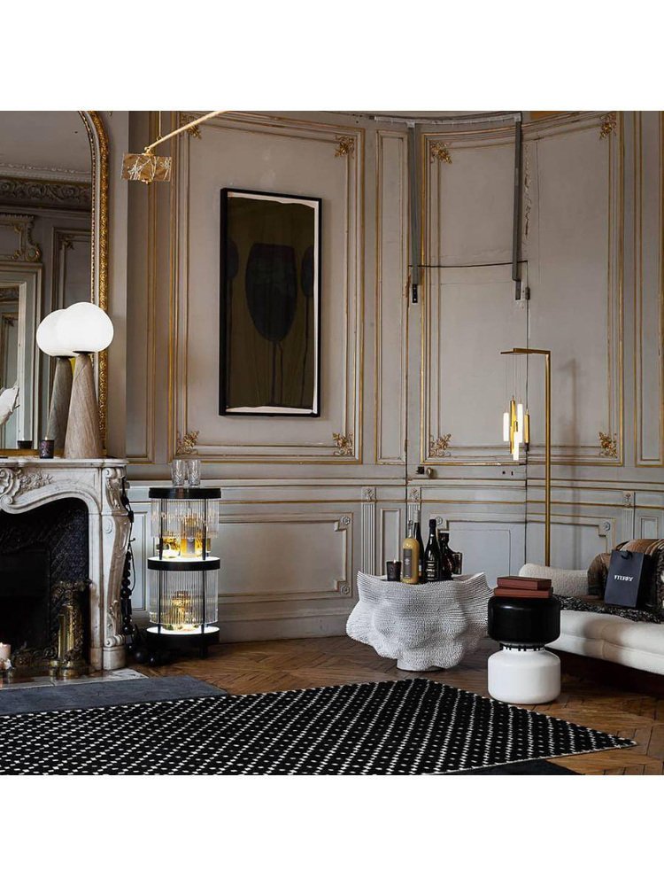 Tchin sidebar by Plumbum Dimensions : Diamètre 14.97" x hauteur 35.44" Matériaux : Acier peint par poudrage, quartz. Plastique, pierre, terrazzo. Comprend un contrôleur de lumière. Peut être disponible séparément dans d'autres finitions et avec du cuir. Ce bar sec de style burlesque et contemporain est polyvalent : présentation, consommation et dissimulation de carafes de liqueurs. Deux plateaux rétro-éclairés sont superposés pour façonner le meuble et mettre en valeur les liqueurs avec un variateur à leds (57W, couleur blanche 7000°K). Tchin les dissimule derrière un rideau de tubes translucides, créant des jeux de transparences et de couleurs. Lors d'une dégustation, le choix d'une bouteille met en mouvement le rideau tubulaire, créant une ambiance de carillon lumineux. A l'intérieur d'une chambre d'hôtel ou à côté d'un fauteuil baignoire à franges, Tchin donne vie à un moment singulier, gustatif, visuel et sonore.