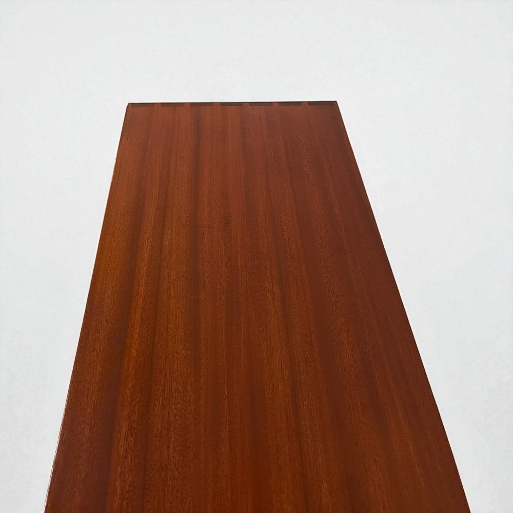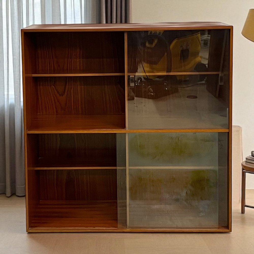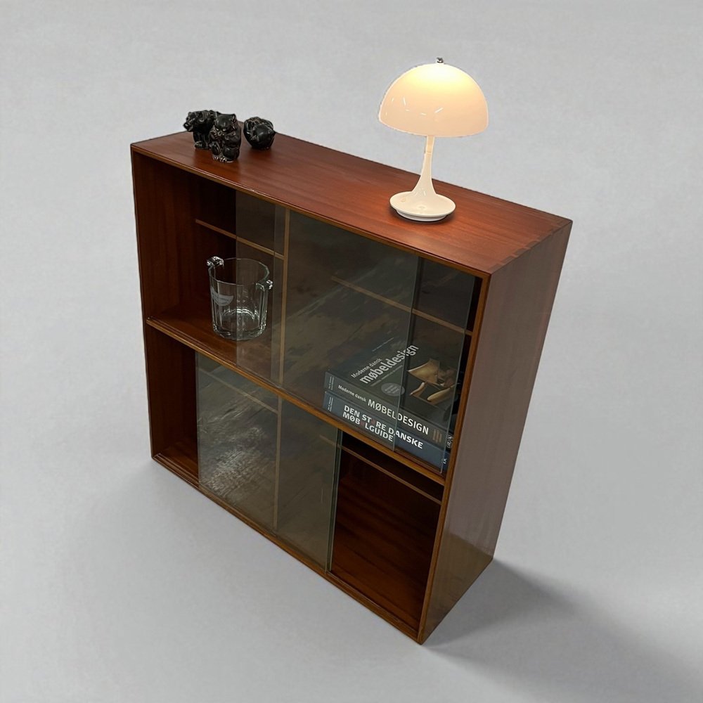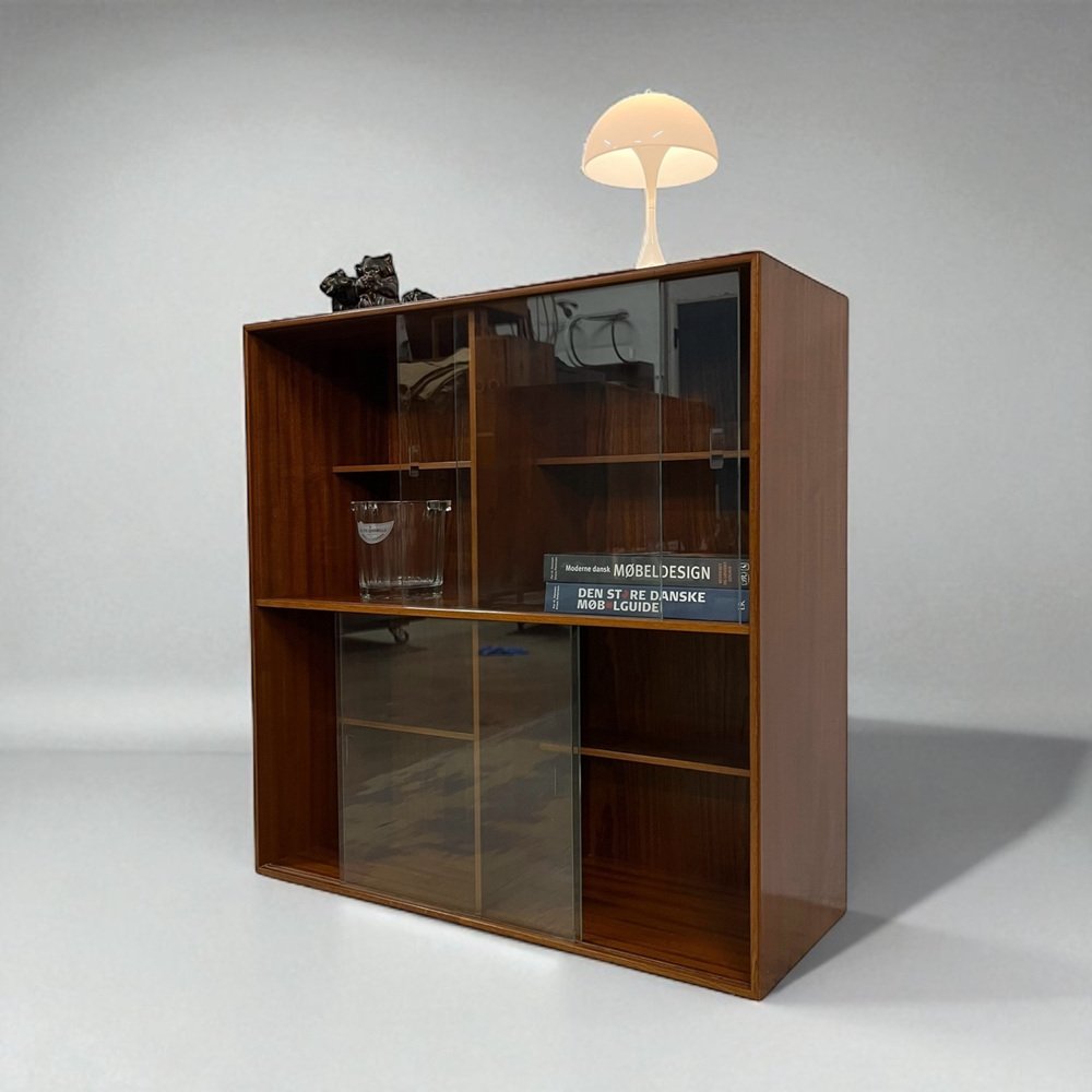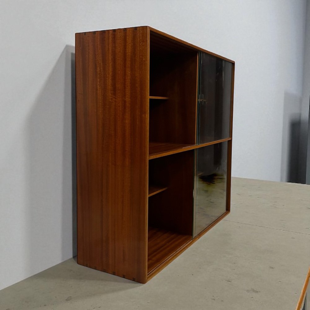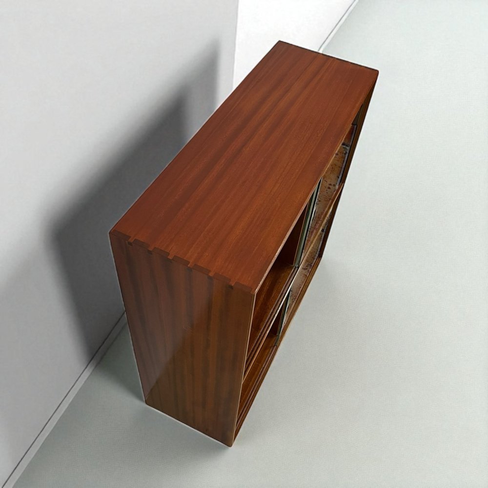 Crafted in mahogany with crisp architectural lines, this rare model features sliding glass doors and four adjustable shelves – ideal for displaying ceramics, books, or sculptural objects.