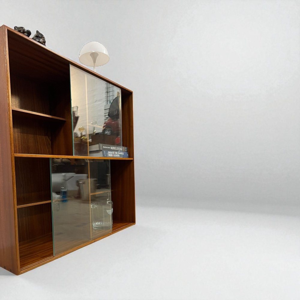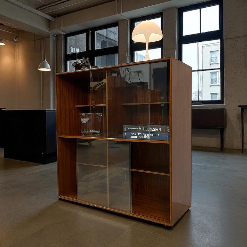 Rare Danish mid-century cabinet with sliding glass doors and refined proportions