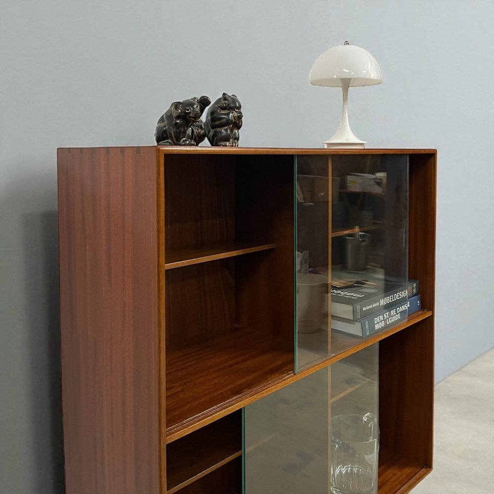 Fabriqué en acajou avec des lignes architecturales nettes, ce modèle rare comporte des portes coulissantes en verre et quatre étagères réglables - idéal pour exposer des céramiques, des livres ou des objets sculpturaux.