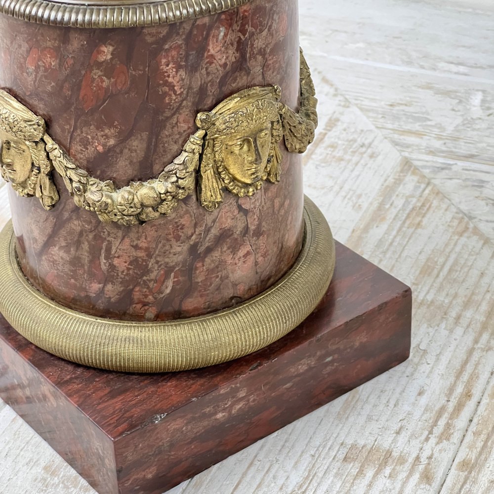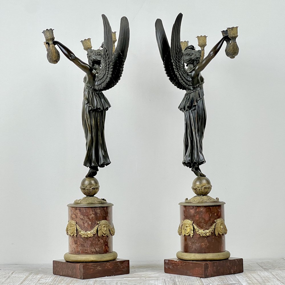 Each candelabra features a classical winged Victory figure holding stylised oil lamp candleholder with gadrooned nozzles. The winged figure wears a flowing dress with finely detailed, crisp lines and stands atop a gilt bronze orb adorned with leaf decoration, which is mounted on a cylindrical rouge marble pedestal. The pedestal is embellished with gilt bronze mounts of female masks and floral garlands, edged with delicate foliage. The whole supported on a square marble plinth base.