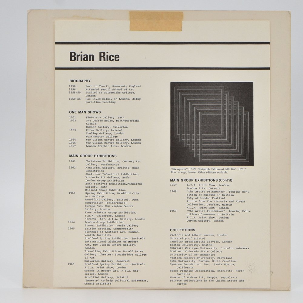 Brian Rice est un artiste abstrait britannique associé au mouvement pop art. Il a étudié à Londres, et ses œuvres sont représentées, entre autres, au Victoria and Albert Museum.