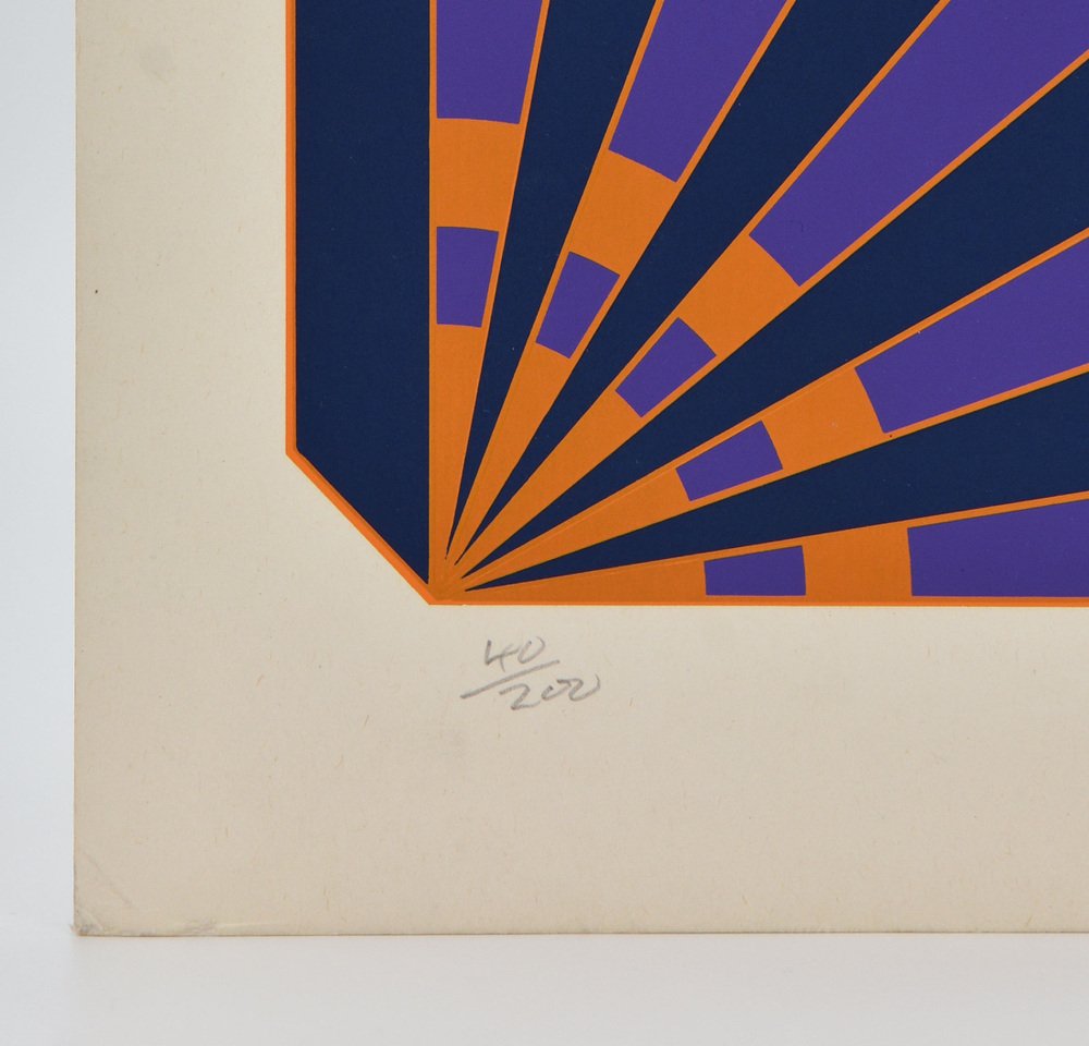 Geometric composition, silkscreen on cardboard, signed by hand lower right, numbered 40/200 lower left. The reverse titled in pencil 'Radio' along with a biography of the artist.