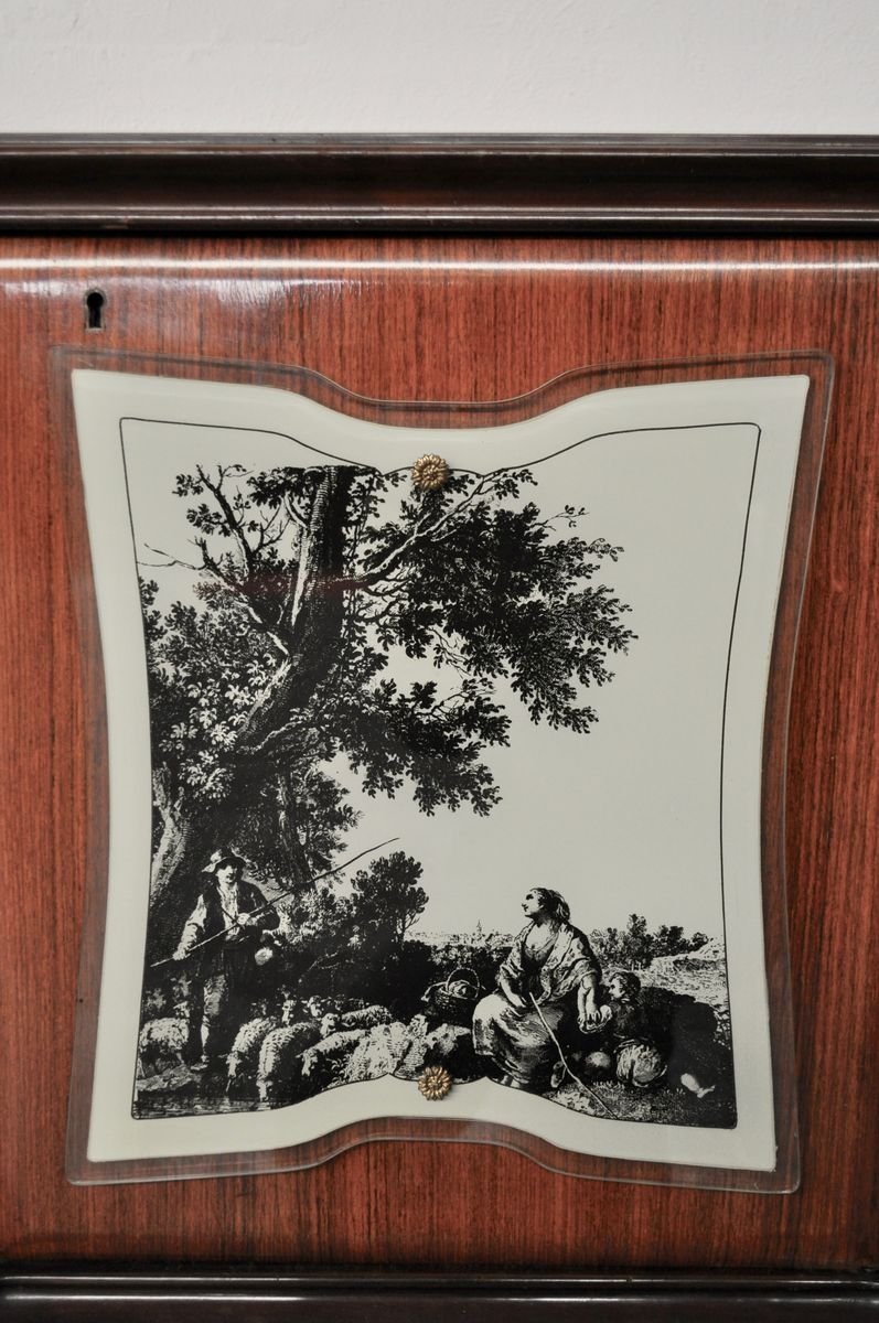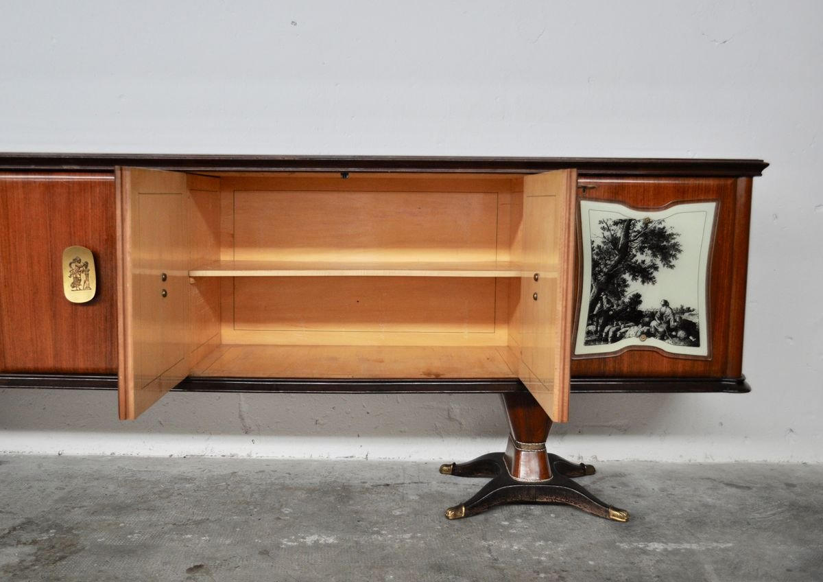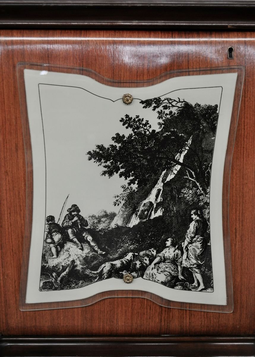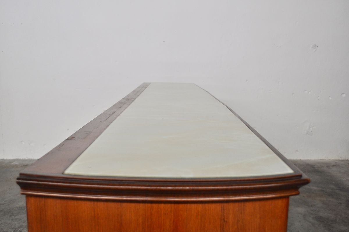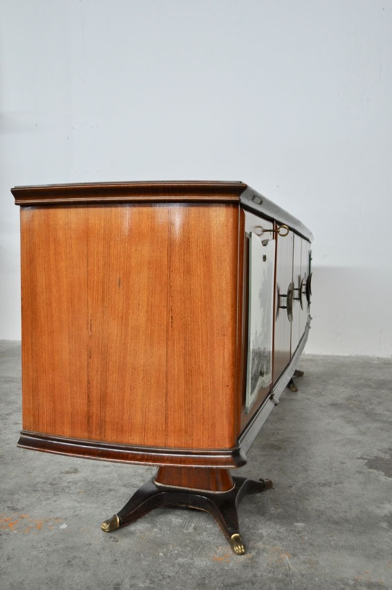 Buffet à plateau en acajou, bois de poirier, laiton et verre marbré laqué à l'arrière avec miroir de F.lli Rigamonti Desio, Milan, 1940s