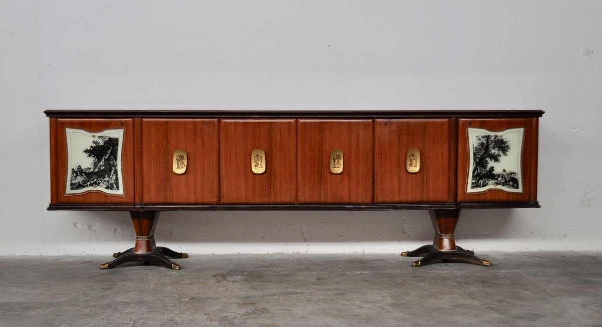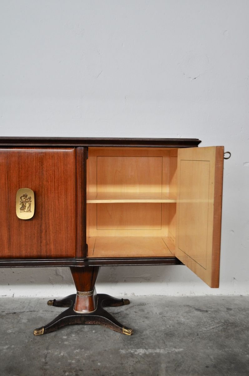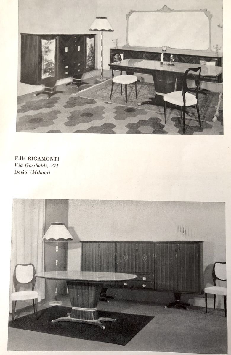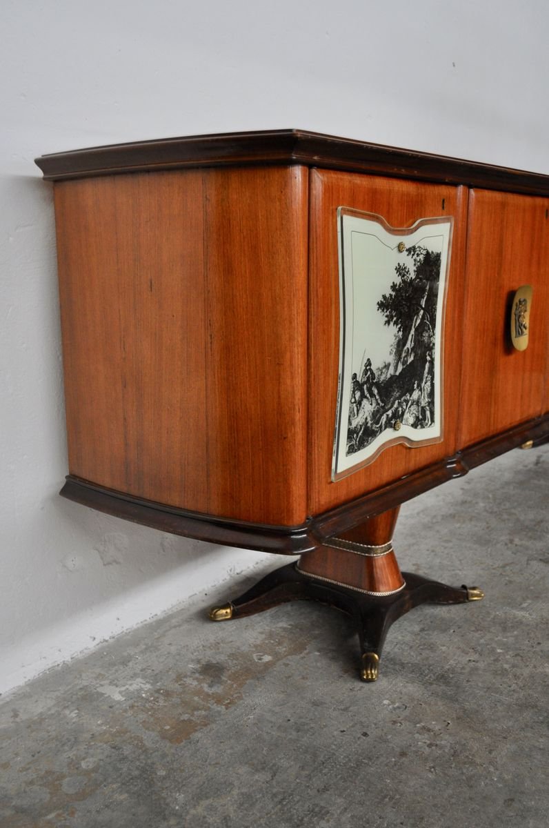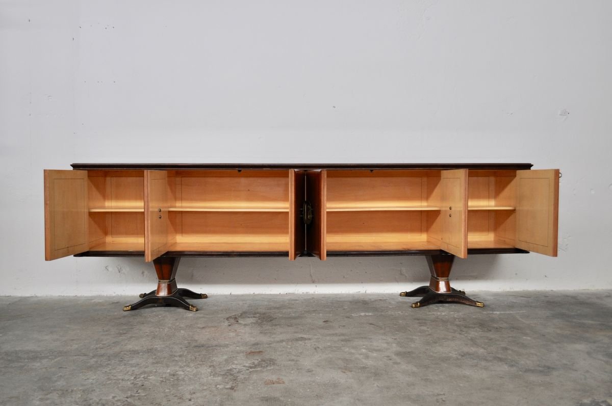 Buffet à plateau en acajou, bois de poirier, laiton et verre marbré laqué à l'arrière avec miroir de F.lli Rigamonti Desio, Milan, 1940s