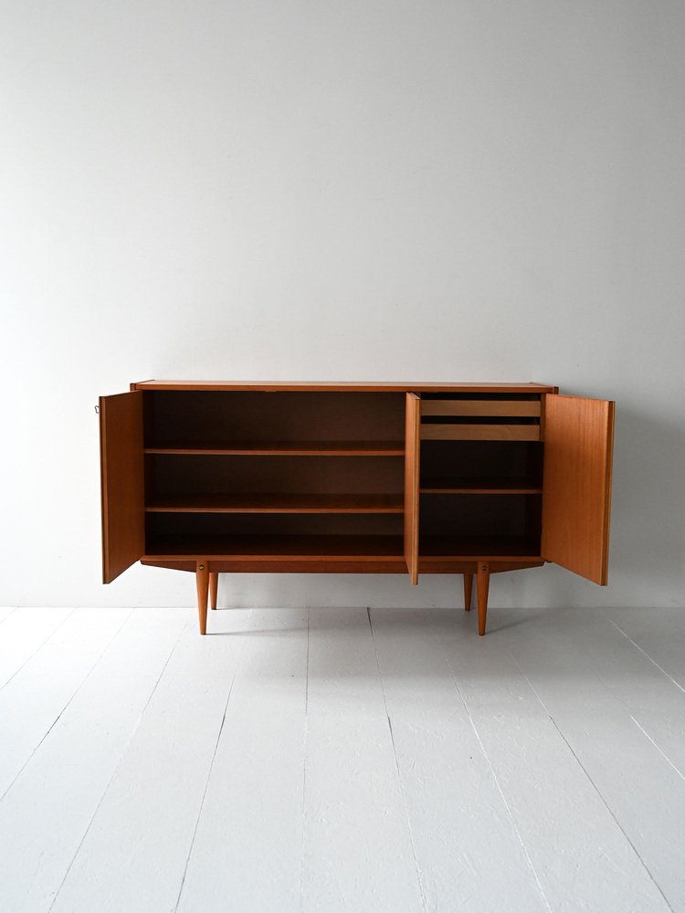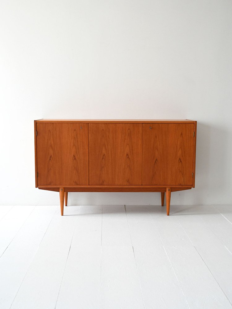 Scandinavian highboard from the 1960s with triple teak hinged doors. The interior is organized into two compartments: one with two shelves, the other with a shelf and two cutlery drawers. Tapered legs, brass details, and the original key included. Balanced and discreet design, typical of Nordic modernism.