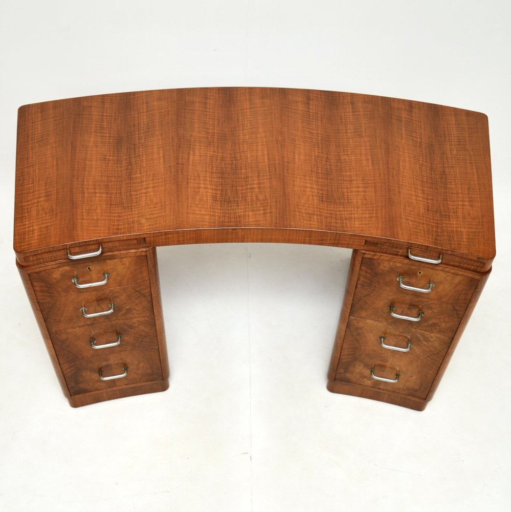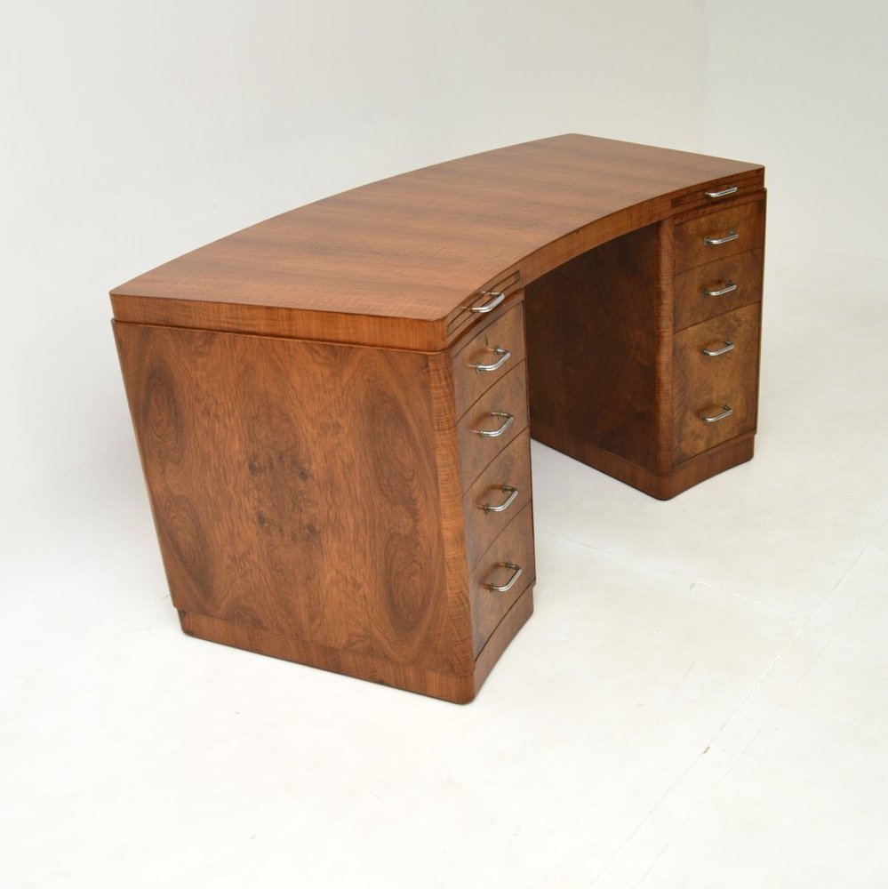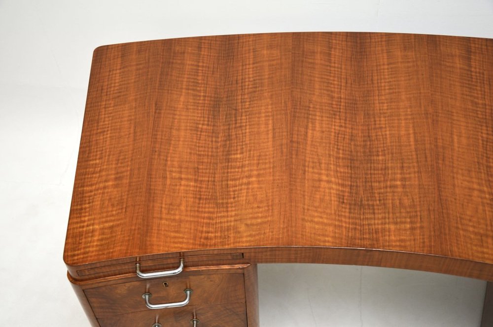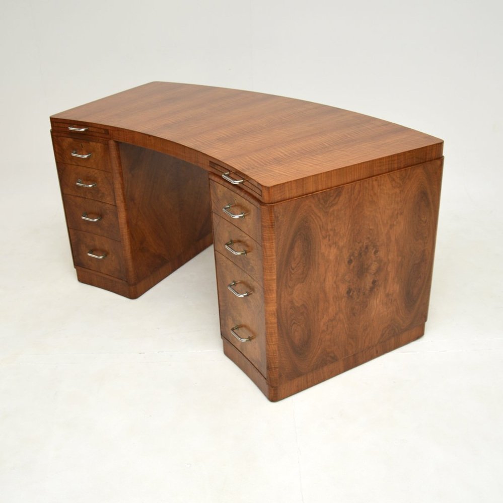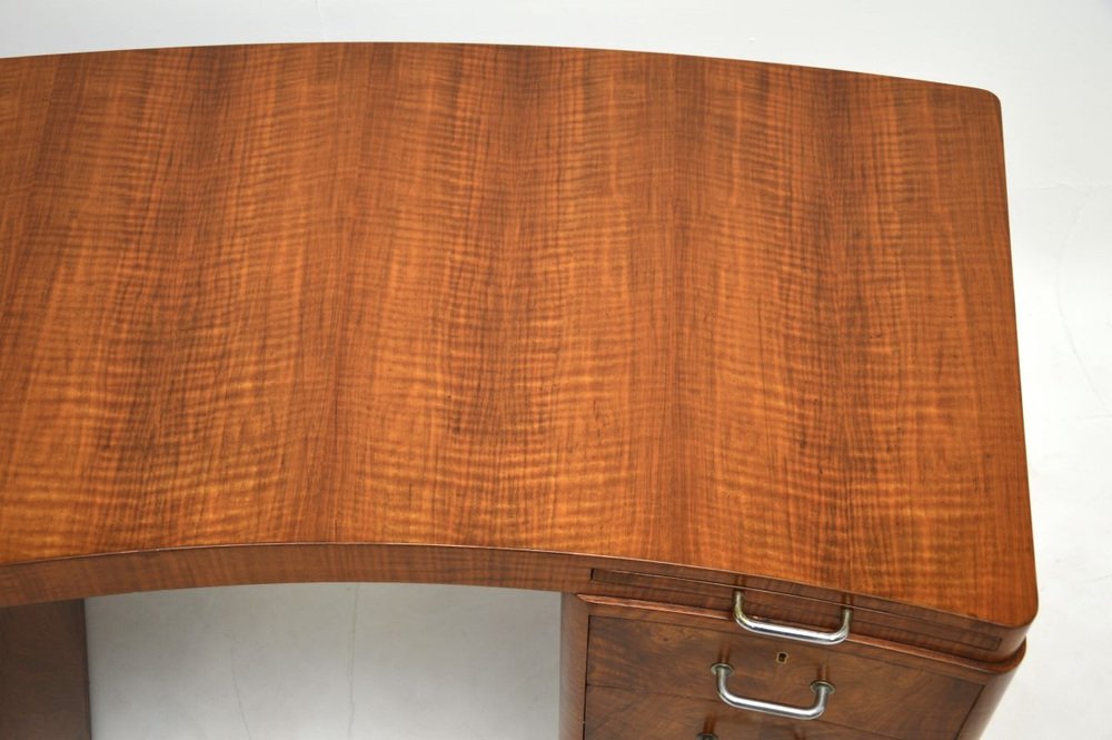 Un très beau et très rare bureau Art déco en ronce de noyer de Hampton's of Pall Mall, datant des années 1930.