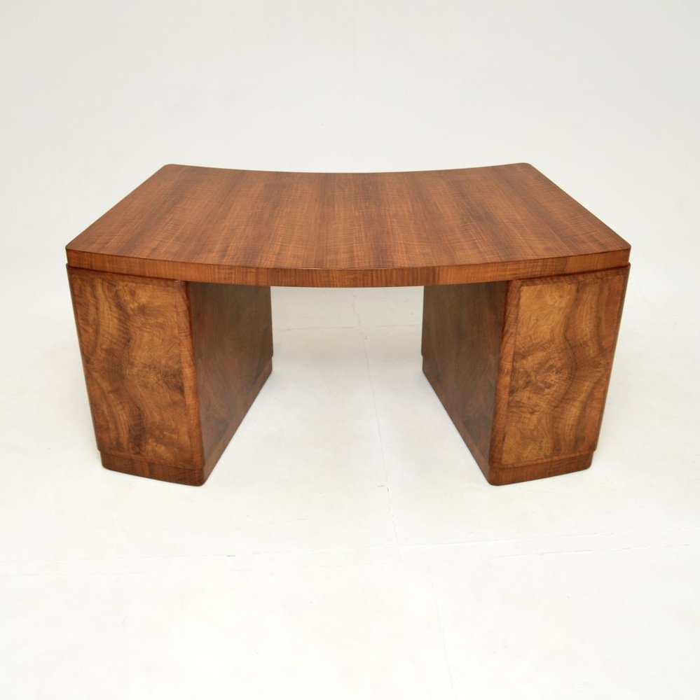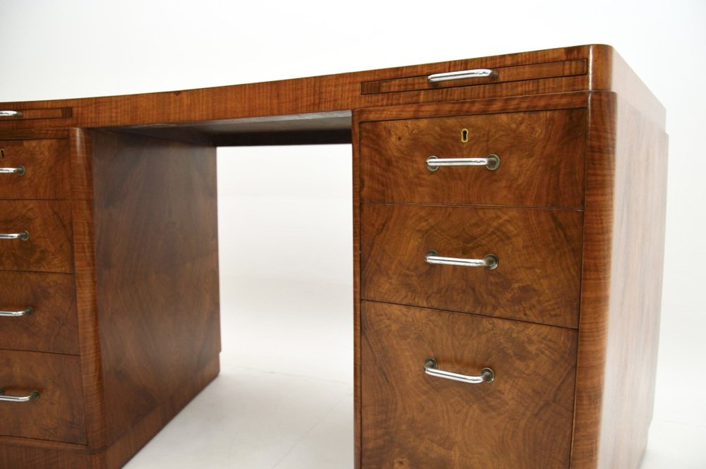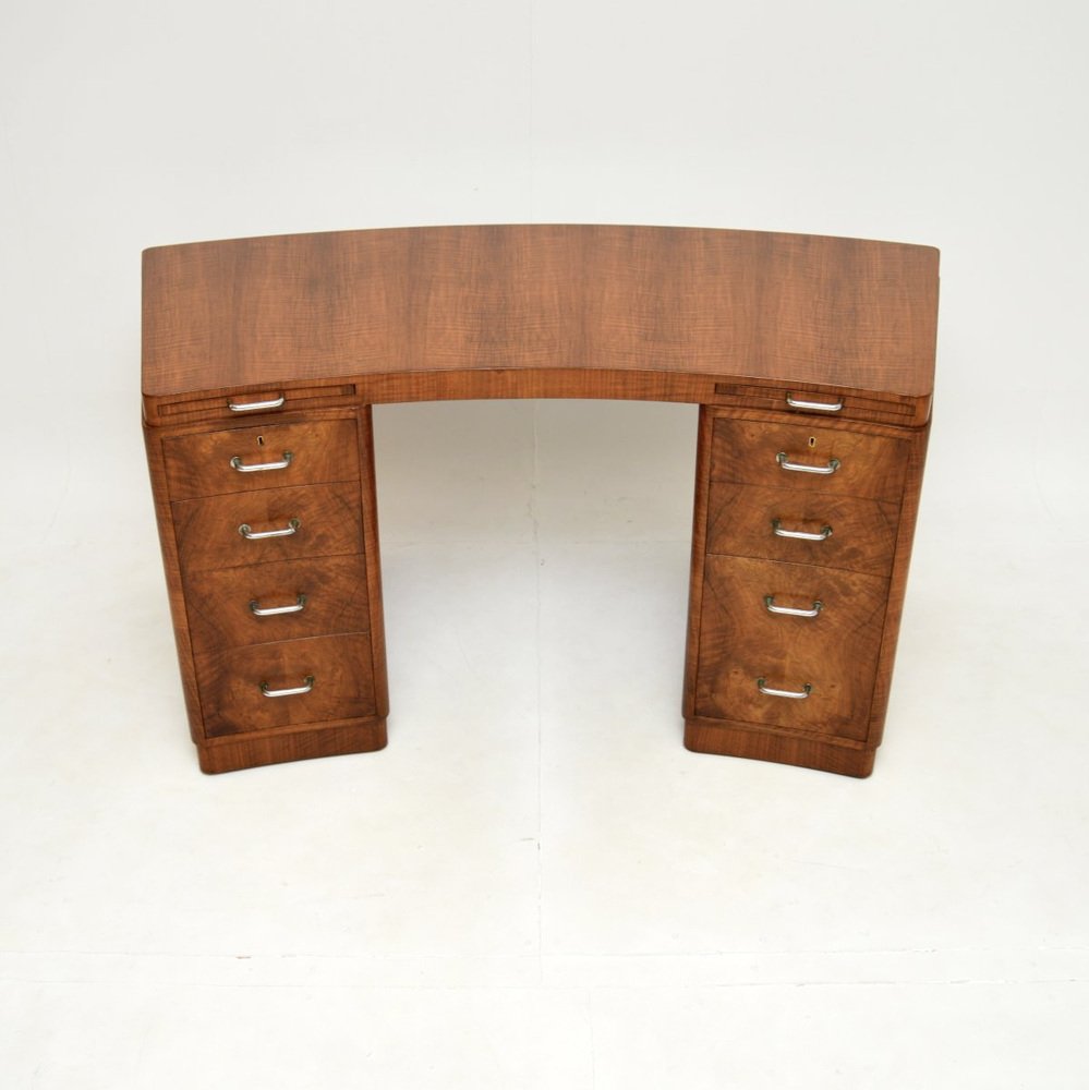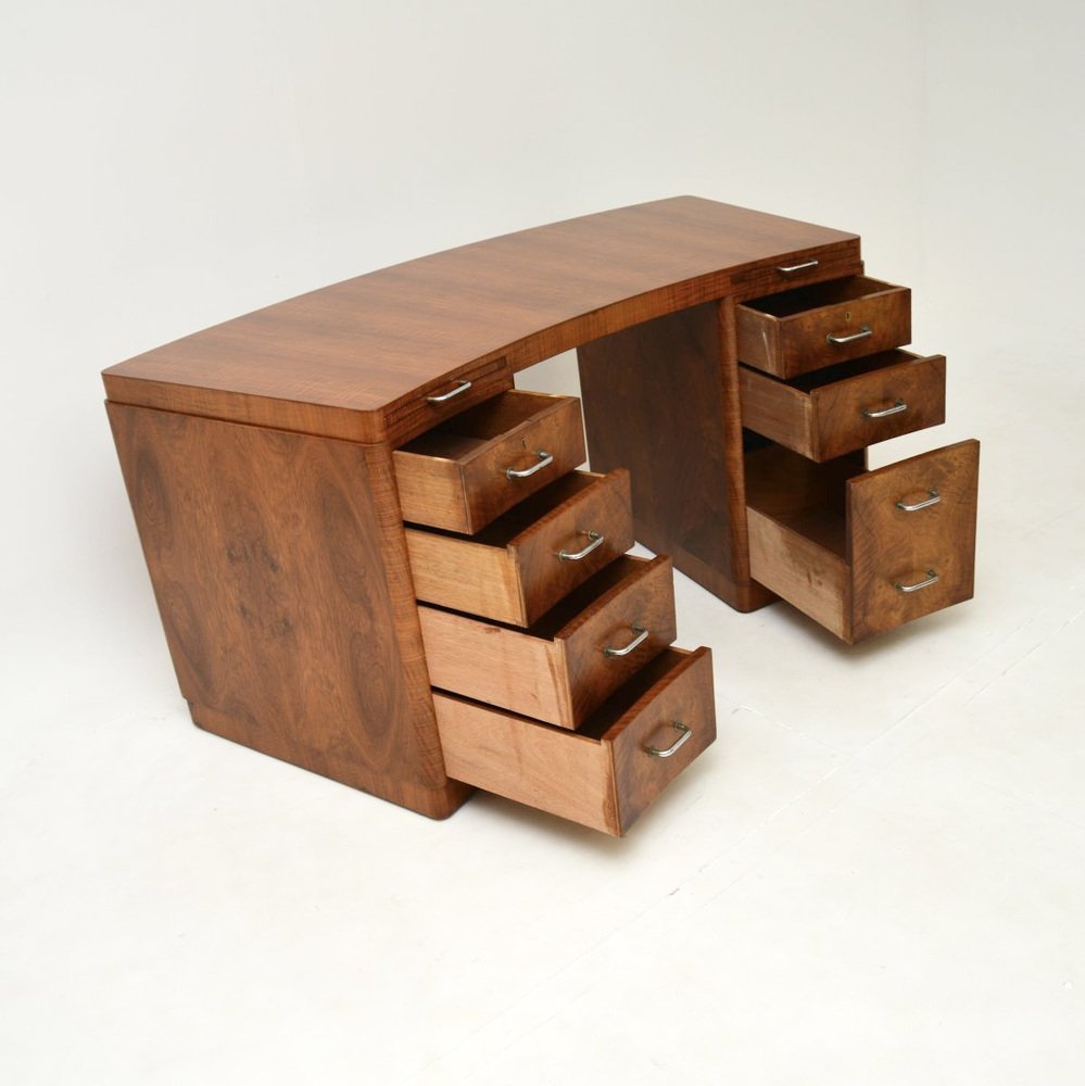 Un très beau et très rare bureau Art déco en ronce de noyer de Hampton's of Pall Mall, datant des années 1930.