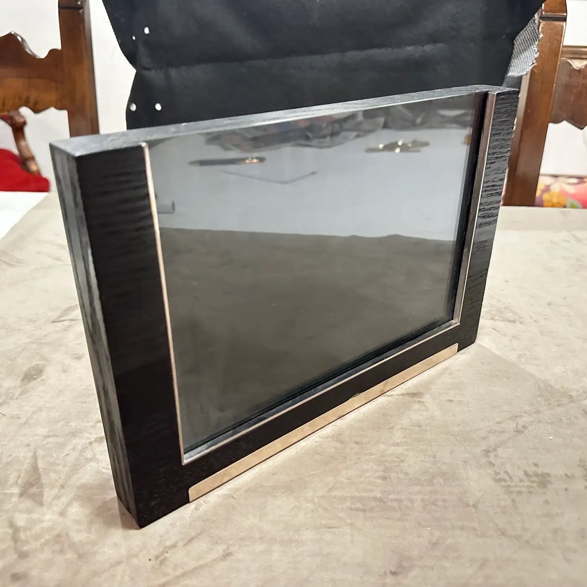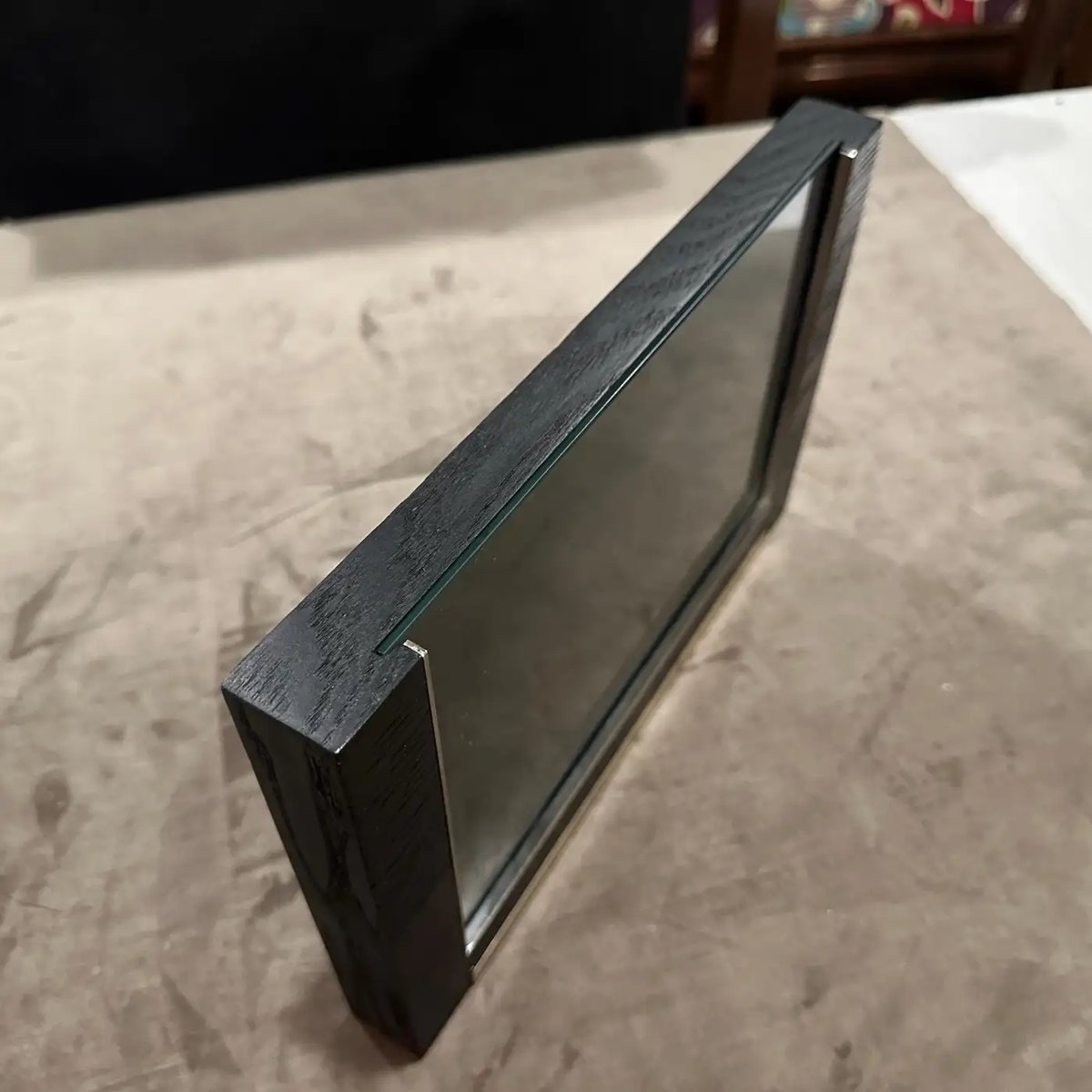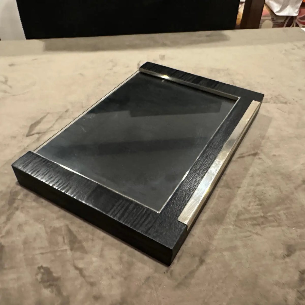 Sleek 1980s Modern Sterling Silver and Ebonized Wood Picture Frame by Silvan, Italy This exquisite picture frame is a testament to sophisticated Italian craftsmanship by the esteemed manufacturer Silvan. This frame seamlessly blends luxurious materials and a minimalist design, making it a timeless accent for any contemporary or classic interior. The frame features a striking contrast between its rich, dark ebonized wood and the gleaming sterling silver accents. The wood frame, treated to achieve a deep, almost black finish with visible grain, provides a solid and substantial presence. Integrated into the bottom edge and one side are clean, polished sterling silver bars, which add a touch of understated opulence and a distinct modern edge. A hallmark visible on the silver (referencing "925" for sterling silver and an Italian maker's mark like "200 FI", confirms its authenticity and high-quality material. The design is clean and architectural, allowing the materials themselves to be the focus, while the reflective qualities of the silver beautifully complement the depth of the ebonized wood. Perfect for showcasing a treasured photograph, an art print, or even a small mirror, this Silvan frame is not just a functional item but a statement piece that embodies the luxurious yet understated aesthetic popular in the 1980s. Excellent vintage condition. The ebonized wood shows minimal wear, and the sterling silver is polished, presenting beautifully.