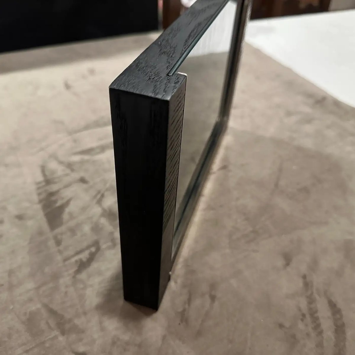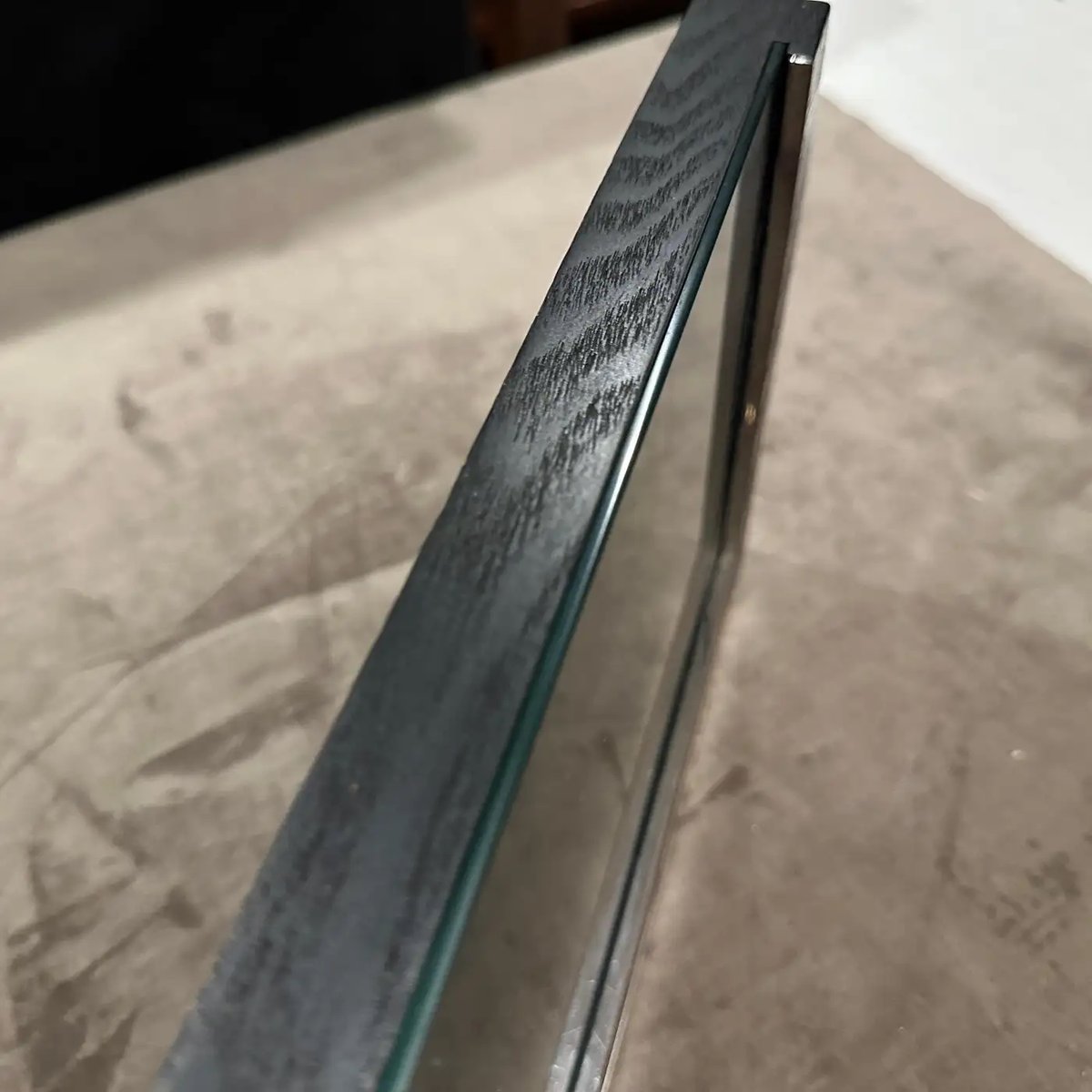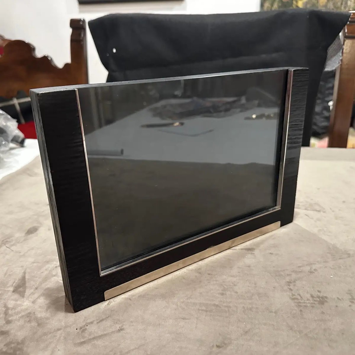 Sleek 1980s Modern Sterling Silver and Ebonized Wood Picture Frame by Silvan, Italy This exquisite picture frame is a testament to sophisticated Italian craftsmanship by the esteemed manufacturer Silvan. This frame seamlessly blends luxurious materials and a minimalist design, making it a timeless accent for any contemporary or classic interior. The frame features a striking contrast between its rich, dark ebonized wood and the gleaming sterling silver accents. The wood frame, treated to achieve a deep, almost black finish with visible grain, provides a solid and substantial presence. Integrated into the bottom edge and one side are clean, polished sterling silver bars, which add a touch of understated opulence and a distinct modern edge. A hallmark visible on the silver (referencing "925" for sterling silver and an Italian maker's mark like "200 FI", confirms its authenticity and high-quality material. The design is clean and architectural, allowing the materials themselves to be the focus, while the reflective qualities of the silver beautifully complement the depth of the ebonized wood. Perfect for showcasing a treasured photograph, an art print, or even a small mirror, this Silvan frame is not just a functional item but a statement piece that embodies the luxurious yet understated aesthetic popular in the 1980s. Excellent vintage condition. The ebonized wood shows minimal wear, and the sterling silver is polished, presenting beautifully.