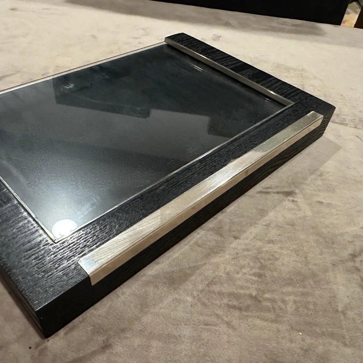 Cadre photo en argent sterling et bois ébonisé par Silvan, Italie Ce cadre photo exquis est un témoignage de l'artisanat italien sophistiqué de l'estimable fabricant Silvan. Ce cadre allie harmonieusement des matériaux luxueux et un design minimaliste, ce qui en fait un élément intemporel pour tout intérieur contemporain ou classique. Le cadre présente un contraste saisissant entre son bois ébonisé riche et sombre et les accents brillants d'argent sterling. Le cadre en bois, traité pour obtenir une finition profonde, presque noire, avec des veines visibles, offre une présence solide et substantielle. Des barres d'argent sterling nettes et polies sont intégrées au bord inférieur et à l'un des côtés, ce qui ajoute une touche d'opulence discrète et une nette touche de modernité. Un poinçon visible sur l'argent (mentionnant "925" pour l'argent sterling et une marque de fabricant italienne telle que "200 FI") confirme l'authenticité et la haute qualité du matériau. Le design est épuré et architectural, permettant aux matériaux eux-mêmes d'être le centre d'intérêt, tandis que les qualités réfléchissantes de l'argent complètent magnifiquement la profondeur du bois ébonisé. Parfait pour mettre en valeur une photographie précieuse, une impression d'art ou même un petit miroir, ce cadre Silvan n'est pas seulement un objet fonctionnel, mais une pièce d'apparat qui incarne l'esthétique luxueuse et discrète en vogue dans les années 1980. Excellent état vintage. Le bois ébonisé présente une usure minimale, et l'argent sterling est poli, présentant magnifiquement.