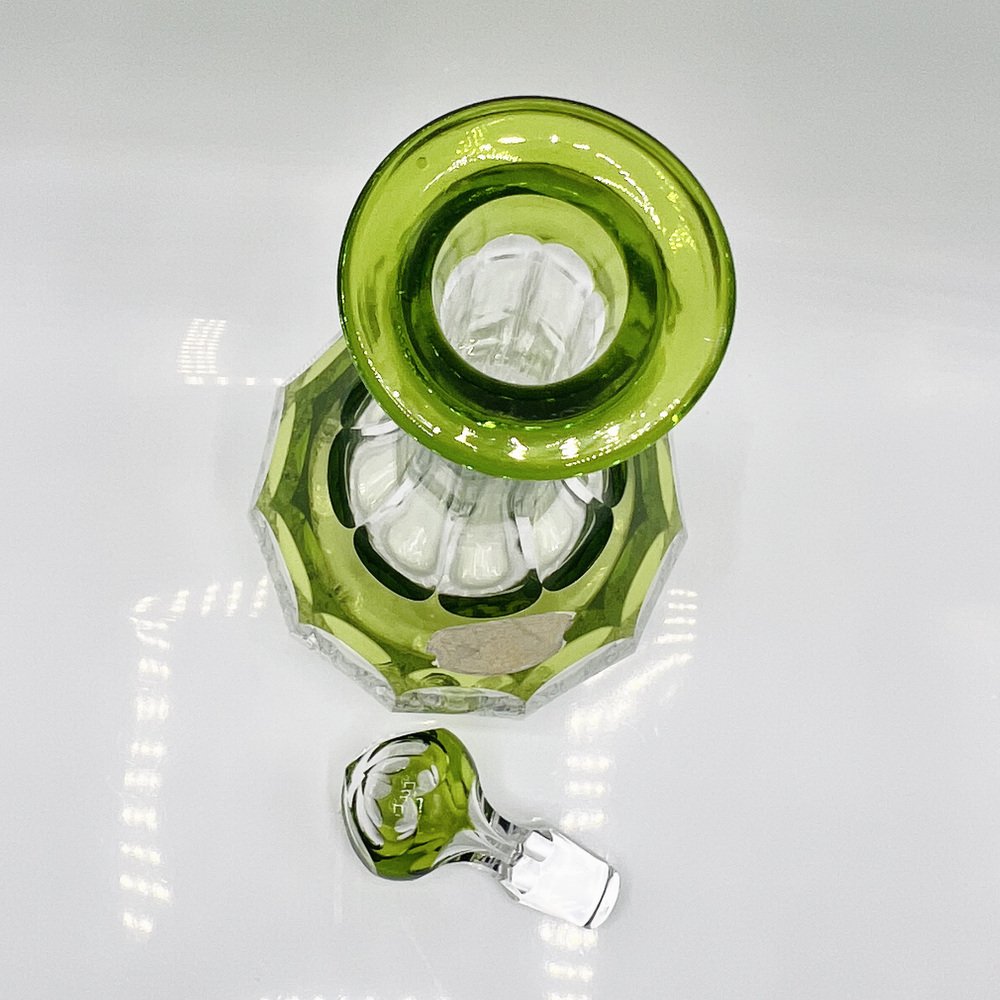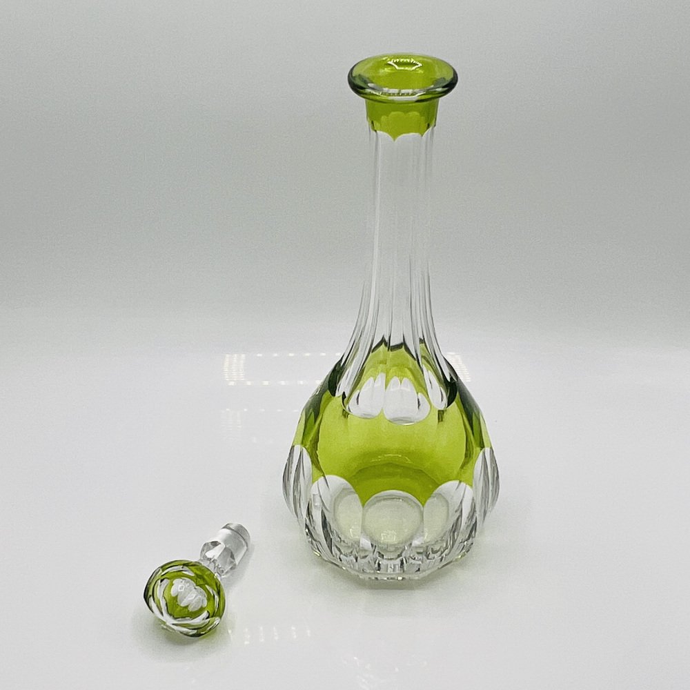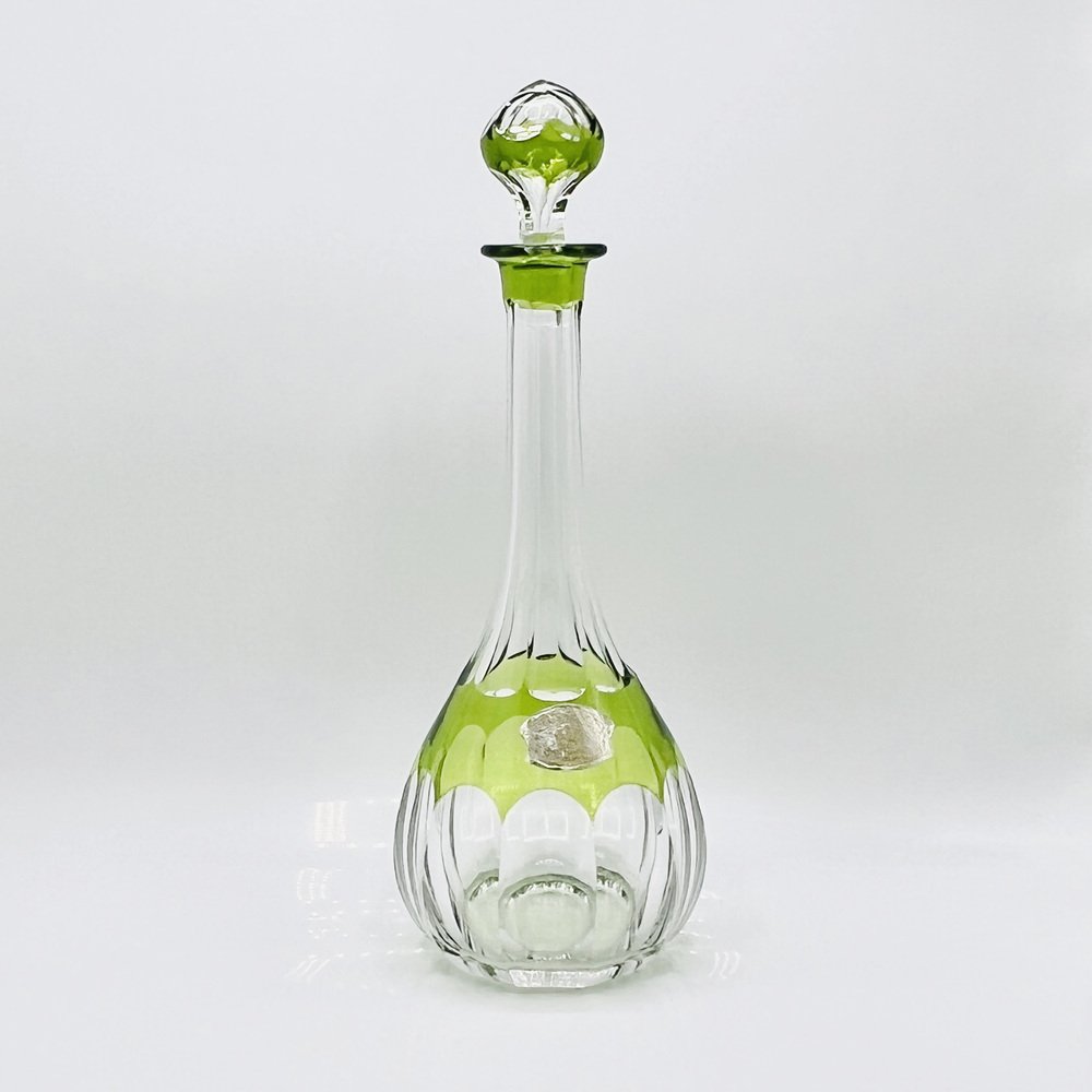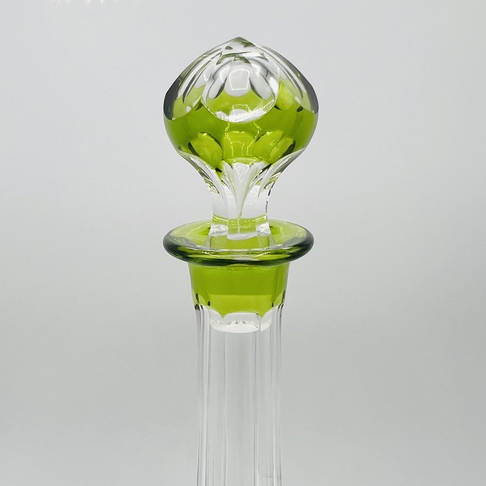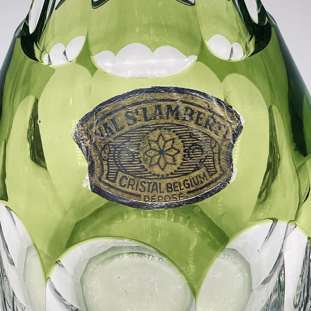 This piece is a Val St. Lambert “Osram” cut-to-clear crystal decanter, a recognised Mid-Century Modern design classic. This pattern, introduced in the mid-20th century, exemplifies Val St. Lambert’s mastery of bold overlay crystal with precise geometric cutting and finished in the rare chartreuse green cut-to-clear — colour, this decanter represents the Belgian glassmaker’s most iconic postwar work, and showcasing the superb craftsmanship of Belgium’s most prestigious glasswork designs.