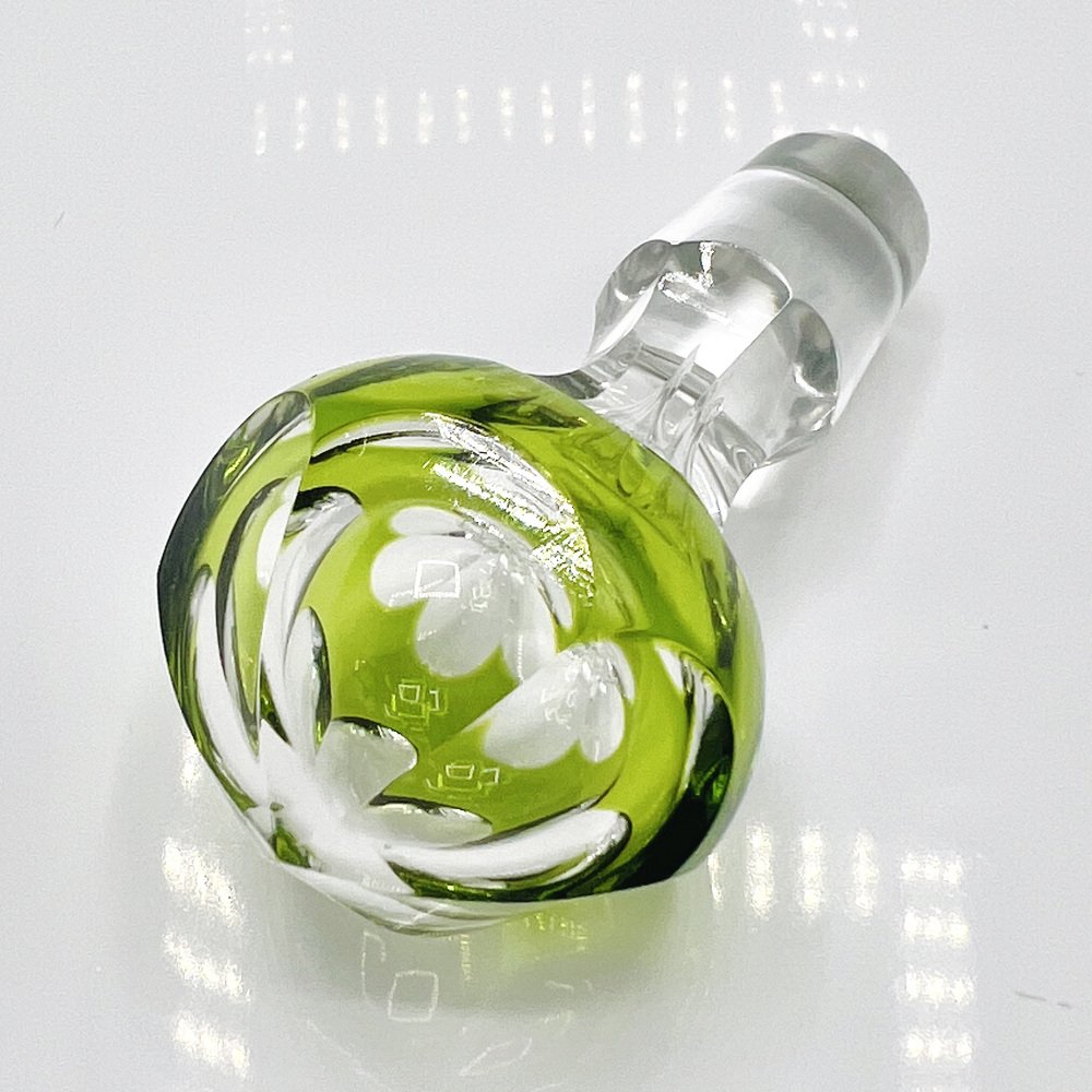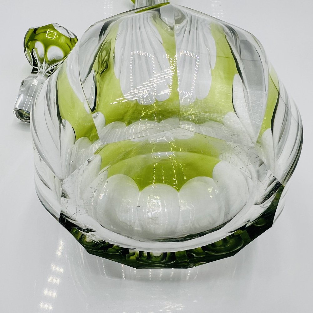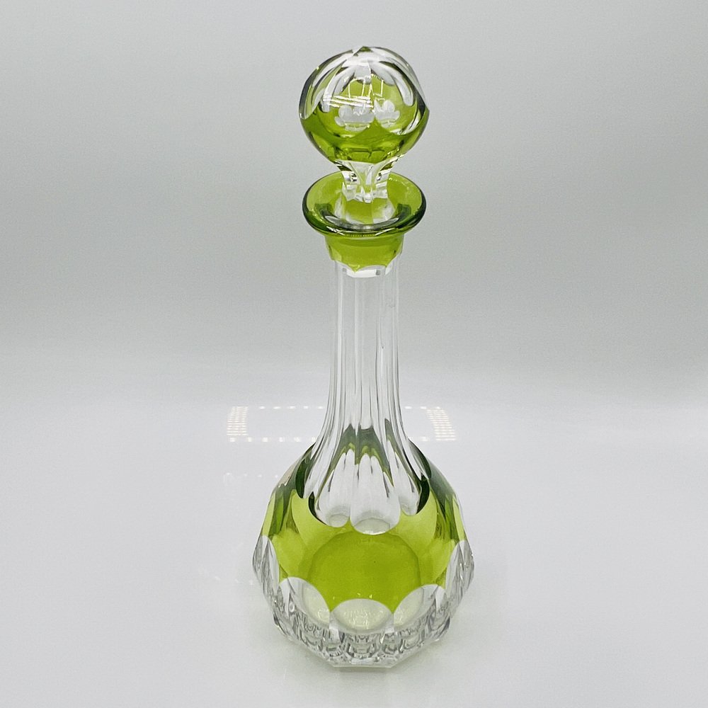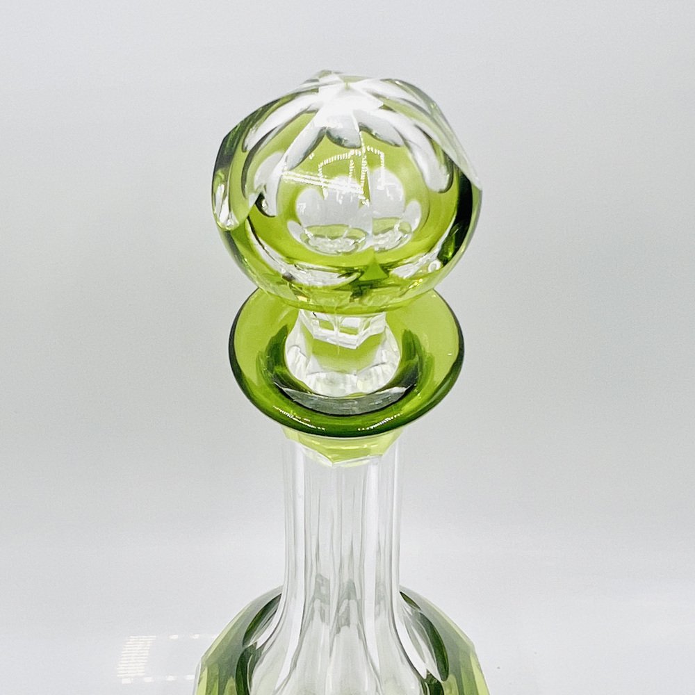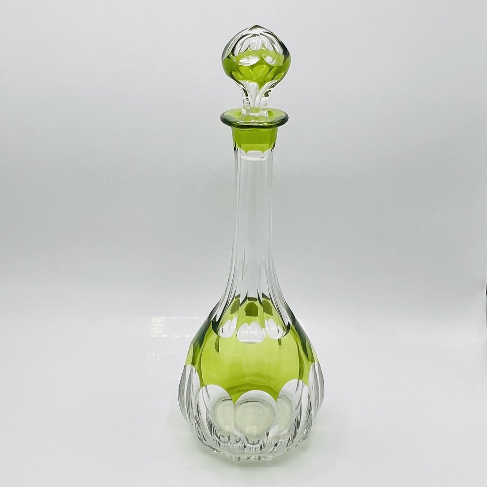 This piece is a Val St. Lambert “Osram” cut-to-clear crystal decanter, a recognised Mid-Century Modern design classic. This pattern, introduced in the mid-20th century, exemplifies Val St. Lambert’s mastery of bold overlay crystal with precise geometric cutting and finished in the rare chartreuse green cut-to-clear — colour, this decanter represents the Belgian glassmaker’s most iconic postwar work, and showcasing the superb craftsmanship of Belgium’s most prestigious glasswork designs.