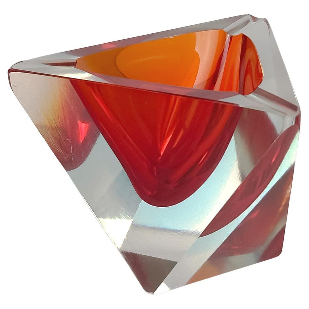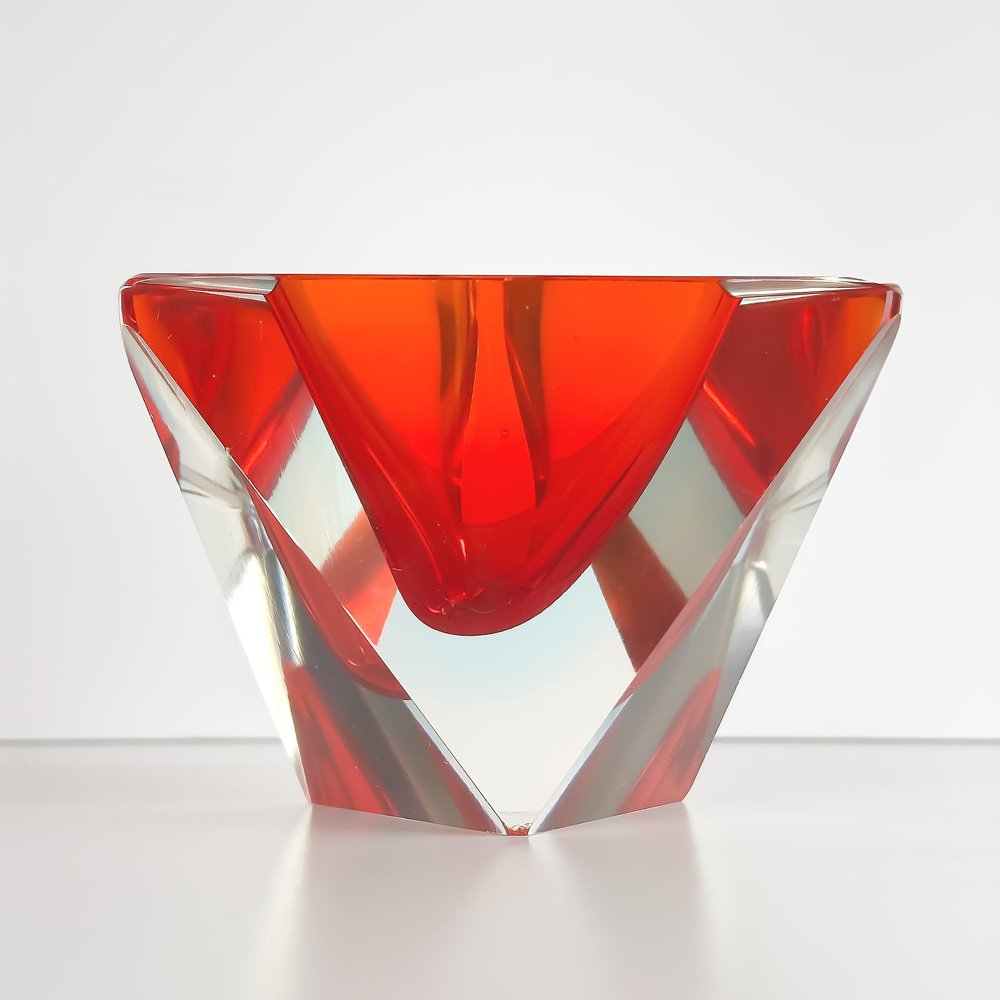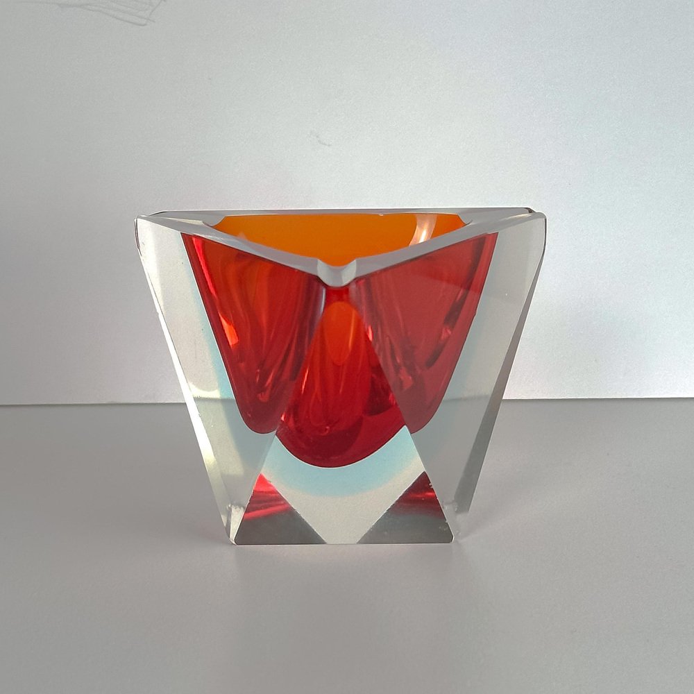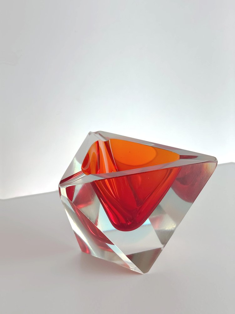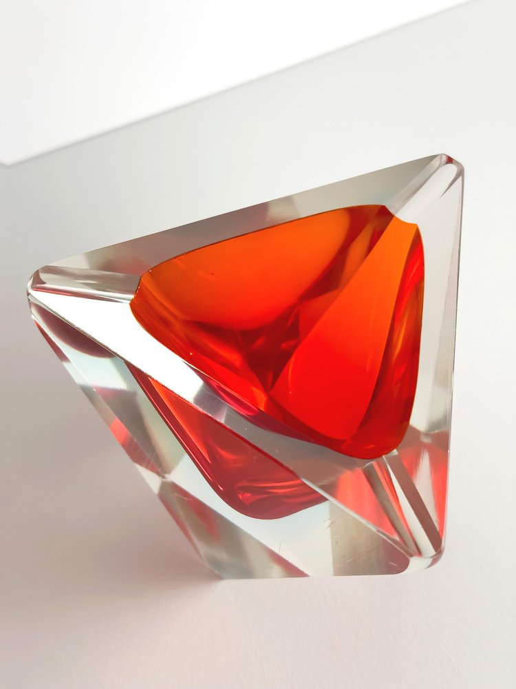 A Murano glass ashtray attributed to Flavio Poli for Seguso, handcrafted in Italy during the 1970s. Produced using the sommerso ("submerged") technique, layers of vibrant red and soft sky blue glass are encased within clear Murano crystal, creating striking internal colour depth. The piece is meticulously formed into a sharply faceted triangular shape, with each of the three points channelled to hold a cigarette. The sharply polished 45-degree angles of the base resemble a finely cut gemstone, with each facet catching light and emphasizing the bold interplay of colour within the glass. Measuring 10 cm deep, 12 cm wide, and 8 cm tall, the ashtray remains in good vintage condition. Minor chips and light surface scratches are present on the faceted edges and base, consistent with its age and delicate form. A refined example of mid-century Murano craftsmanship, showcasing Flavio Poli’s mastery of colour layering and cold working.