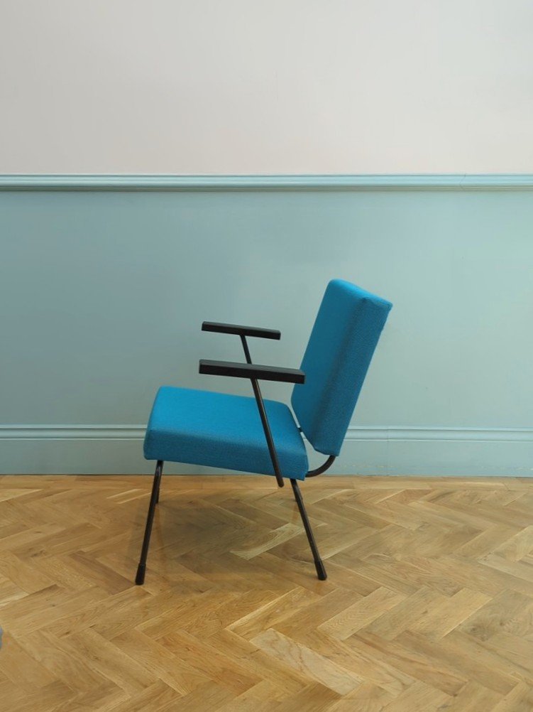 Selon Rietveld, le design doit être “bien tourné, solide, pratique, et abordable”. Cette approche rationnelle est en accord avec les conditions de l’après-guerre aux Pays-Bas, et les principes fondateurs de la Stichting Goed Wonen, dédiée à la reconstruction économique et à l’amélioration des conditions de vie par de beaux designs. Tout au long de sa carrière, Rietveld a produit des assises, des tables, des meubles de rangement, des systèmes d’étagères, et des luminaires fonctionnels, attractifs et qui ne prennent pas de place. Ses matériaux de prédilection sont l’acier et le contrepaqué. A côté de son travail prolifique pour Gispen, Rietveld conçoit pour d’autres fabricants néerlandais comme Ahrend De Cirkel, Auping, et Kembo, parmi d’autres.