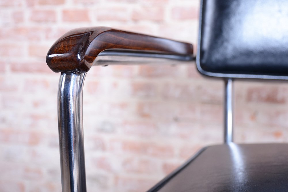 The armchair is crafted from tubular chrome-plated steel, which has been professionally cleaned and shines like new. It is equipped with a fully functional steel mechanism with screw height adjustment, ensuring ergonomics and comfort. The beech armrests with a new polish add a warm element to the chair.