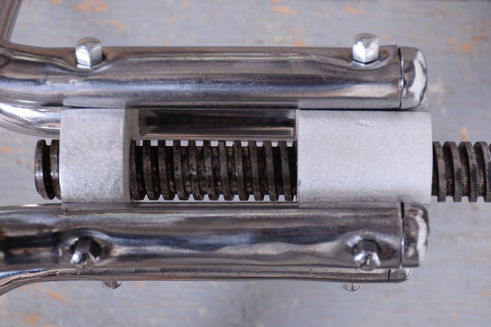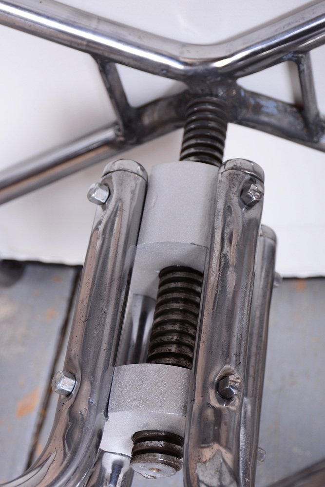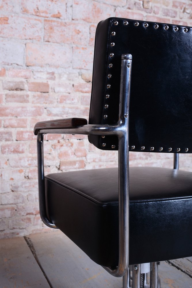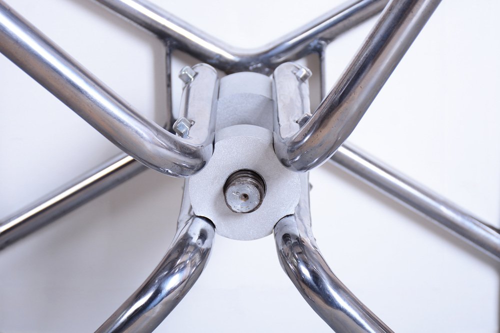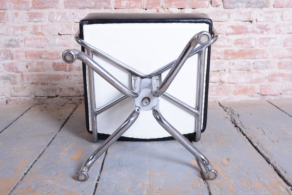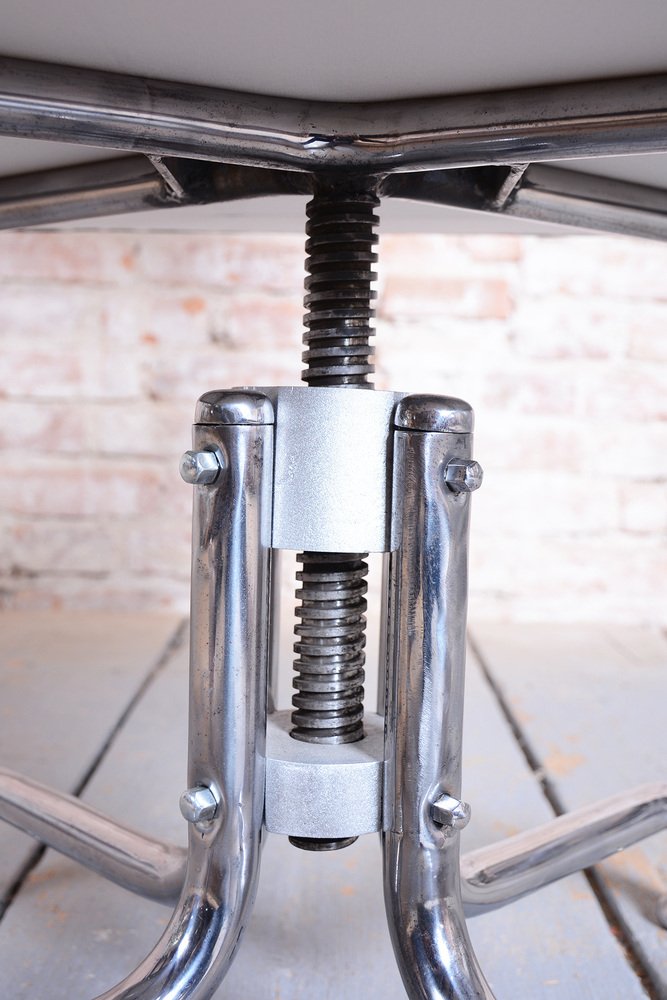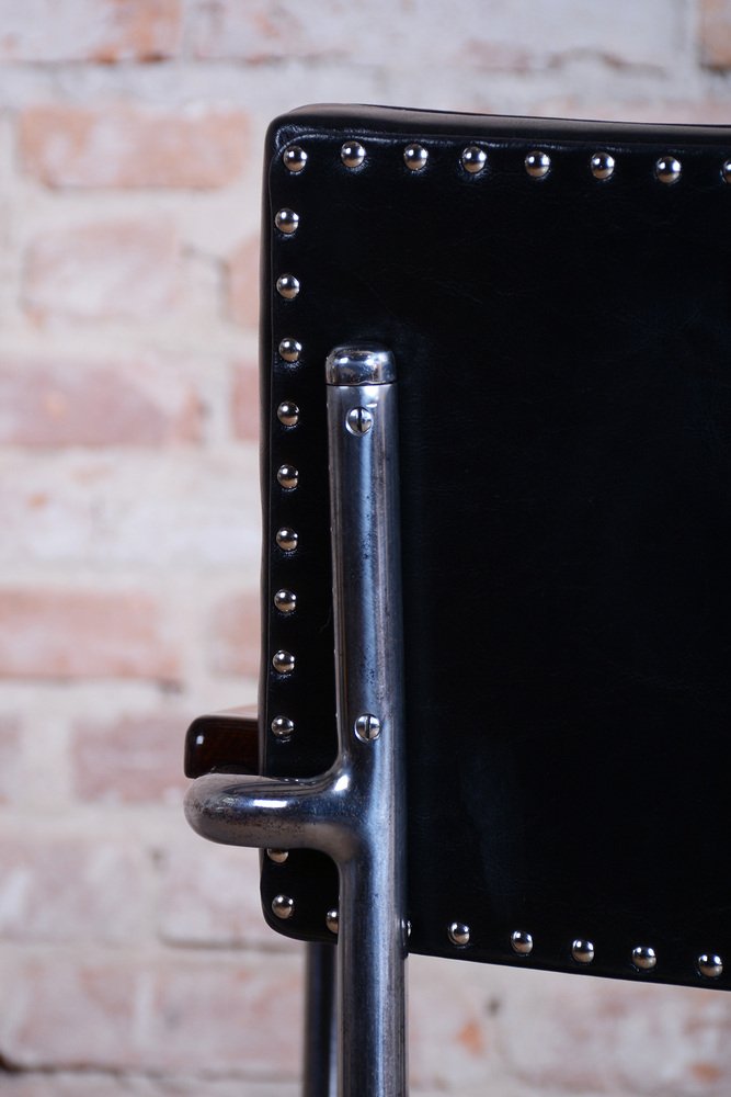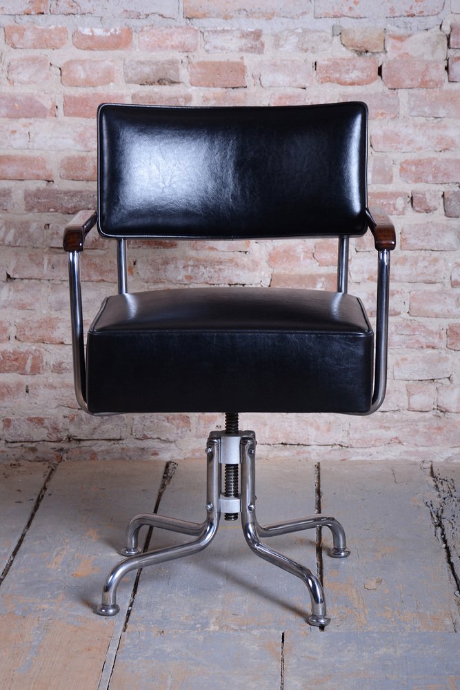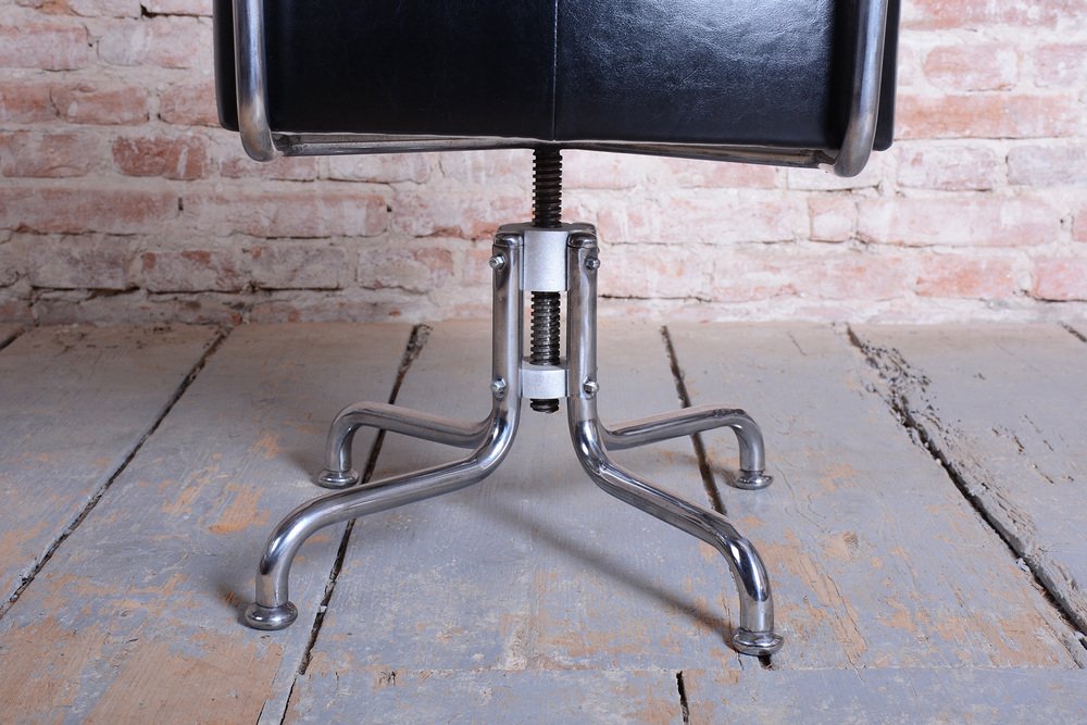 Le fauteuil est fabriqué en acier tubulaire chromé, qui a été nettoyé par des professionnels et qui brille comme s'il était neuf. Il est équipé d'un mécanisme en acier entièrement fonctionnel avec réglage de la hauteur par vis, ce qui garantit l'ergonomie et le confort. Les accoudoirs en hêtre avec un nouveau poli ajoutent un élément chaleureux à la chaise.