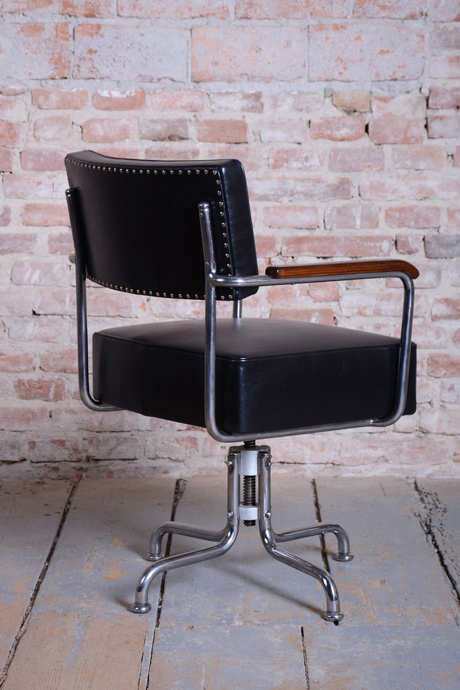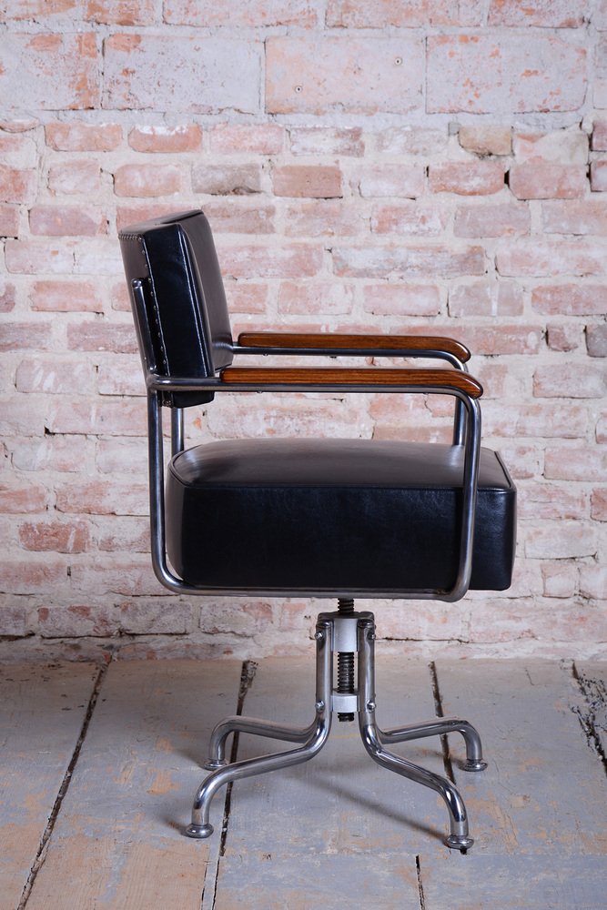 This unique Bauhaus swivel armchair originates from Czechoslovakia from the 1930s and was manufactured by the renowned Robert Slezák Factories (Závody Roberta Slezáka). Its design follows the iconic Model K 24 and represents the peak of functionalist furniture for work environments.