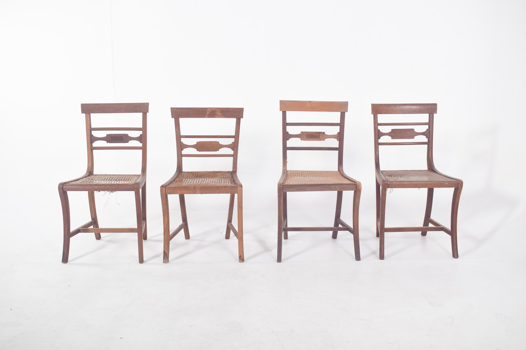 Four chairs with straw backs. Handmade, with lines inspired by the Empire style, characterised by the sobriety and elegance of the shapes. The backs have horizontal crossbars, with the centre one cut out and decorated with a simple geometric motif. The seats are made of plaited straw, a traditional technique that guarantees lightness and ventilation, although they show some wear and need restoration. The front legs are straight, while the back legs are slightly curved, contributing to the aesthetic balance of the piece. The chairs are joined by crossbars that reinforce their structure and stability.