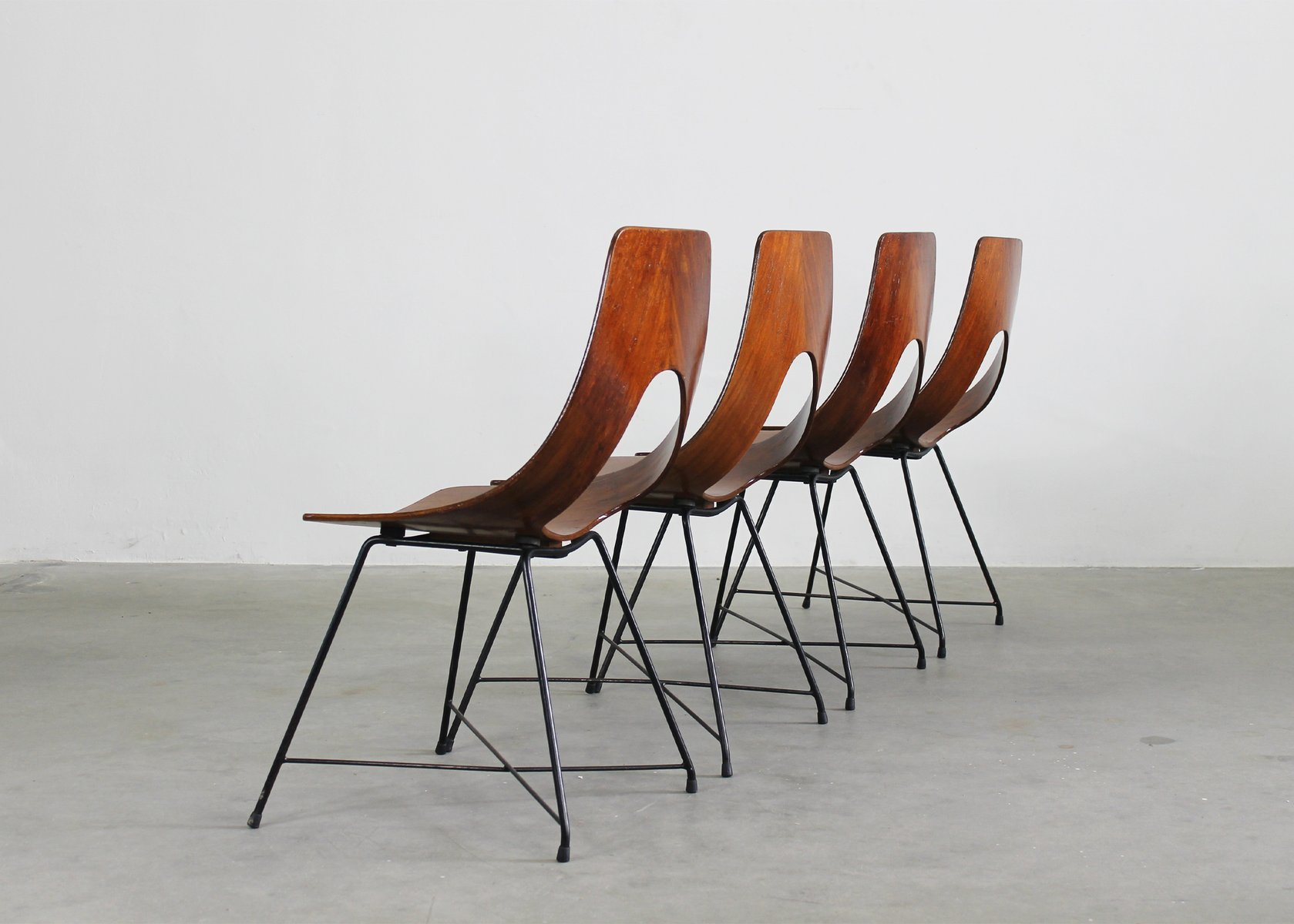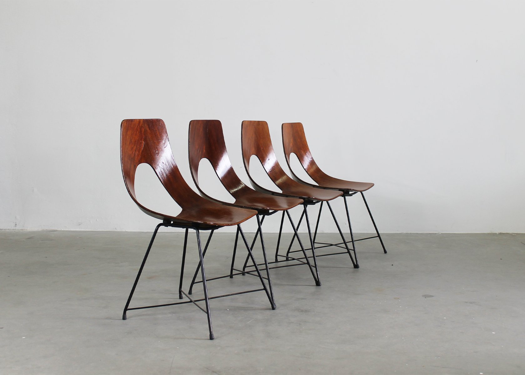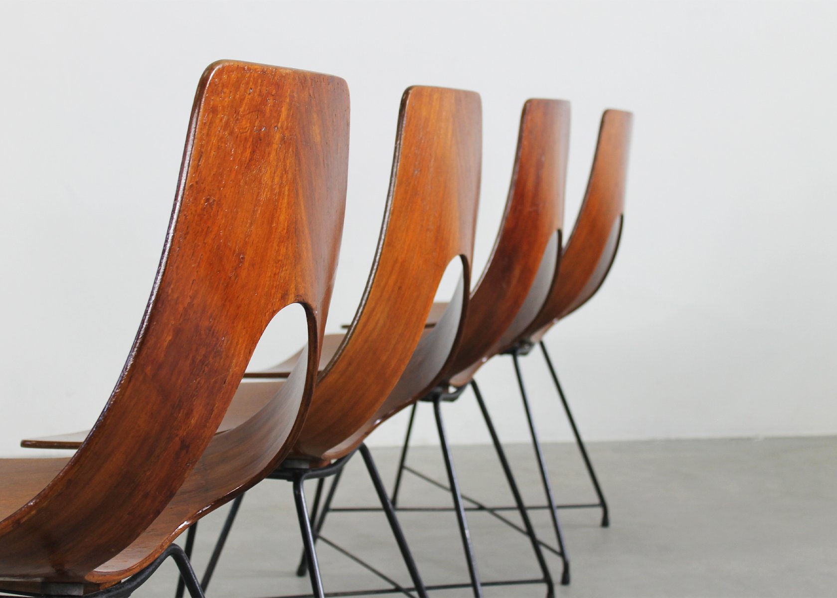 Set of four dining chairs model Ariston with structure in curved plywood and black lacquered metal legs.