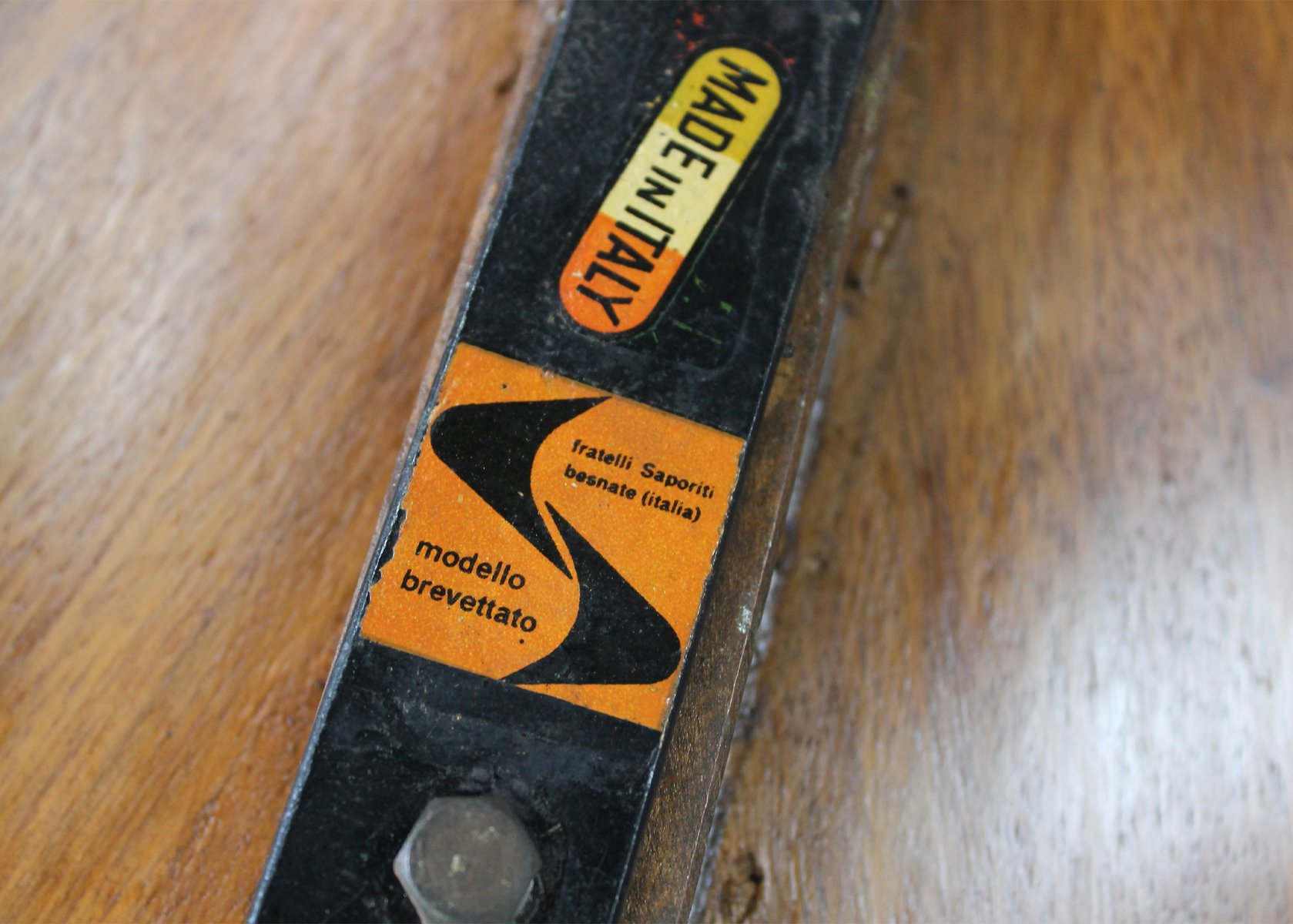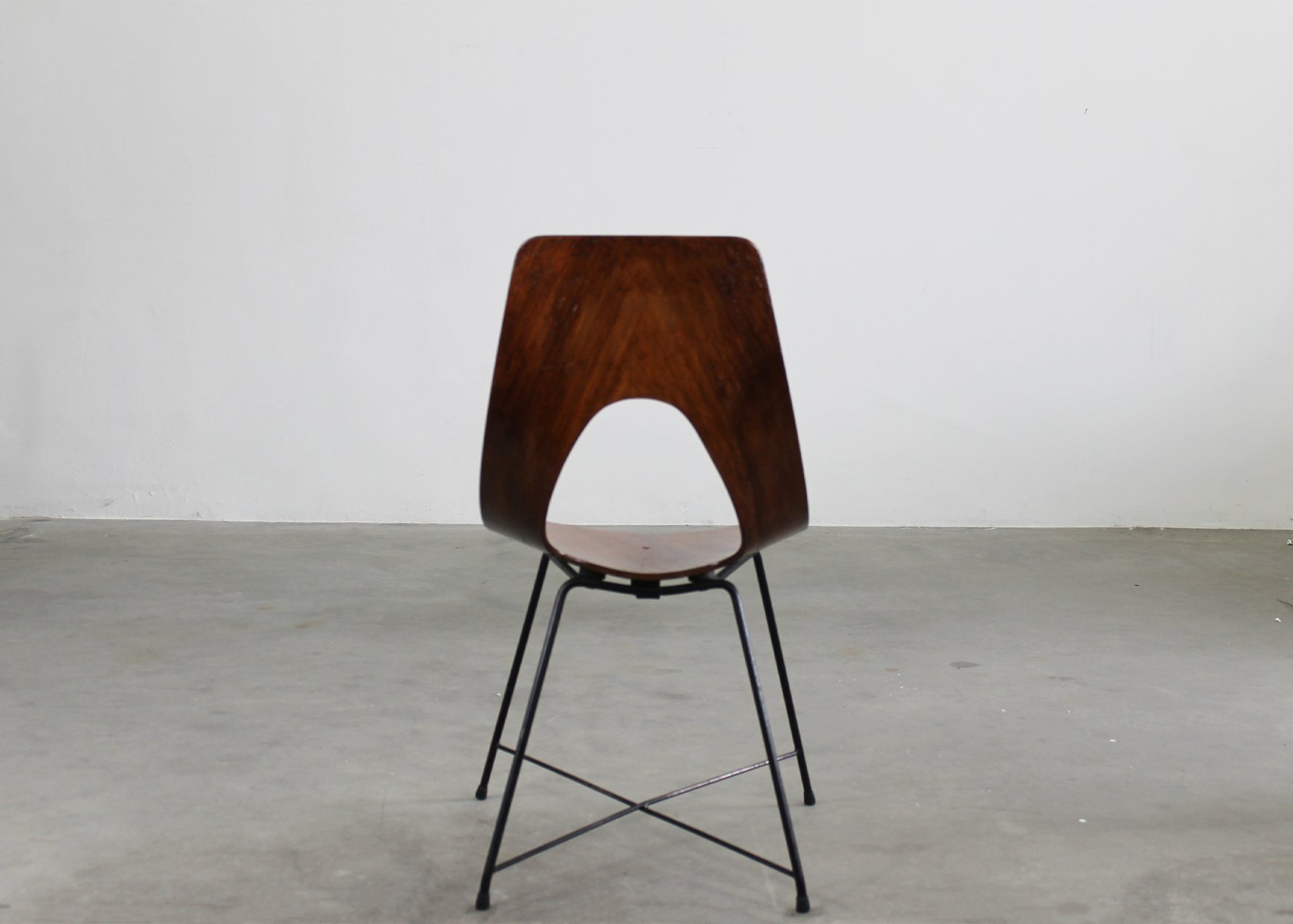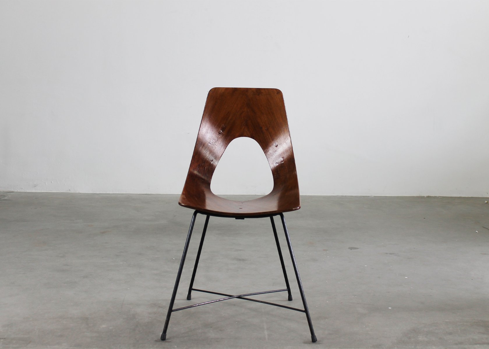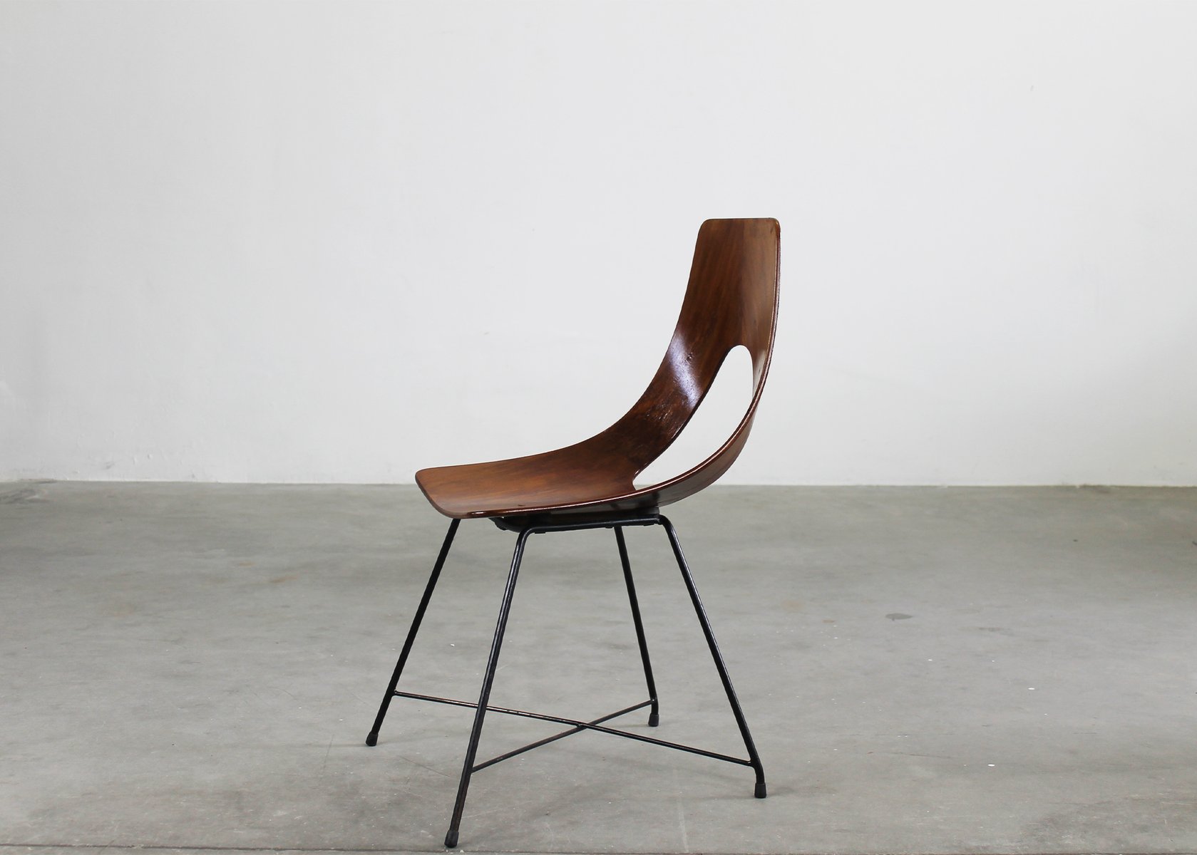 The Ariston chair was designed by Augusto Bozzi and manufactured by Saporiti during the 1950s (the manufacturer's label is visible under the chair structure).
