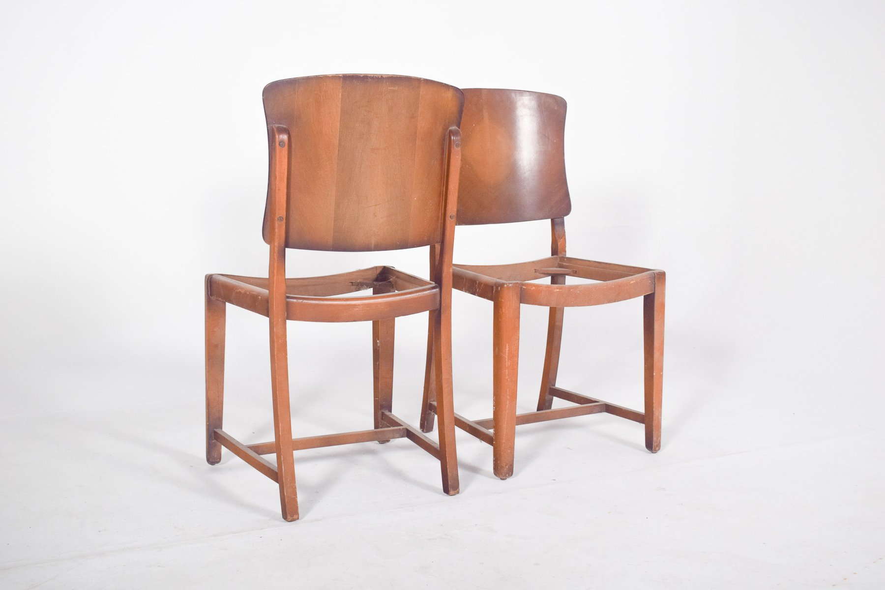 Paire de chaises, sans assise. Dossier ergonomique légèrement incurvé, réalisé en une seule pièce de bois moulé, avec un dessin en losange et une finition en vernis moyen qui met en évidence le motif de l'arbre. La base rectangulaire est constituée de pieds droits, légèrement inclinés pour assurer la stabilité, reliés par des renforts horizontaux latéraux et frontaux qui renforcent la structure. Les traverses inférieures indiquent la possibilité d'une utilisation dans des environnements nécessitant une solidité structurelle, tels que les salles à manger ou les institutions.