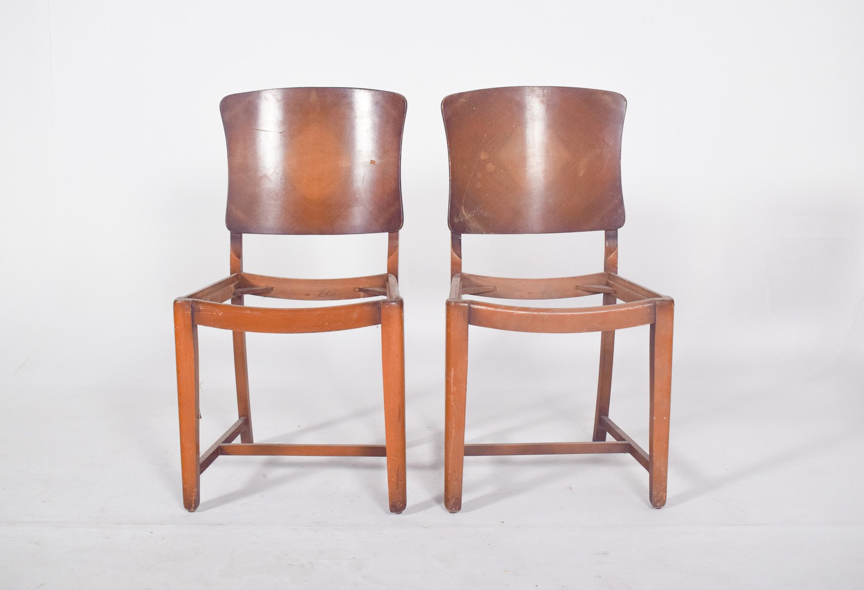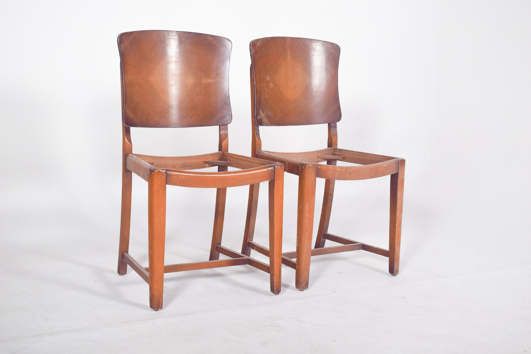 Pair of chairs, without seats. Slightly curved ergonomic backrests, in a single piece of moulded wood, with a diamond design and a medium varnish finish that highlights the pattern of the shaft. The rectangular base is made up of straight legs, slightly inclined for stability, joined by horizontal side and front braces that reinforce the structure. The lower crossbars indicate the possibility of use in environments requiring structural strength, such as dining rooms or institutional use.