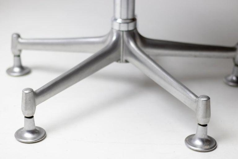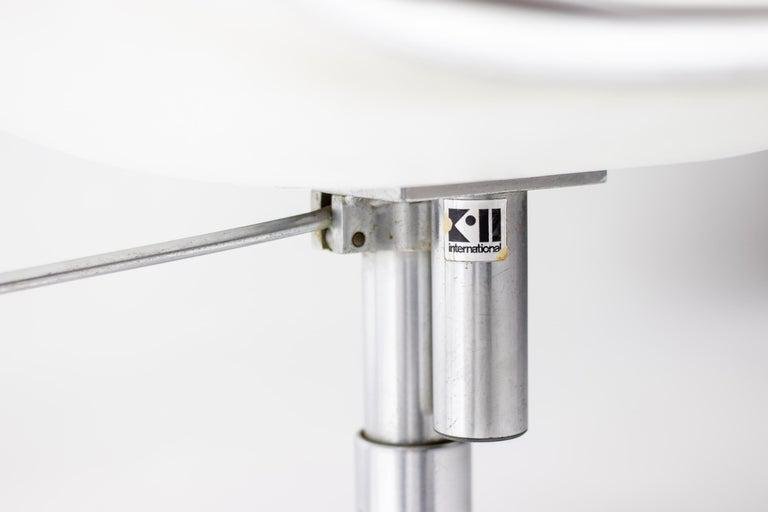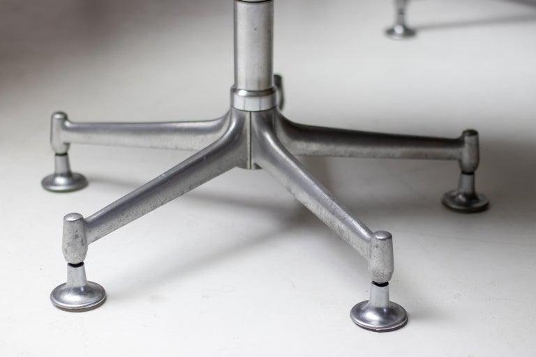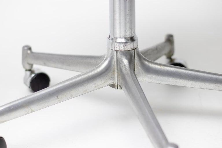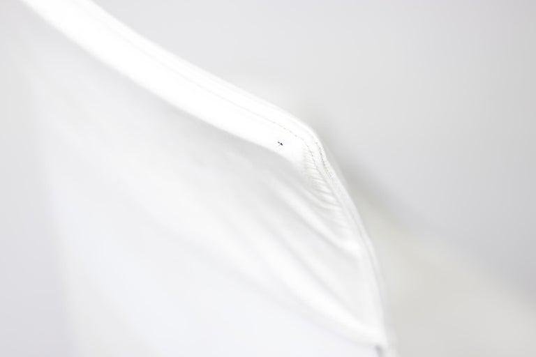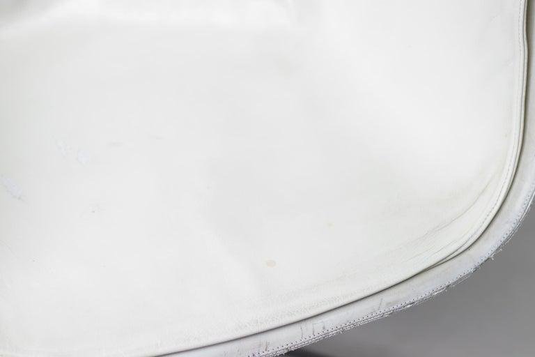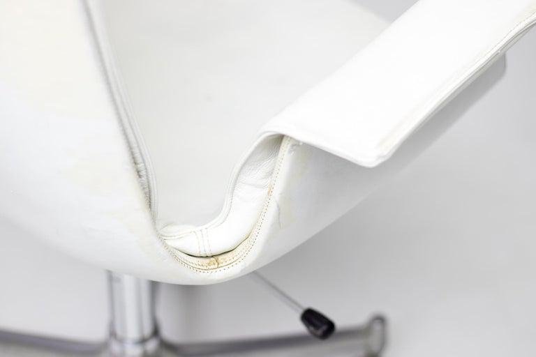 Two chairs are the low-back version and one chair the high back version, Model FK 6727, leather ‘Bird’ Chair, also commonly referred to as the ‘Tulip’ chair, designed by Preben Fabricius and Jørgen Kastholm, manufactured in Germany by Alfred Kill International during the 1960s. All 3 chairs have the very rare and desirable option of tilt, swivel and height adjustability. The high chair is equipped with castors, the 2 low chairs have glides. They are built from a fiberglass shell which is encased with original bright white leather upholstery that features a subtle admirable patina. These traces of age and use bring more vibrancy to the chairs This set of ‘Bird’ chairs would be a perfect addition to any collector or design lovers interior concept.