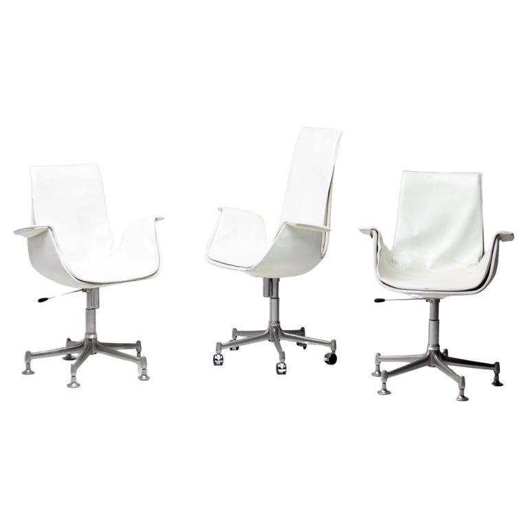 Deux chaises sont la version à dossier bas et une chaise la version à dossier haut, modèle FK 6727, chaise "Bird" en cuir, aussi communément appelée chaise "Tulip", conçue par Preben Fabricius et Jørgen Kastholm, fabriquée en Allemagne par Alfred Kill International au cours des années 1960. Les trois chaises sont dotées de l'option très rare et souhaitable de réglage de l'inclinaison, du pivotement et de la hauteur. La chaise haute est équipée de roulettes, les deux chaises basses de patins. Elles sont construites à partir d'une coque en fibre de verre qui est recouverte d'un revêtement en cuir blanc brillant d'origine qui présente une patine subtile et admirable. Ces traces d'âge et d'utilisation donnent plus d'éclat aux chaises. Cet ensemble de chaises 'Bird' serait un complément parfait pour tout collectionneur ou amateur de design.