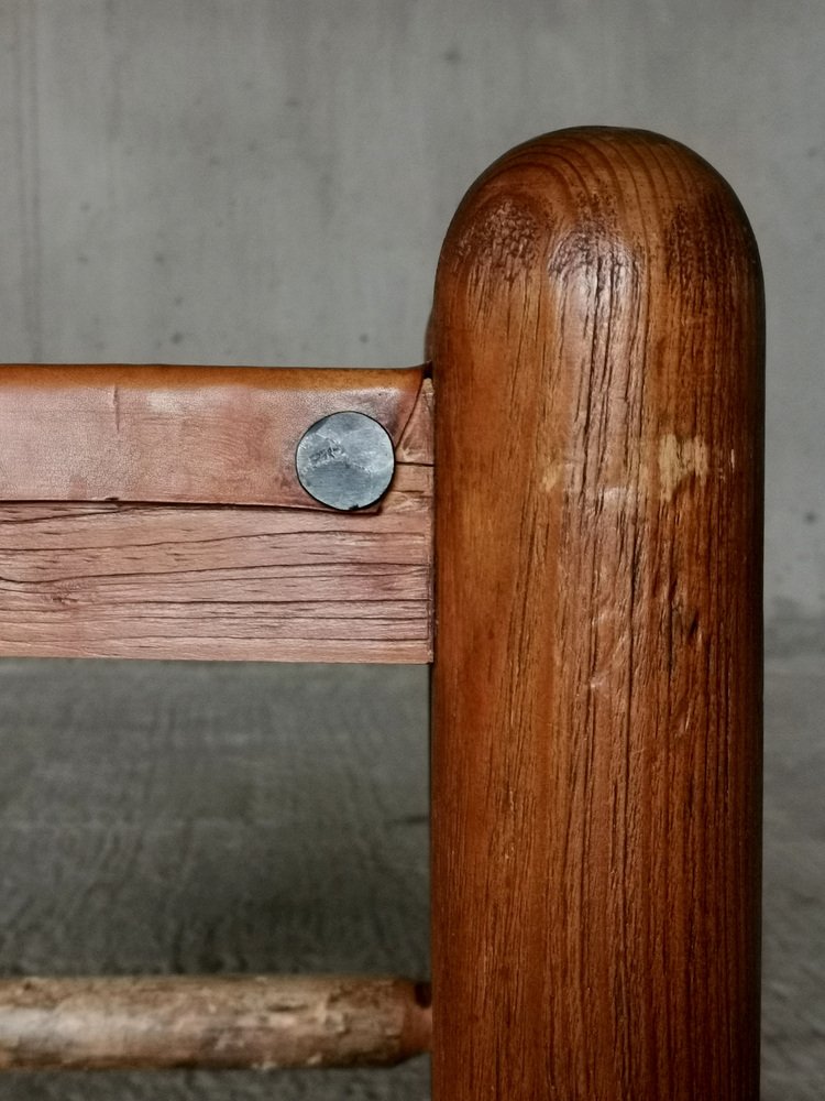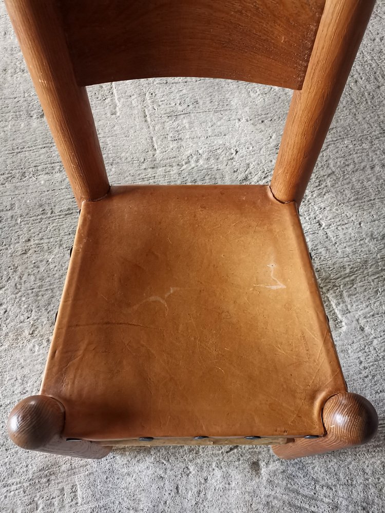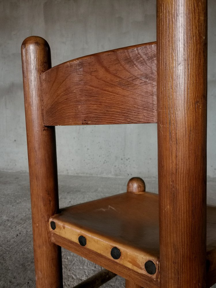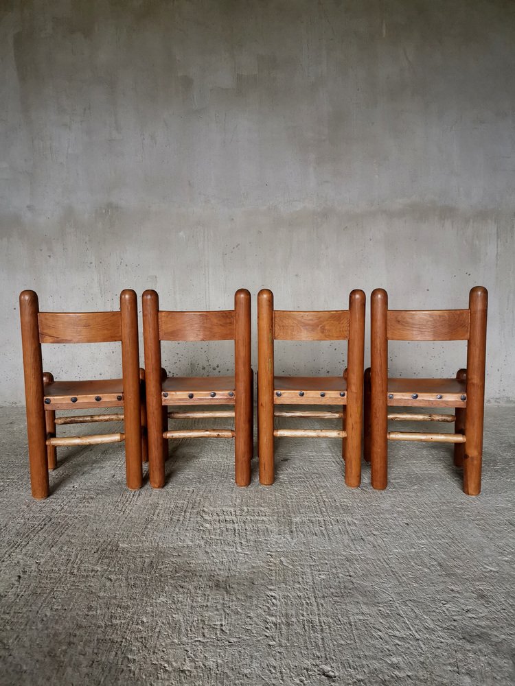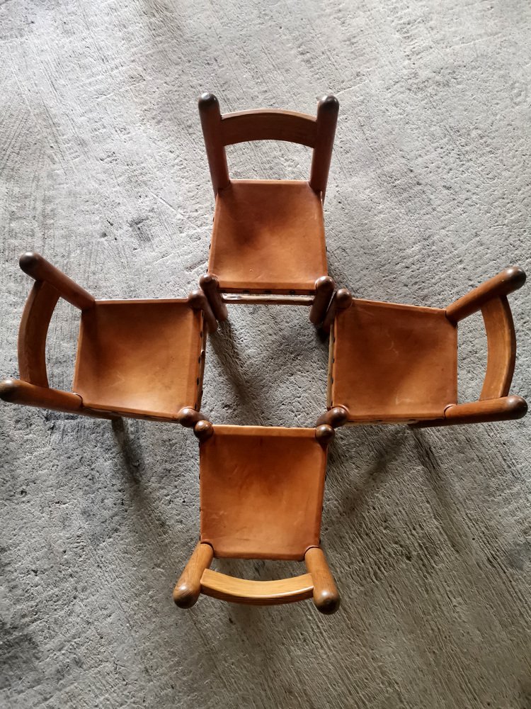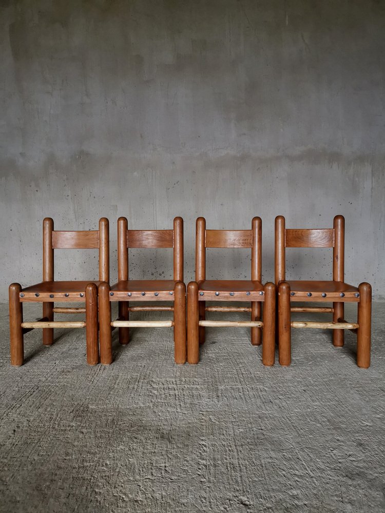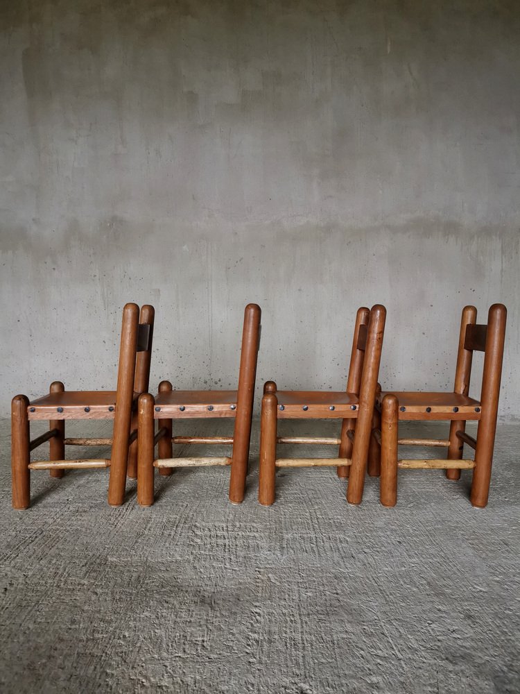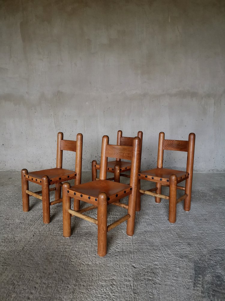 Chaises de Salle à Manger Brutalistes et Sculpturales en Chêne et Cuir, France, 1960s, Set de 4