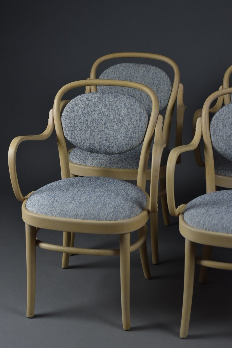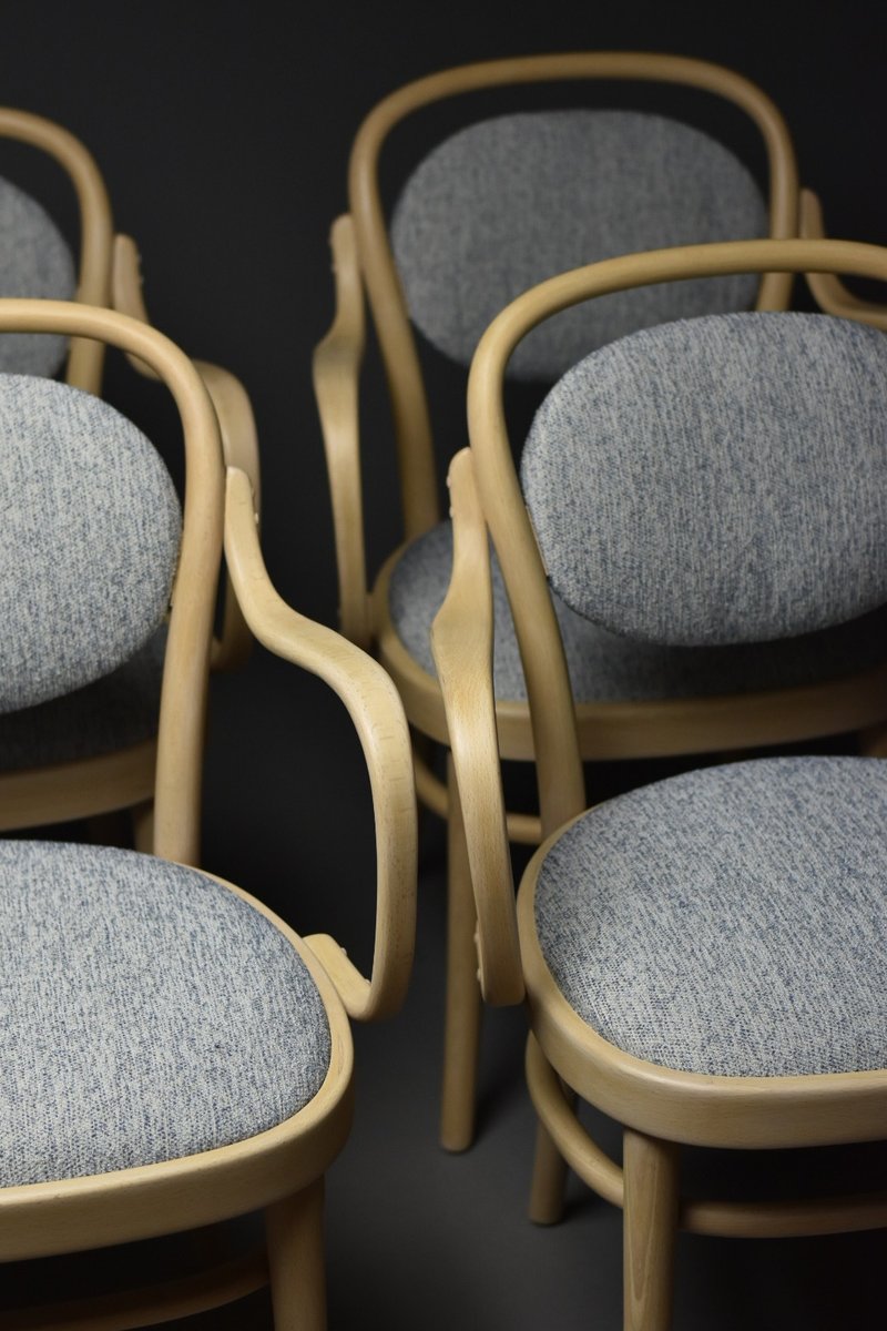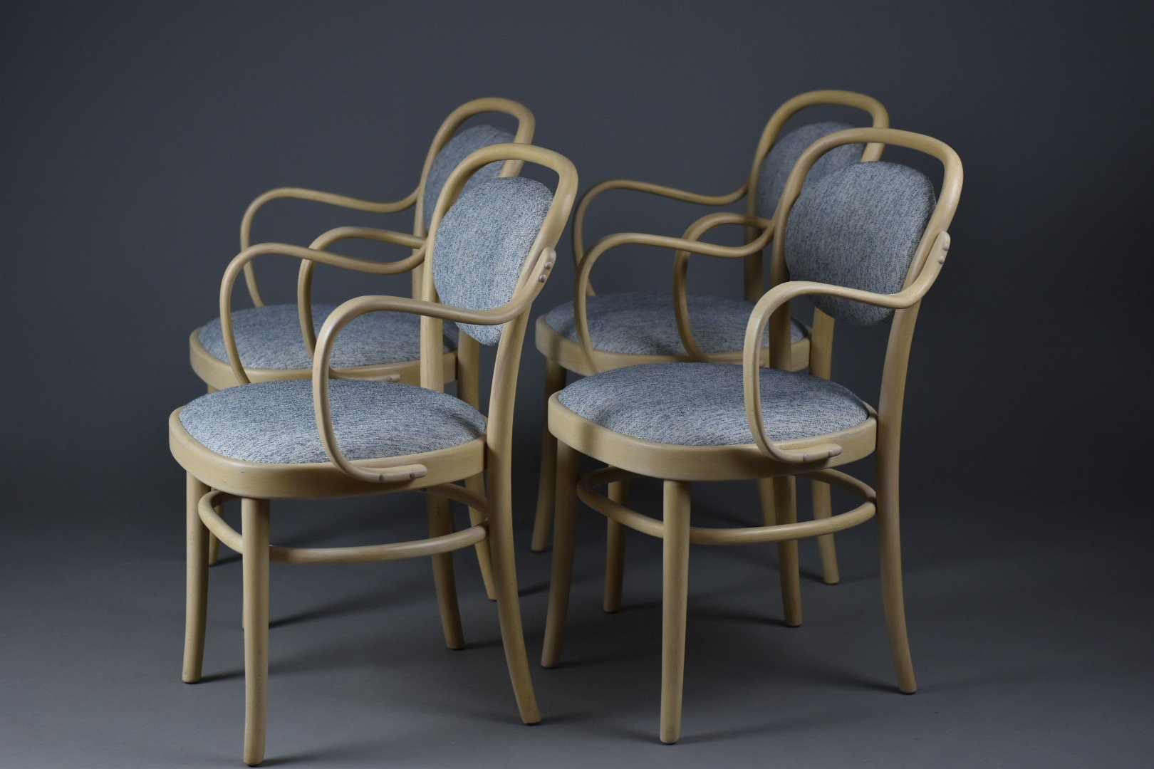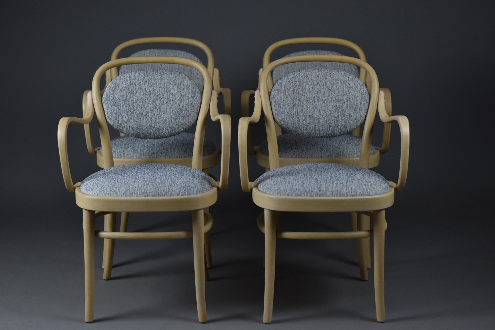 Seats and backrests reupholstered with a high-quality melange wool fabric in soft blue (from a premium European supplier)
