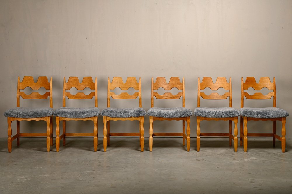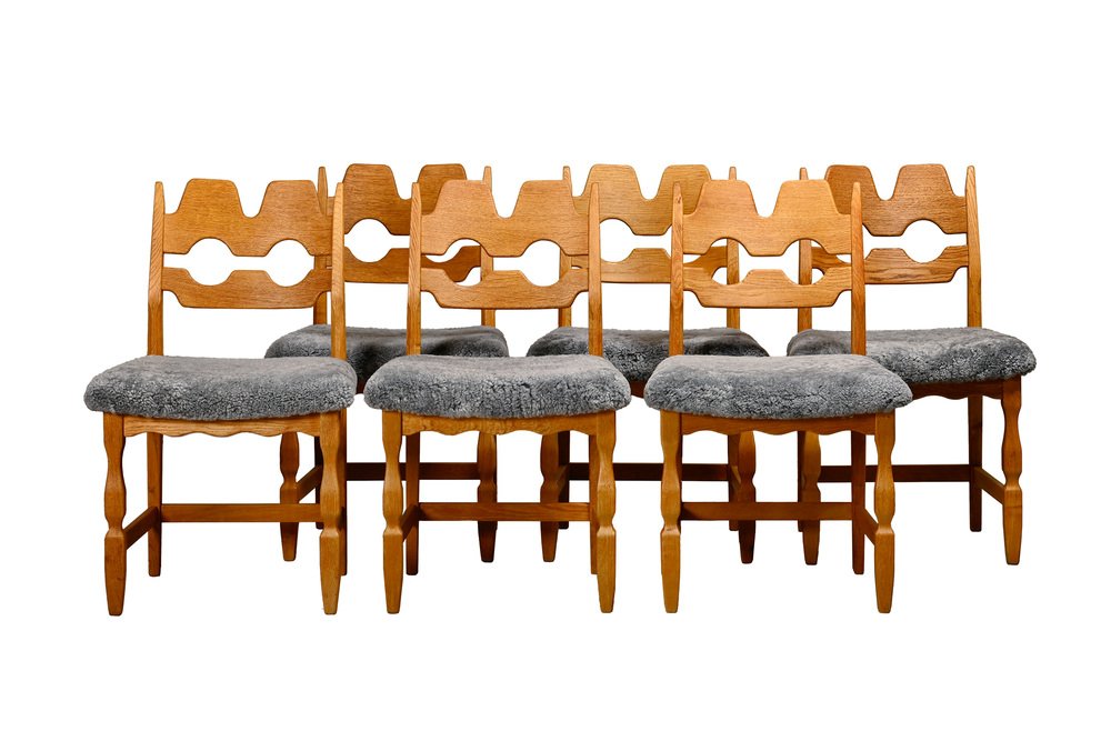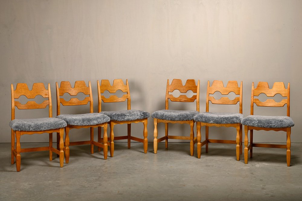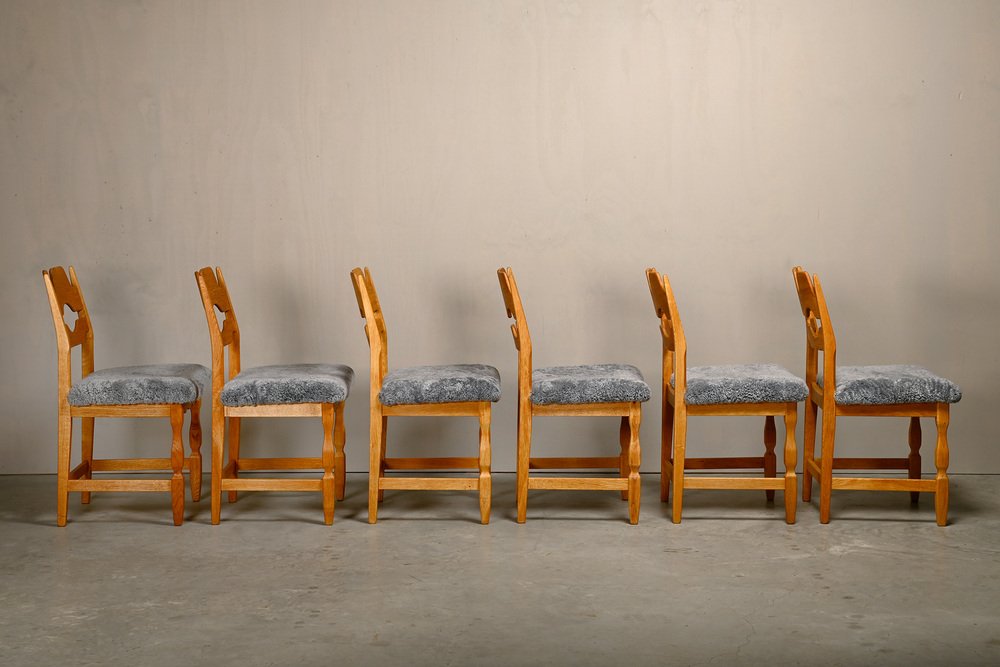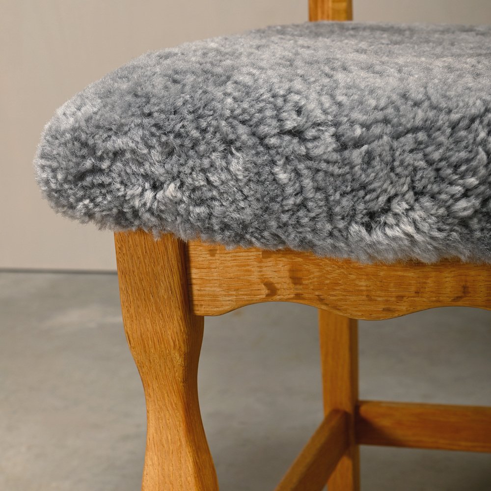 Chaises de Salle à Manger Razorblade en Laine d'Agneau et Chêne par Henning Kjærnulf, 1960s, Set de 6