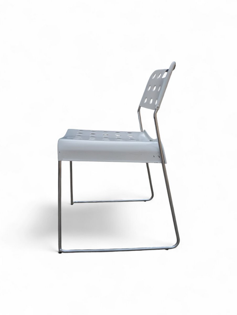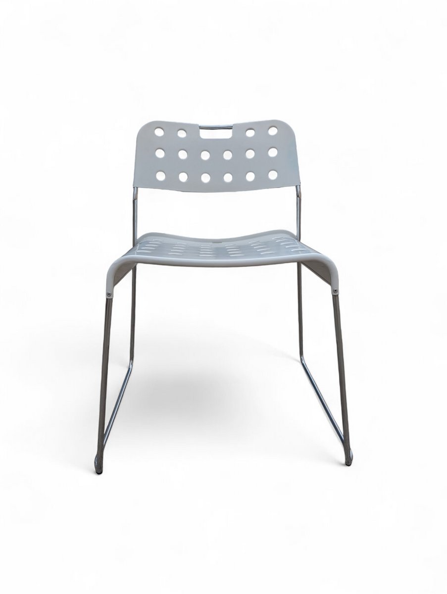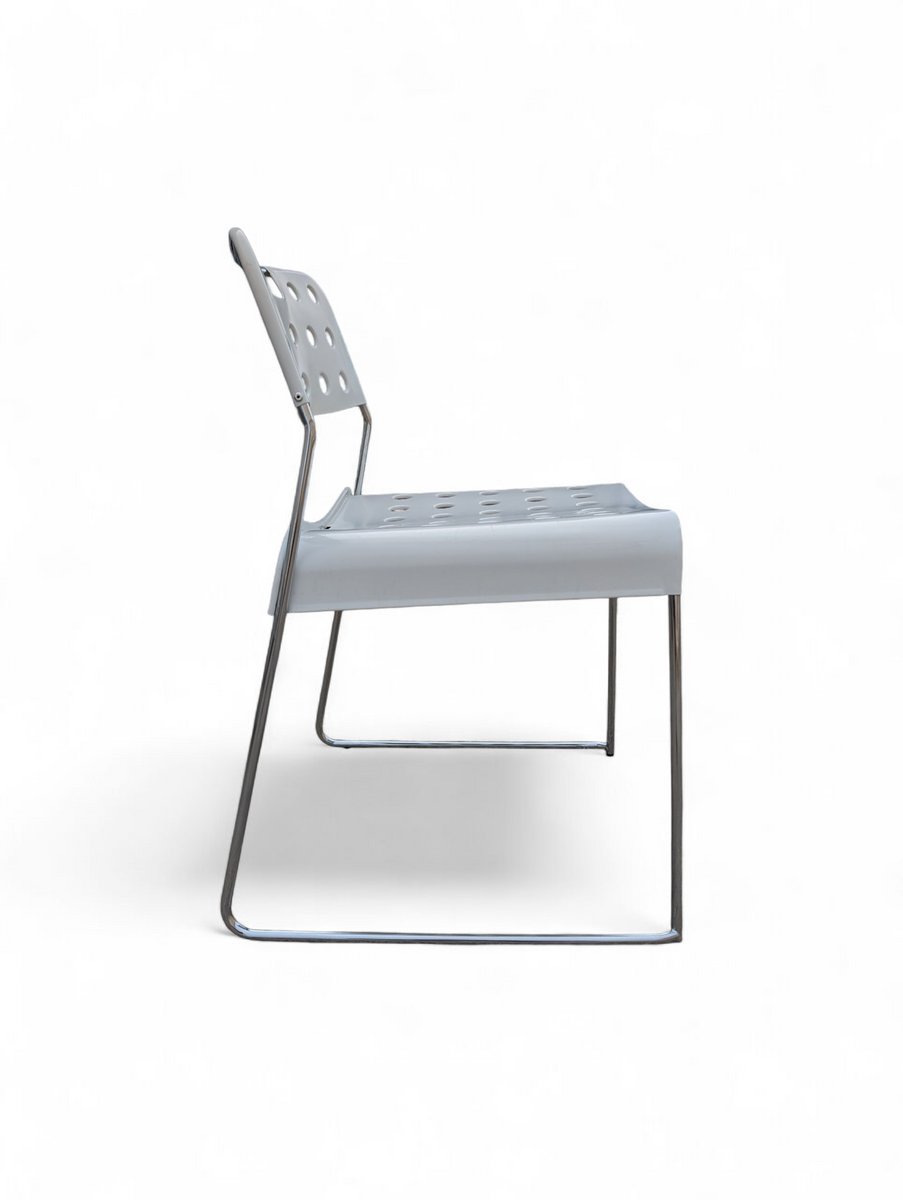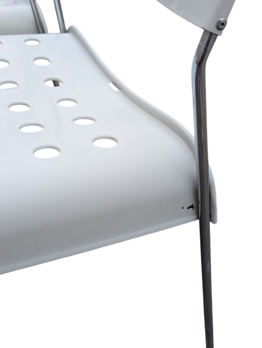 The chairs feature a single seat and backrest shell made of perforated sheet metal (likely light-painted steel), ensuring lightness and a distinctive minimalist aesthetic. The supporting frame is made of chromed metal tubing, designed for maximum stability and to allow for quick and easy stacking.