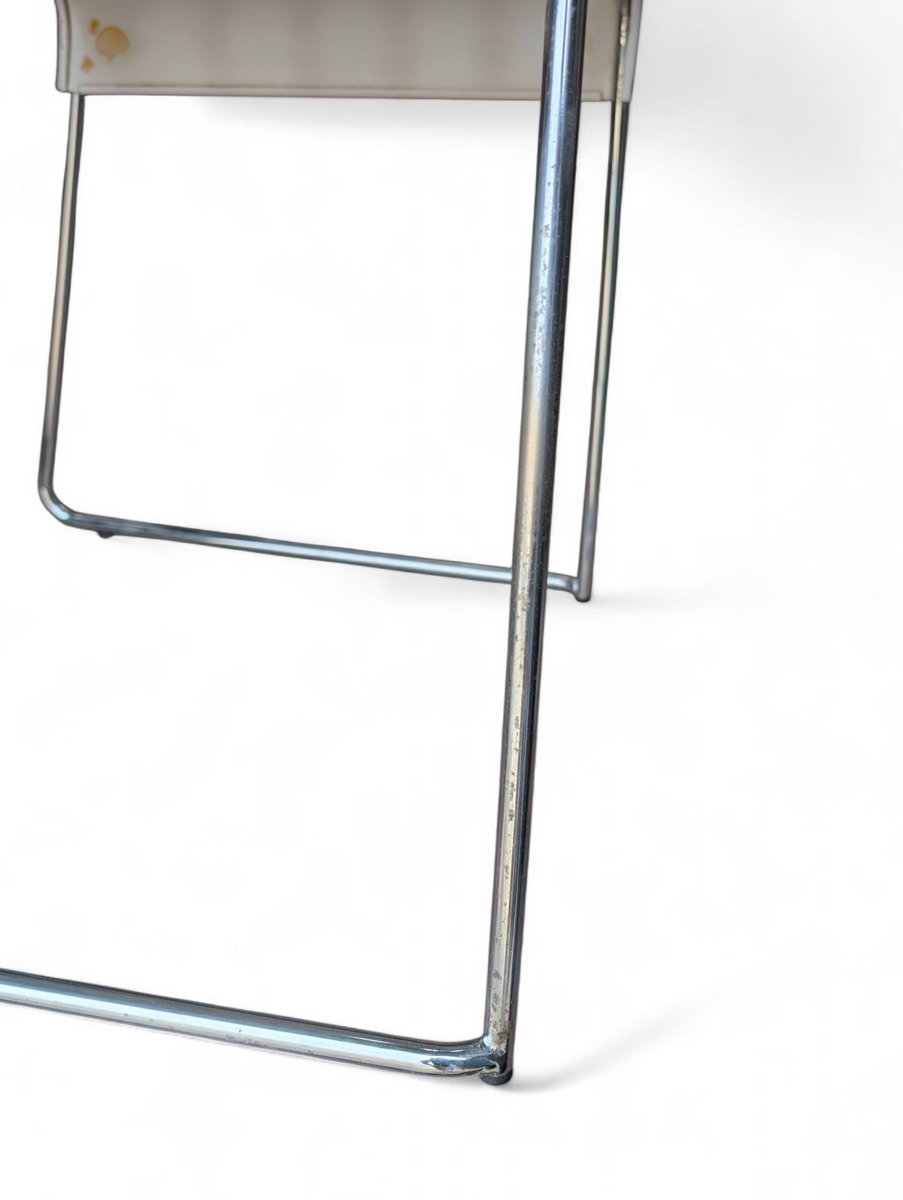 An example of Italian design (1970s/1980s), these chairs are ideal for environments requiring versatility, such as offices, conference rooms, or large dining rooms. They show signs of wear consistent with their age, including marks on the legs and chrome plating. The Bieffeplast authenticity mark is clearly visible.