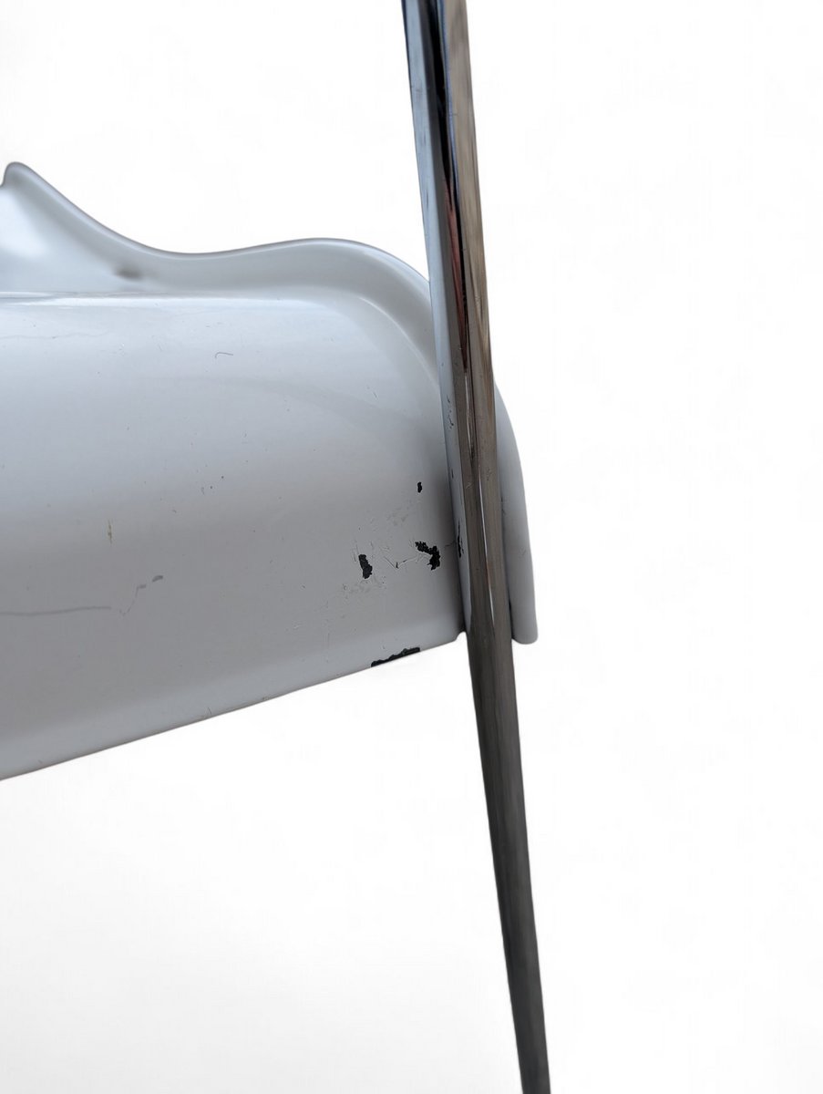Exemple de design italien (années 1970/1980), ces chaises sont idéales pour les environnements exigeant une certaine polyvalence, tels que les bureaux, les salles de conférence ou les grandes salles à manger. Elles présentent des signes d'usure correspondant à leur âge, notamment des marques sur les pieds et le chromage. La marque d'authenticité Bieffeplast est clairement visible.