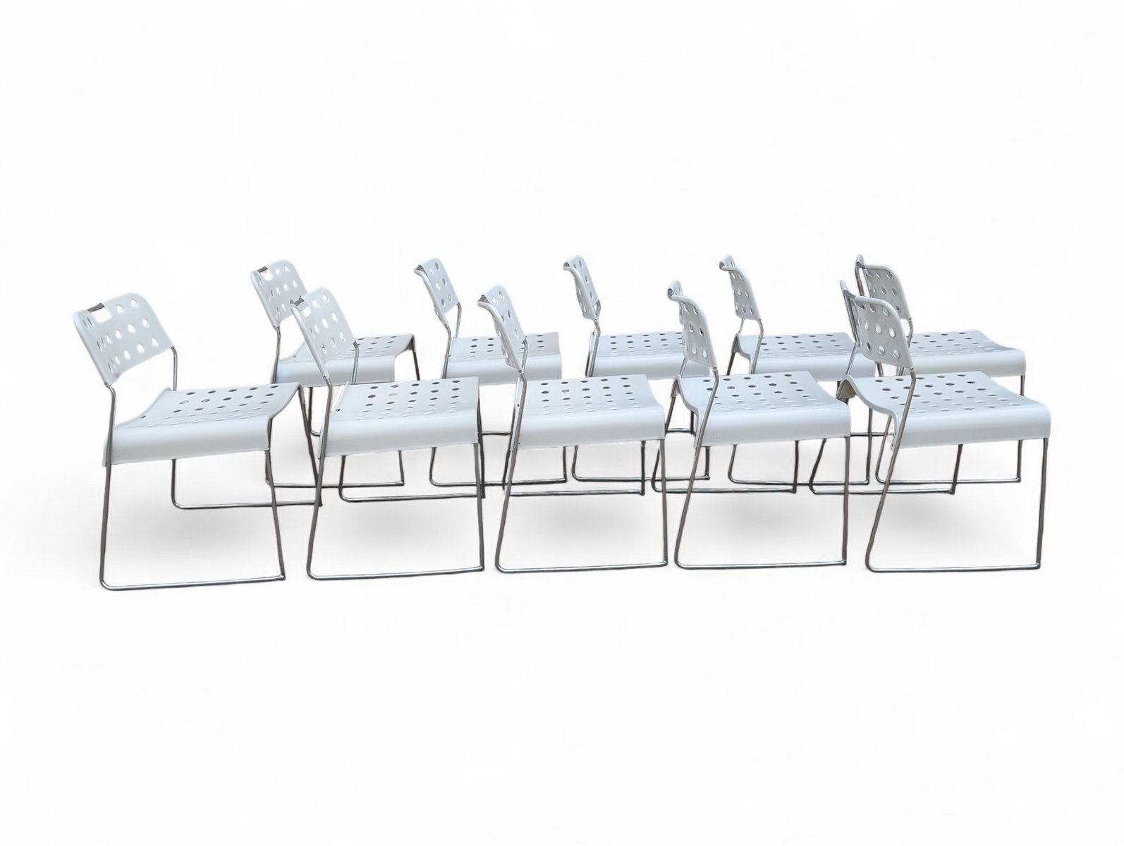 Un ensemble de chaises empilables au design industriel moderne et emblématique, produit par Bieffeplast (Padoue), Italie.